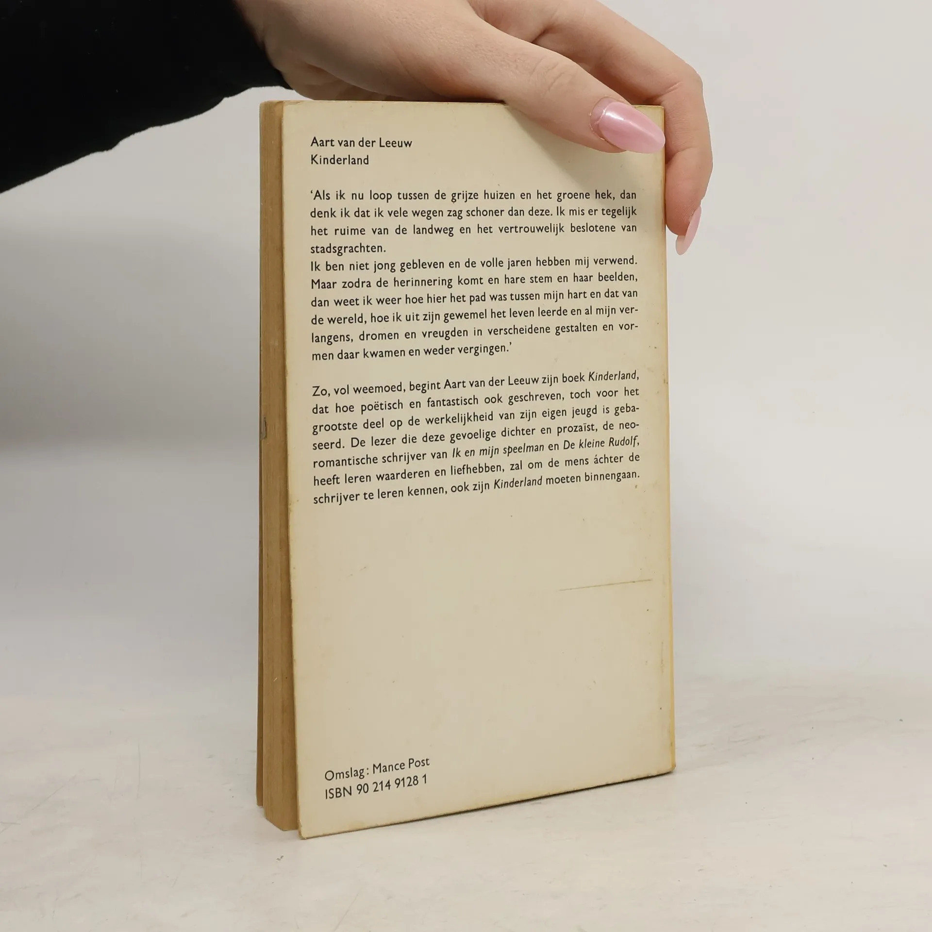'Als ik nu loop tussen de grijze huizen en het groene hek, dan denk ik dat ik vele wegen zag schoner dan deze. Ik mis er tegelijk het ruime van de landweg en het vertrouwelijk beslotene van stadsgrachten.Ik ben niet jong gebleven en de volle jaren hebben mij verwend. Maar zodara de herinnering komt en hare stem en haar beelden, dan weet ik weer hoe hier het pad was tussen mijn hart en dat van de wereld, hoe ik uit zijn gewemel het leven leerde en al mijn verlangens, dromen en vreugden in verscheidene gestalten en vormen daar kwamen en weder vergingen.'Zo, vol weemoed, begint Aart van der Leeuw zijn boek "Kinderland", dat hoe poëtisch en fantastisch ook geschreven, toch voor het grootste deel op de werkelijkheid van zijn eigen jeugd is gebaseerd. De lezer die deze gevoelige dichter en prozaïst, de neoromantische schrijver van "Ik en mijn speelman" en "De kleine Rudolf", heeft leren waarderen en liefhebben, zal om de mens áchter de schrijver te leren kennen, ook zijn "Kinderland" moeten binnengaan.