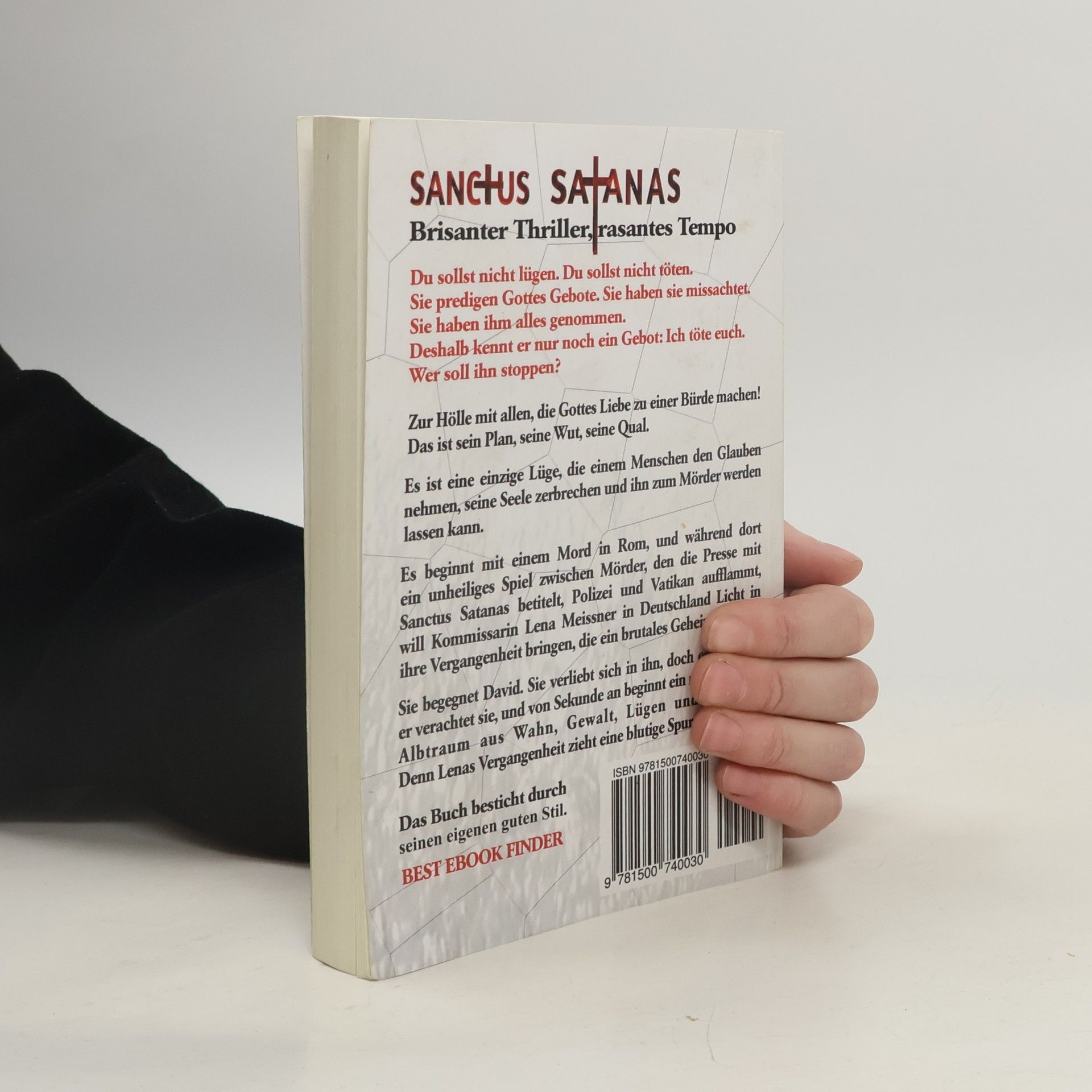 SANCTUS SATANAS - Das 5. GebotBrisanter Thriller, rasantes Tempo - Langeweile war gestern.Du sollst nicht lügen. Du sollst nicht töten.Sie predigen Gottes Gebote. Sie haben sie missachtet.Sie haben ihm alles genommen.Deshalb kennt er nur noch ein Ich töte euch.Wer soll ihn stoppen?KURZINHALTZur Hölle mit allen, die Gottes Liebe zu einer Bürde machen!Das ist sein Plan, seine Wut, seine Qual.Es ist eine einzige Lüge, die einem Menschen den Glauben nehmen, seineSeele zerbrechen und ihn zum Mörder werden lassen kann.Es beginnt mit einem Mord in Rom, und während dort ein unheiliges Spielzwischen dem Mörder, den die Presse mit Sanctus Satanas betitelt, Polizeiund Vatikan aufflammt, will Kommissarin Lena Meissner in Deutschland Lichtin ihre Vergangenheit bringen, die ein brutales Geheimnis birgt.Sie begegnet David.Sie verliebt sich in ihn, doch er hasst sie, er verachtet sie, und von Sekundean beginnt ein Albtraum aus Wahn, Gewalt, Lügen und Intrigen.Denn Lenas Vergangenheit zieht eine blutige Spur nach Rom ...Beurteilung im Netz auf "xtme":Das liest sich griffig und erinnert mich auf den ersten Blick an denGroßmeister dieses Genres, Dan Brown.Was aber Brown nie geschafft Dorothé Kanders schreibt leidenschaftliche, sinnliche Szenen,und auch diese Stellen lesen sich gut.5 Sterne Top-Bewertung auf "bestebookfinder":Das Buch besticht durch seinen eigenen guten Stil.Die Handlung ist schlüssig aufgebaut und entwickelt eine angenehme Spannung.Seiten der 322Thriller von Dorothé Sanctus Satanas - Das 5. ThrillerEs wird Thriller