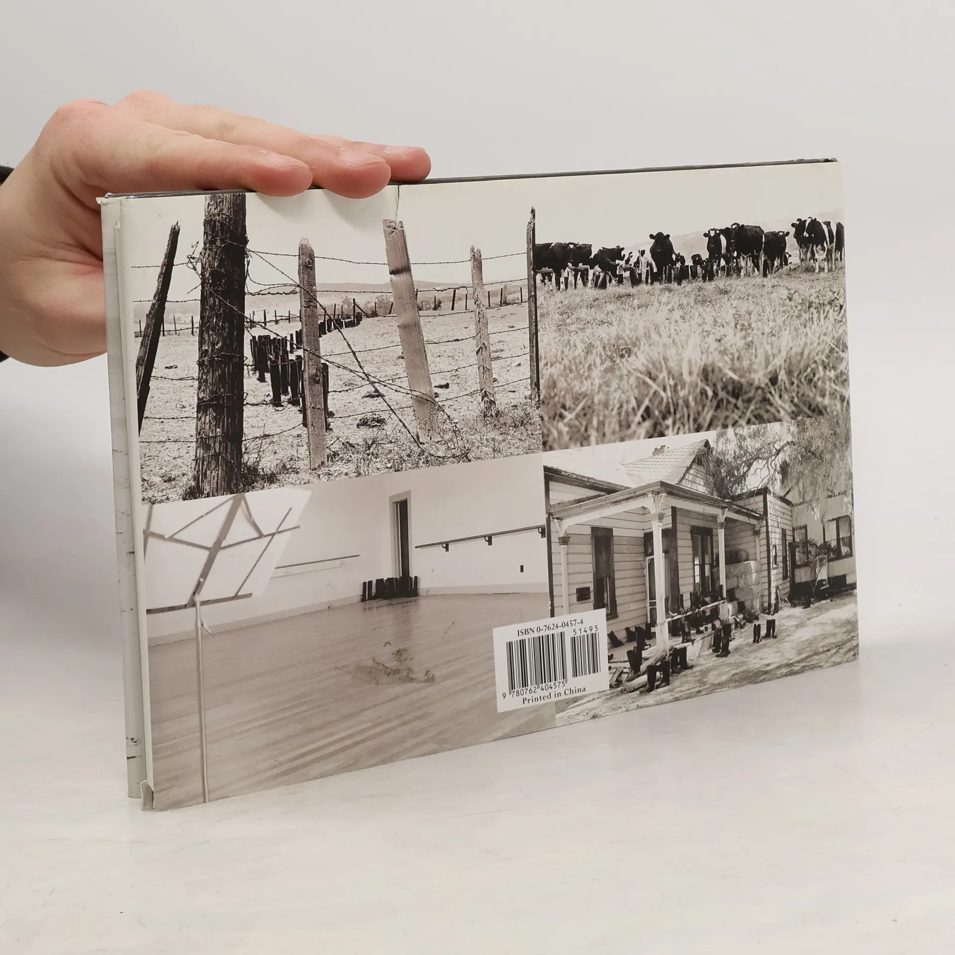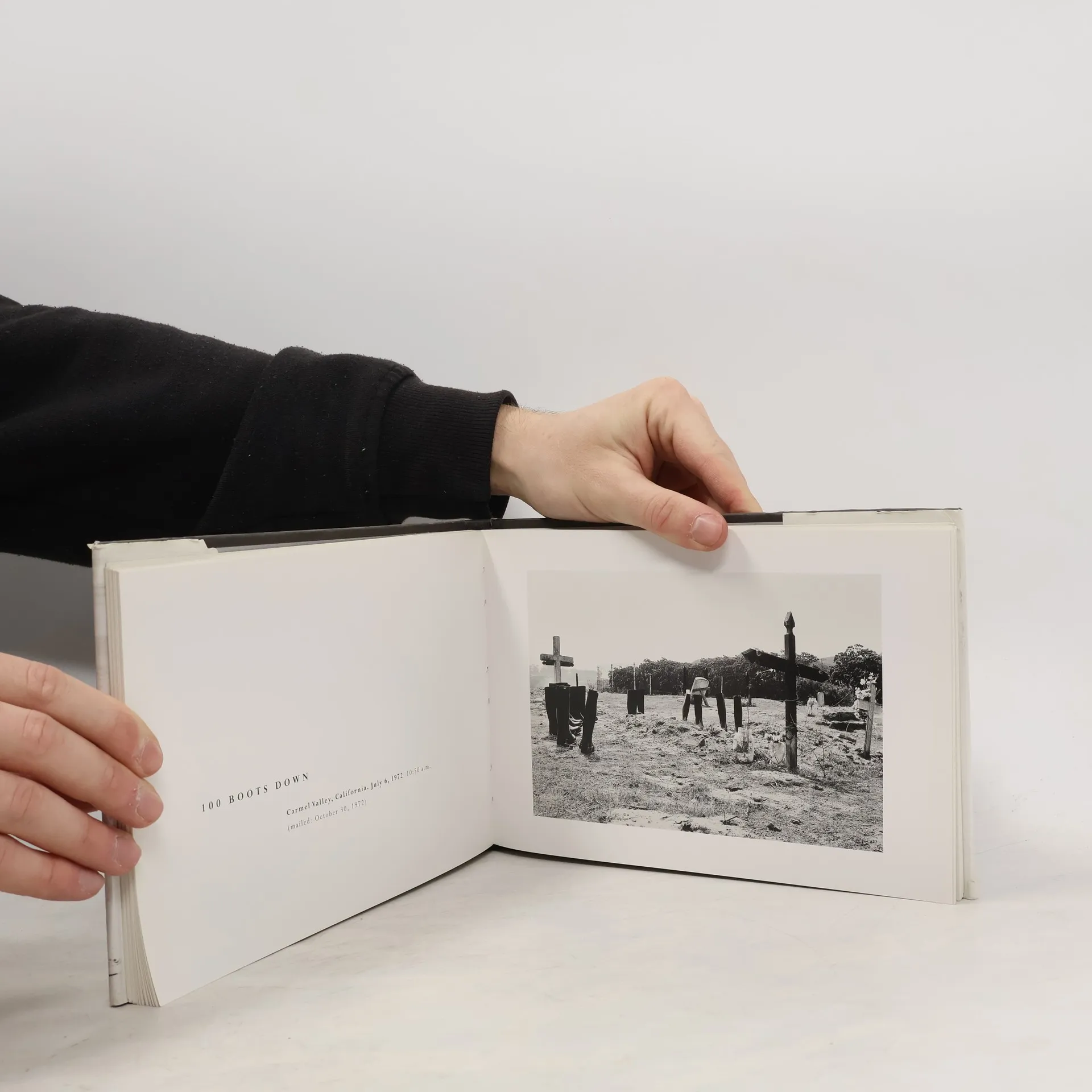 Shows postcard photographs of the artist's arrangements of one hundred boots in a variety of settings, including in rows outside a bank, at a drive-in, in a line along a sidewalk, and gathered around a campfire