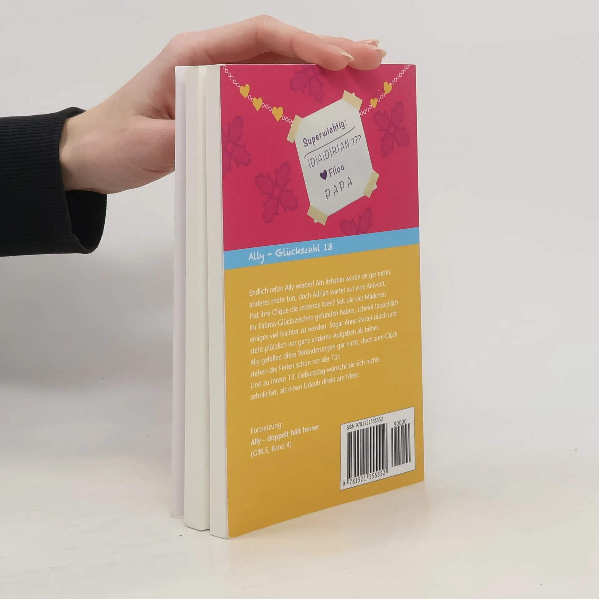 Dies ist der dritte Band aus der Ally ♥ Reihe book-sign Eine merkwürdige Song-Botschaft hat Ally ganz schön durcheinander gebracht. Was soll sie darauf bloß antworten? Und vor allem wie? Aber wofür hat man denn beste Freundinnen? Seit die vier Mädchen ihr Fatima-Glückszeichen gefunden haben, scheint tatsächlich einiges viel leichter zu werden. Reiten, Hochzeitsvorbereitungen, Theater, Singen. Das Leben ist bunt! Sogar die pummelige Anna startet durch und steht plötzlich vor ganz anderen Aufgaben als bisher. Ally gefallen diese Veränderungen irgendwie gar nicht, doch zum Glück stehen bald die Ferien vor der Tür. Und als Geschenk zu ihrem 13. Geburtstag wünscht sie sich nichts sehnlicher, als einen Urlaub am Meer. Weiterlesen mit Band 4: Ally – doppelt hält besser! Die Reihe book-sign GIRLS spiegelt die Probleme von Mädchen zwischen 10 und 14 Jahren wieder und zeigt, dass sie damit nicht alleine sind. In Zeiten von Instagram, Whattsapp und YouTube ist es wichtig, Heranwachsenden die Möglichkeit zu geben, ihre Lebensrealität abzugleichen und zu erleben, dass nicht nur Internet, Medien und Jungs im Mittelpunkt stehen, sondern auch Familie, echte Freundschaft und verantwortliches Handeln von Bedeutung sind.