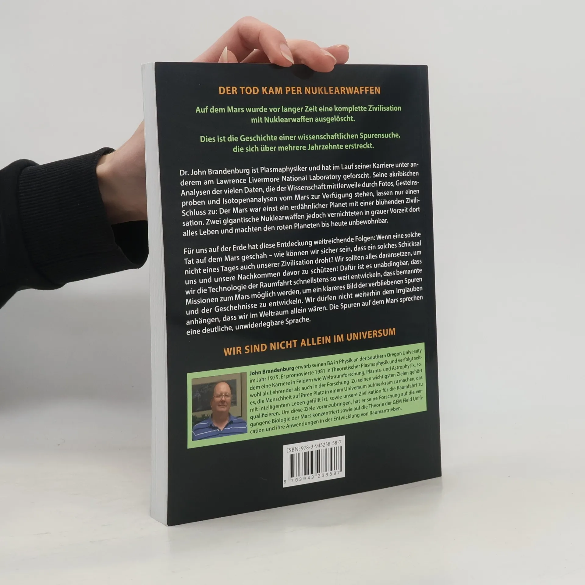 DER TOD KAM PER NUKLEARWAFFENAuf dem Mars wurde vor langer Zeit eine komplette Zivilisation mit Nuklearwaffen ausgelöscht.Dies ist die Geschichte einer wissenschaftlichen Spurensuche, die sich über mehrere Jahrzehnte erstreckt.Dr. John Brandenburg ist Plasmaphysiker und hat im Lauf seiner Karriere unter anderem am Lawrence Livermore National Laboratory geforscht. Seine akribischen Analysen der vielen Daten, die der Wissenschaft mittlerweile durch Fotos, Gesteinsproben und Isotopenanalysen vom Mars zur Verfügung stehen, lassen nur einen Schluss Der Mars war einst ein erdähnlicher Planet mit einer blühenden Zivilisation. Zwei gigantische Nuklearwaffen jedoch vernichteten in grauer Vorzeit dort alles Leben und machten den roten Planeten bis heute unbewohnbar.Für uns auf der Erde hat diese Entdeckung weitreichende Wenn eine solche Tat auf dem Mars geschah – wie können wir sicher sein, dass ein solches Schicksal nicht eines Tages auch unserer Zivilisation droht? Wir sollten alles daransetzen, um uns und unsere Nachkommen davor zu schützen! Dafür ist es unabdingbar, dass wir die Technologie der Raumfahrt schnellstens so weit entwickeln, dass bemannte Missionen zum Mars möglich werden, um ein klareres Bild der verbliebenen Spuren und der Geschehnisse zu entwickeln. Wir dürfen nicht weiterhin dem Irrglauben anhängen, dass wir im Weltraum allein wären. Die Spuren auf dem Mars sprechen eine deutliche, unwiderlegbare Sprache.WIR SIND NICHT ALLEIN IM UNIVERSUM