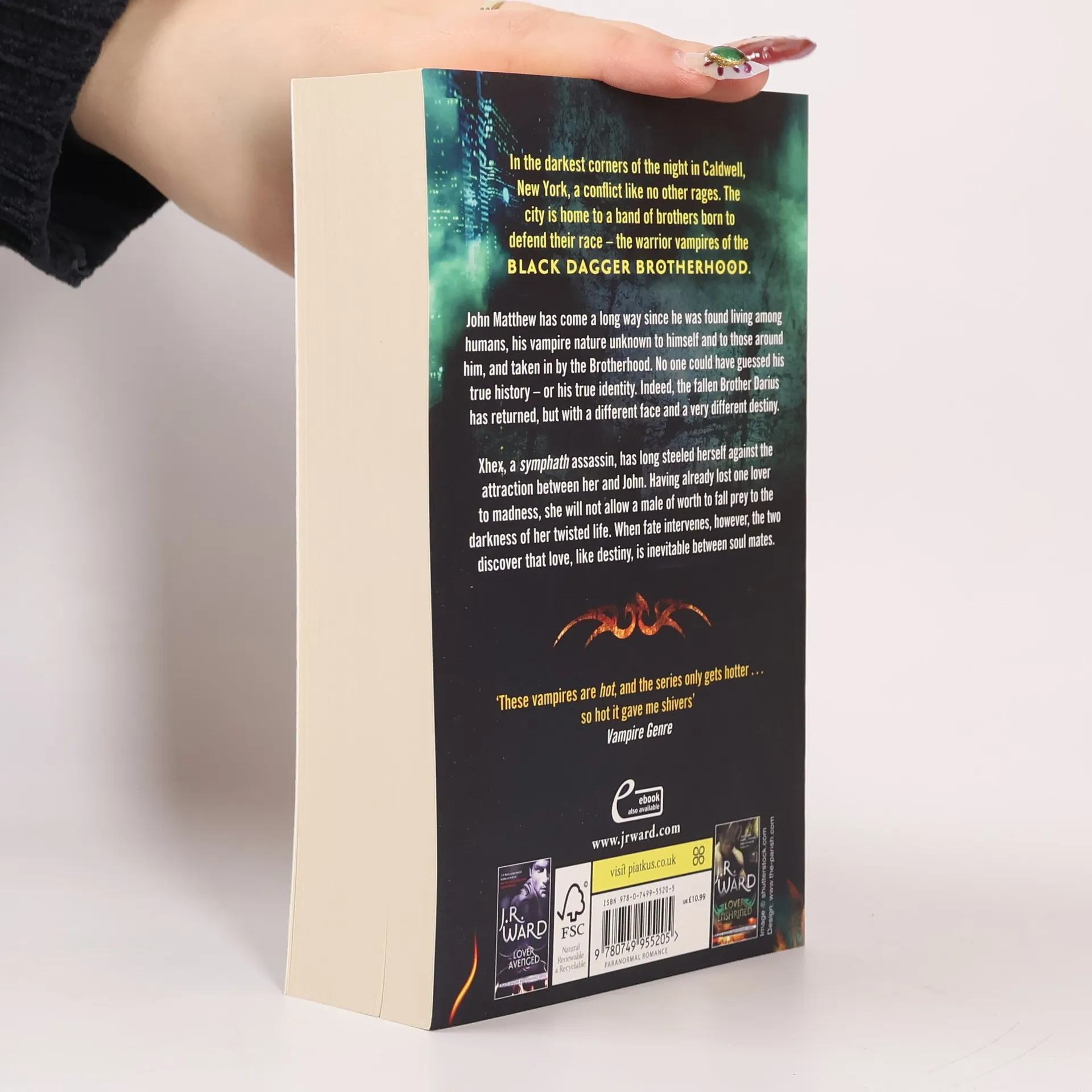 In the darkest corners of the night in Caldwell, New York, a conflict like no other rages. Long divided as a terrifying battleground for the vampires and their enemies, the city is home to a band of brothers born to defend their race: the warrior vampires of the Black Dagger Brotherhood. John Matthew has come a long way since he was found living among humans, his vampire nature unknown to himself and to those around him. After he was taken in by the Brotherhood, no one could guess what his true history was- or his true identity. Indeed, the fallen Brother Darius has returned, but with a different face and a very different destiny. As a vicious personal vendetta takes John into the heart of the war, he will need to call up on both who he is now and who he once was in order to face off against evil incarnate. Xhex, a symphath assassin, has long steeled herself against the attraction between her and John Matthew. Having already lost one lover to madness, she will not allow the male of worth to fall prey to the darkness of her twisted life. When fate intervenes, however, the two discover that love, like destiny, is inevitable between soul mates