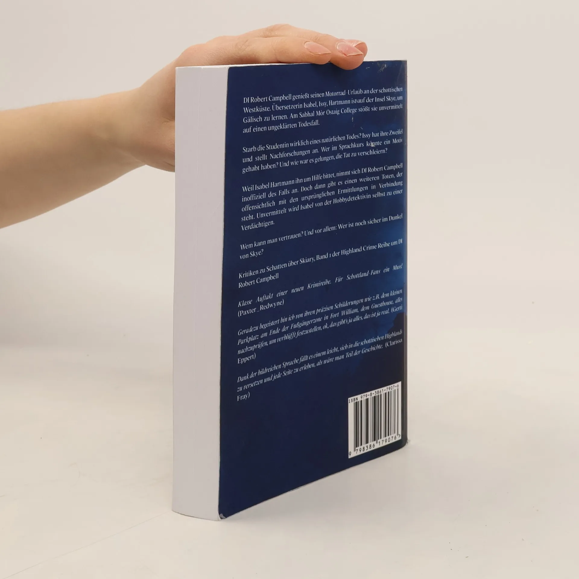 Die spannend erzählte Highland Crime Serie schlägt mit ihrer einzigartigen Mischung aus eindringlicher Atmosphäre, außergewöhnlichen Charakteren und emotionaler Tiefe ein fantastisches neues Kapitel in der Kriminalliteratur auf. Unverwechselbare und emotional komplexe Geschichten in der atemberaubenden und eindrucksvollen Landschaft der schottischen Highlands. Isabel, Issy, Hartmann reist wieder nach Schottland, doch dieses Mal nicht um ein Buch zu übersetzen, sondern um auf der Insel Skye Gälisch zu lernen. Am Sabhal Mòr Ostaig College, am südlichen Ende der Insel, angekommen, stellt sie fest, dass alle anderen Teilnehmer den Kurs bereits zum zweiten Mal besuchen, der erste war wegen eines Todesfalls abgebrochen worden. Eine Studentin war einem Herzinfarkt erlegen. Issy nimmt ihren Platz ein. Doch war das wirklich ein natürlicher Tod? Issy, die im Zimmer der Verstorbenen untergebracht ist, hat ihre Zweifel und stellt Nachforschungen an. Wer im Sprachkurs könnte ein Motiv gehabt haben, Clarissa zu töten? Und wie war es demjenigen gelungen, die Tat zu verschleiern? Jeder der Kursteilnehmer hatte entweder ein Motiv oder die Möglichkeit, die junge Frau zu töten. Doch wer war es? Und vor allem, wie? Der überheblicher Texaner Donald, die scheue Französin Sarine, die abgedrehte Künstlerin Monica, die schottische Krankenschwester Kate oder die Vermieterin einer Touristenunterkunft Margaret? Bei einem Barbecue in Glendale macht Issy dann eine Entdeckung, die alles verändert: Es gibt eine Verbindung, von der niemand etwas weiß. Nur sie und der Mörder! Plötzlich geraten die Ereignisse außer Kontrolle. DI Robert Campbell ist im Urlaub und mit dem Motorrad an der schottischen Westküste unterwegs. Er war in die ursprünglichen Ermittlungen im Jahr davor nicht involviert, nimmt sich aber des Falls an, als Isabel Hartmann ihn um Hilfe bittet. Doch dann muss er ganz offiziell ermitteln: Es hat einen weiteren Toten gegeben, der ganz offensichtlich mit dem alten Fall in Verbindung steht. Unvermittelt ist Isabel eine der Verdächtigen. Gelingt es den beiden, das Rätsel zu lösen und Licht ins Dunkel von Skye zu bringen? DI Robert Campbell war bereits in seinem ersten Fall auf die deutsche Übersetzerin getroffen. In Schatten über Skiary fand Isabel Hartmann die Leiche eines Deutschen am Strand von Sandaig und machte sich im kleinen Örtchen Glenelg auf die Suche nach seinem Mörder. Nun ermitteln beide auf der Insel Skye, die mit ihren dramatischen Bergen und einsamen Moorlandschaften den beeindruckenden Hintergrund für einen spannenden zweiten Fall am gälischen College bildet.
