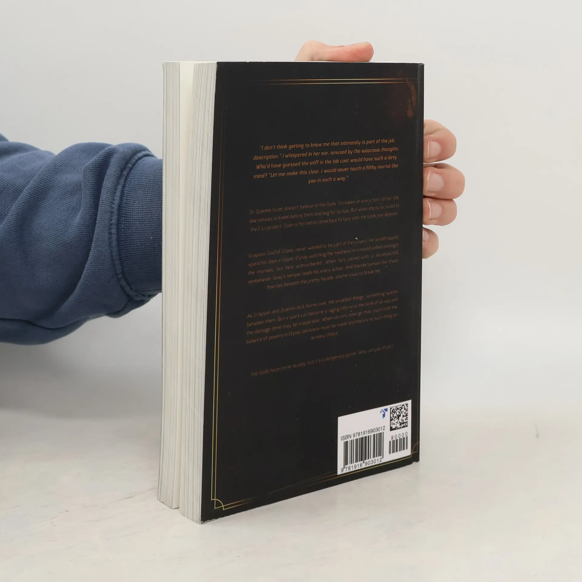 "I don't think getting to know me that intimately is part of the job description," I whispered in her ear, amused by the salacious thoughts. Who'd have guessed the stiff in the lab coat would have such a dirty mind? "Let me make this clear. I would never touch a filthy mortal like you in such a way." Dr Quentin Scott doesn't believe in the Gods. Forsaken at every turn of her life, she refuses to kneel before them and beg for scraps. But when she is recruited to the E.L.I. project, Quen is forced to come face to face with the Gods she detests. Grayson, God of Chaos, never wanted to be part of the project. He would happily spend his days in Upper Elysia, watching the madness he created unfold amongst the mortals, but he's outnumbered. When he's paired with a disrespectful nonbeliever, Gray's temper leads his every action. And then he senses the chaos that lies beneath the pretty façade, and he vows to break her. As Grayson and Quentin lock horns over the smallest things, something sparks between them. But a spark can become a raging inferno in the blink of an eye and the damage done may be irreparable. When secrets emerge that could shift the balance of powers in Elysia, decisions must be made and there's no such thing as an easy choice. The Gods have come to play, but it's a dangerous game. Who can you trust? *This book contains sexually explicit scenes, mature language, discussion of deceased parents and a train accident and OM/OW drama. Not intended for readers below 18. Reader discretion is advised.*