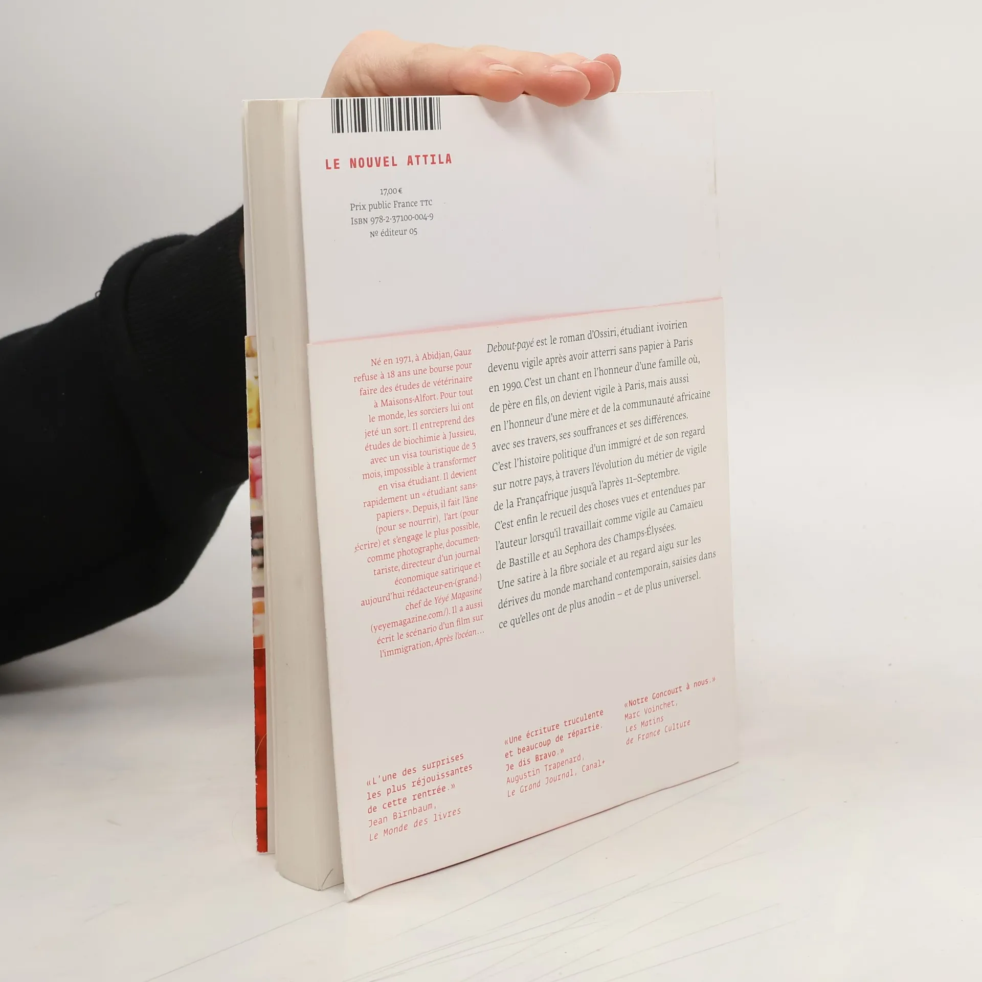 Debout-Payé est le roman d’Ossiri, étudiant ivoirien devenu vigile après avoir atterri sans papier en France en 1990.C’est un chant en l’honneur d’une famille où, de père en fils, on devient vigile à Paris, en l’honneur d’une mère et plus globalement en l’honneur de la communauté africaine à Paris, avec ses travers, ses souffrances et ses différences. C’est aussi l’histoire politique d’un immigré et du regard qu’il porte sur notre pays, à travers l’évolution du métier de vigile depuis les années 1960 — la Françafrique triomphante — à l’après 11-Septembre.Cette épopée familiale est ponctuée par des interludes : les choses vues et entendues par l’auteur lorsqu’il travaillait comme vigile au Camaïeu de Bastille et au Sephora des Champs-Élysées. Gauz est un fin satiriste, tant à l’endroit des patrons que des client(e)s, avec une fibre sociale et un regard très aigu sur les dérives du monde marchand contemporain, saisies dans ce qu’elles ont de plus anodin — mais aussi de plus universel.Un portrait drôle, riche et sans concession des sociétés française et africaine, et un témoignage inédit de ce que voient vraiment les vigiles sous leur carapace.