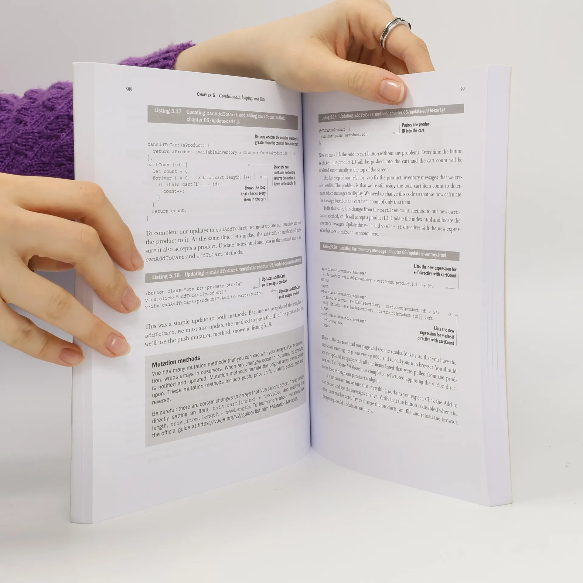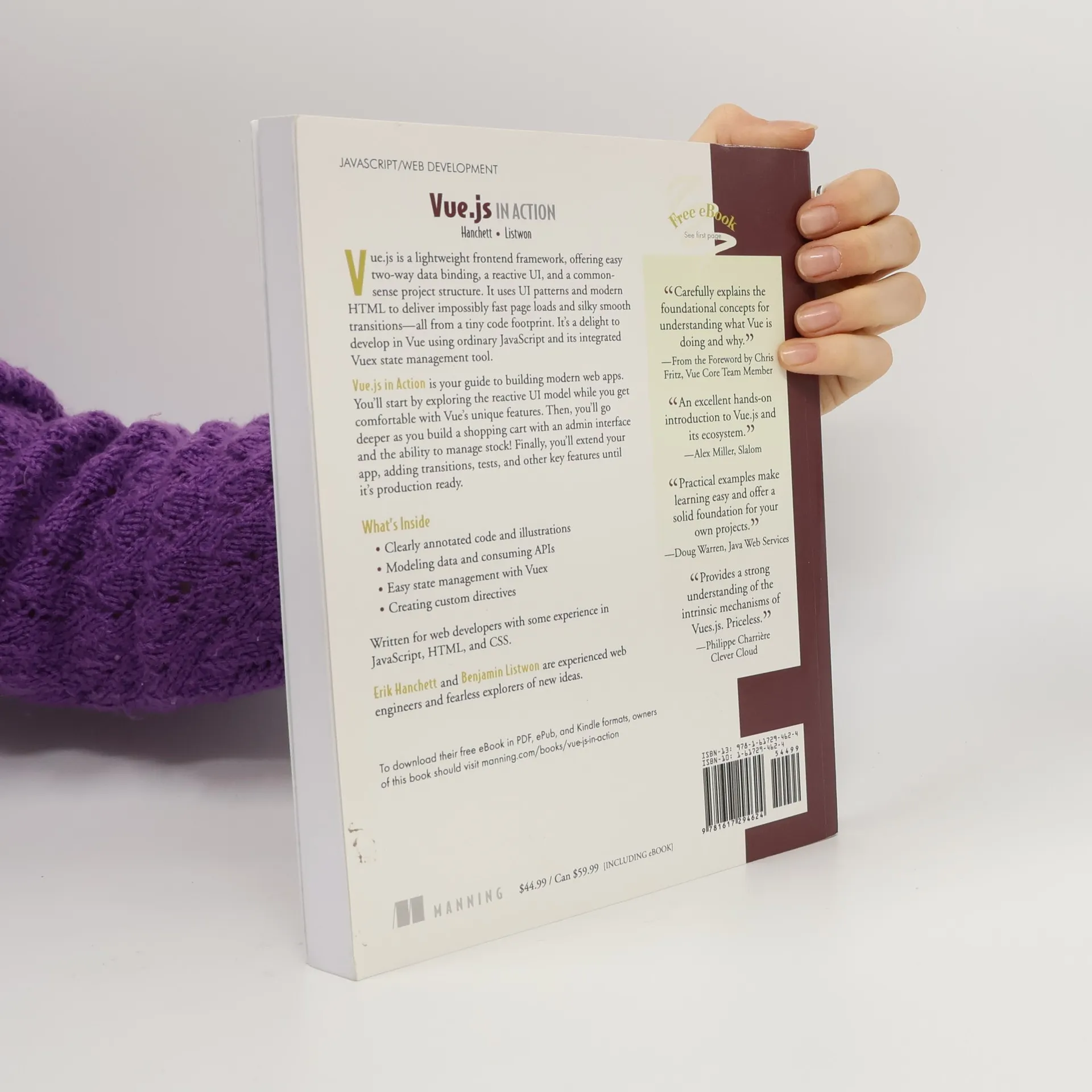 Vue.js is a front-end framework that builds on many of the reactive UI ideas introduced in React.js. Vue.js in Action teaches readers to build fast, flowing web UI with the Vue.js framework. As they move through the book, readers put their skills to practice by building a complete web store application with product listings, a checkout process, and an administrative interface!