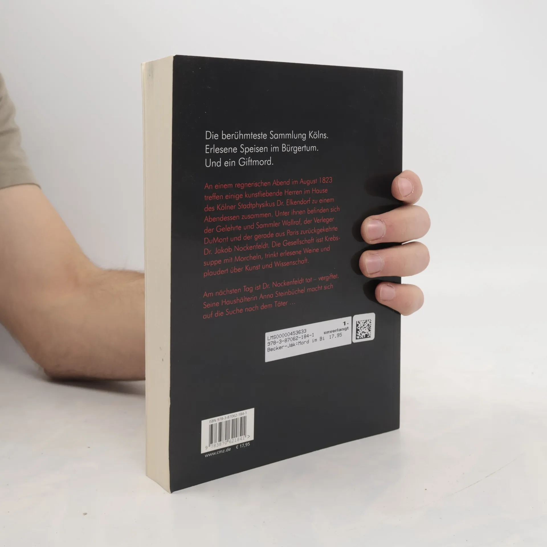 An einem regnerischen Abend im August 1823 treffen im Hause des Kölner Stadtphysikus Dr. Elkendorf einige kunstliebende Herren zu einem Abendessen zusammen. Unter ihnen befinden sich der Gelehrte und Sammler Wallraf, der Verleger DuMont und der gerade aus Paris zurückgekehrte Dr. Jakob Nockenfeldt. Die Gesellschaft isst Krebssuppe mit Morcheln, trinkt erlesene Weine und plaudert über Kunst und Wissenschaft. Am nächsten Tag ist Dr. Nockenfeldt tot – vergiftet. Seine Haushälterin Anna Steinbüchel macht sich auf die Suche nach dem Täter …