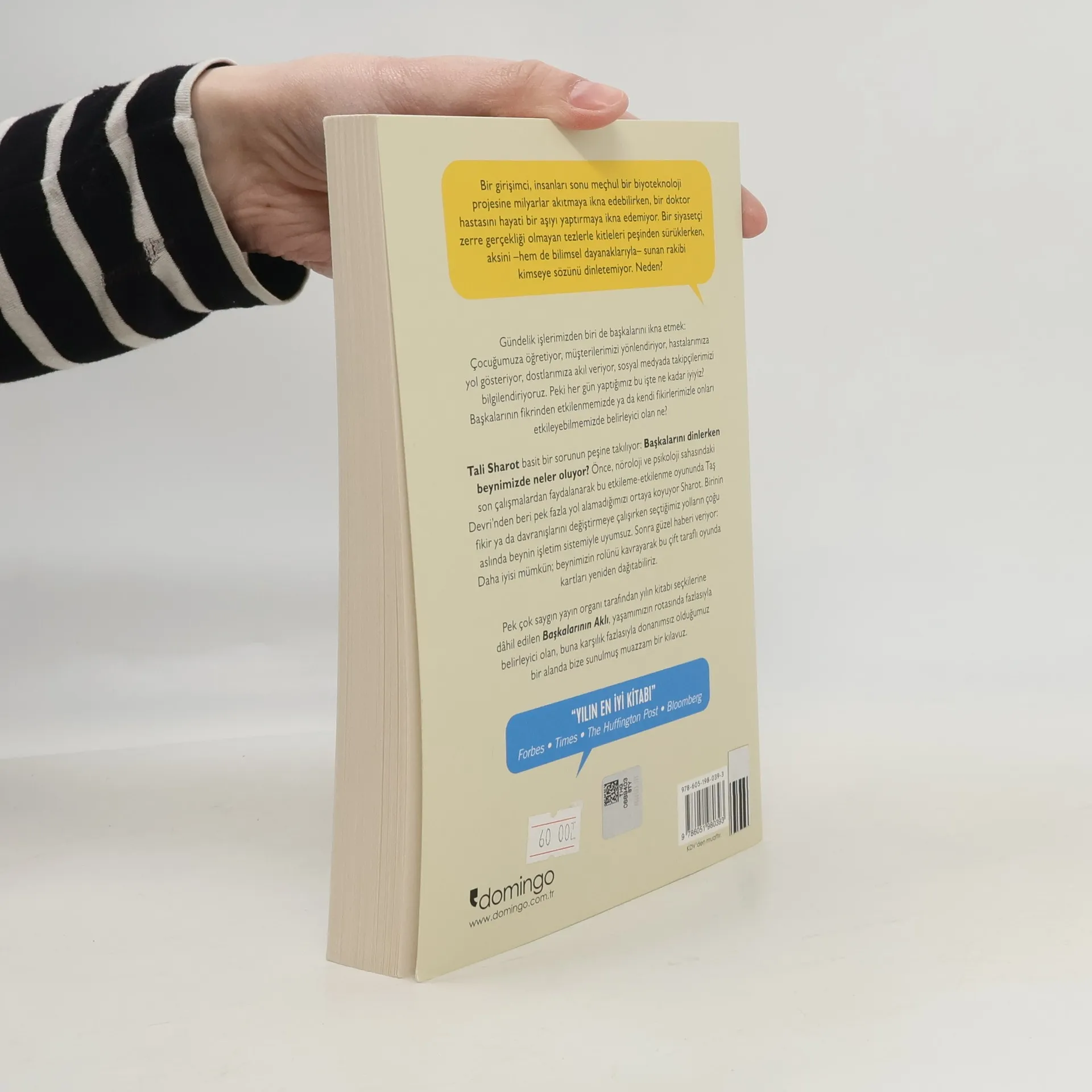 Bir girişimci, insanları sonu meçhul bir biyoteknoloji projesine milyarlar akıtmaya ikna edebilirken, bir doktor hastasını hayati bir aşıyı yaptırmaya ikna edemiyor. Bir siyasetçi zerre gerçekliği olmayan tezlerle kitleleri peşinden sürüklerken, aksini –hem de bilimsel dayanaklarıyla– sunan rakibi kimseye sözünü dinletemiyor. Neden? Gündelik işlerimizden biri de başkalarını ikna etmek: Çocuğumuza öğretiyor, müşterilerimizi yönlendiriyor, hastalarımıza yol gösteriyor, dostlarımıza akıl veriyor, sosyal medyada takipçilerimizi bilgilendiriyoruz. Peki her gün yaptığımız bu işte ne kadar iyiyiz? Başkalarının fikrinden etkilenmemizde ya da kendi fikirlerimizle onları etkileyebilmemizde belirleyici olan ne? Tali Sharot basit bir sorunun peşine takılıyor: Başkalarını dinlerken beynimizde neler oluyor? Önce, nöroloji ve psikoloji sahasındaki son çalışmalardan faydalanarak bu etkileme-etkilenme oyununda Taş Devri’nden beri pek fazla yol alamadığımızı ortaya koyuyor Sharot. Birinin fikir ya da davranışlarını değiştirmeye çalışırken seçtiğimiz yolların çoğu aslında beynin işletim sistemiyle uyumsuz. Sonra güzel haberi veriyor: Daha iyisi mümkün; beynimizin rolünü kavrayarak bu çift taraflı oyunda kartları yeniden dağıtabiliriz. Pek çok saygın yayın organı tarafından yılın kitabı seçkilerine dâhil edilen Başkalarının Aklı, yaşamımızın rotasında fazlasıyla belirleyici olan, buna karşılık fazlasıyla donanımsız olduğumuz bir alanda bize sunulmuş muazzam bir kılavuz.