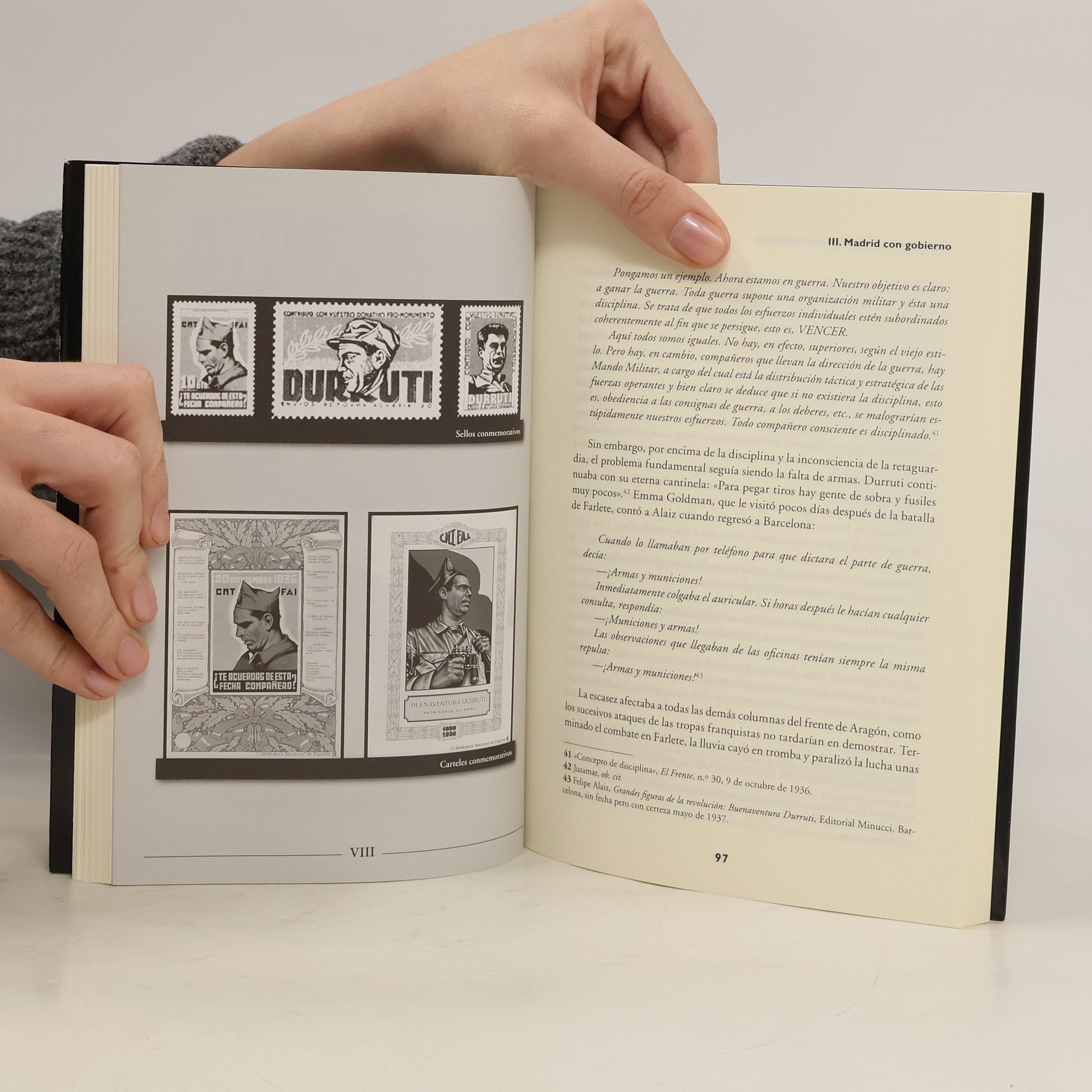 «La historia de nuestra guerra civil está llena de cuestiones cuya resolución objetiva es una necesidad para aquellos que luchan contra la destrucción del conocimiento histórico emprendido desde el poder, porque la liquidación de la memoria histórica asociada al proletariado significaría la eliminación de toda perspectiva revolucionaria. La figura de Durruti, en tanto que personificación de la revolución proletaria anarquista de 1936 concentró muchas de esas cuestiones, verdaderas heridas del movimiento libertario, que en su propio beneficio conviene mantener abiertas y hurgar en ellas. Si duelen, es signo de que sus ideas perviven. Esas ideas no tienen precio. Quienes trataron de venderlas, se vendieron sólo a sí mismos. El anarquismo o es radical o no es nada. Sin embargo en los tiempos del espectáculo y la cultura de masas el pasado vendría ser una mercancía moderna, consumible como cualquier otra. Un objeto cultural de entretenimiento asequible en cuadernos coleccionables, DVDs o series televisivas. La banda de historiadores de la universidad ya no tiene por función la falsificación o la ocultación del pasado como hacían los estalinistas sino su conversión en espectáculo. El primer paso de esa preparación para el consumo ha sido la museificación. La historia para la pandilla universitaria sería un enorme panteón de cadáveres a los que se podría despedazar y analizar como se haría con las momias de Egipto. La distancia que nos separa de ellos sería tan fabulosa que nada habría que temer. El punto de vista forense certificaría el lejano momento de la defunción y desplegaría un abanico de hipótesis a escoger. Ese aspecto "plural" es el marchamo de la mercancía ; en el espectáculo importa poco la moraleja. Se trabaja para el olvido pero de otra manera : si los historiadores estalinistas se servían del presente para reescribir el pasado, los actuales expertos de niversidad se sirven del pasado para mistificar el presente. La historia-espectáculo legitima la dominación como si ésta no tuviera que ver con aquél ; embalsamando cadáveres, el poder quiere mostrarse como el heredero legal de los vencidos y no como el vencedor de la víspera. Como buen usurpador, quiere que no se sepa que es un recién llegado, que su pasado es reciente, que prácticamente no tiene historia. Que está ahí porque nadie se decide a echarlo. Un buen ejemplo ha sido el "socialismo libertario" que hace unos años sacó de la chistera el presidente Zapatero. La mercantilización espectacular de la guerra civil correspondería a una pérdida total del sentido histórico en las masas, vacías y atemorizadas. No obstante dicha pérdida no es completa y por lo tanto, tiene remedio. Todavía la historia no es de quien la manipula. Durruti no ha muerto.»