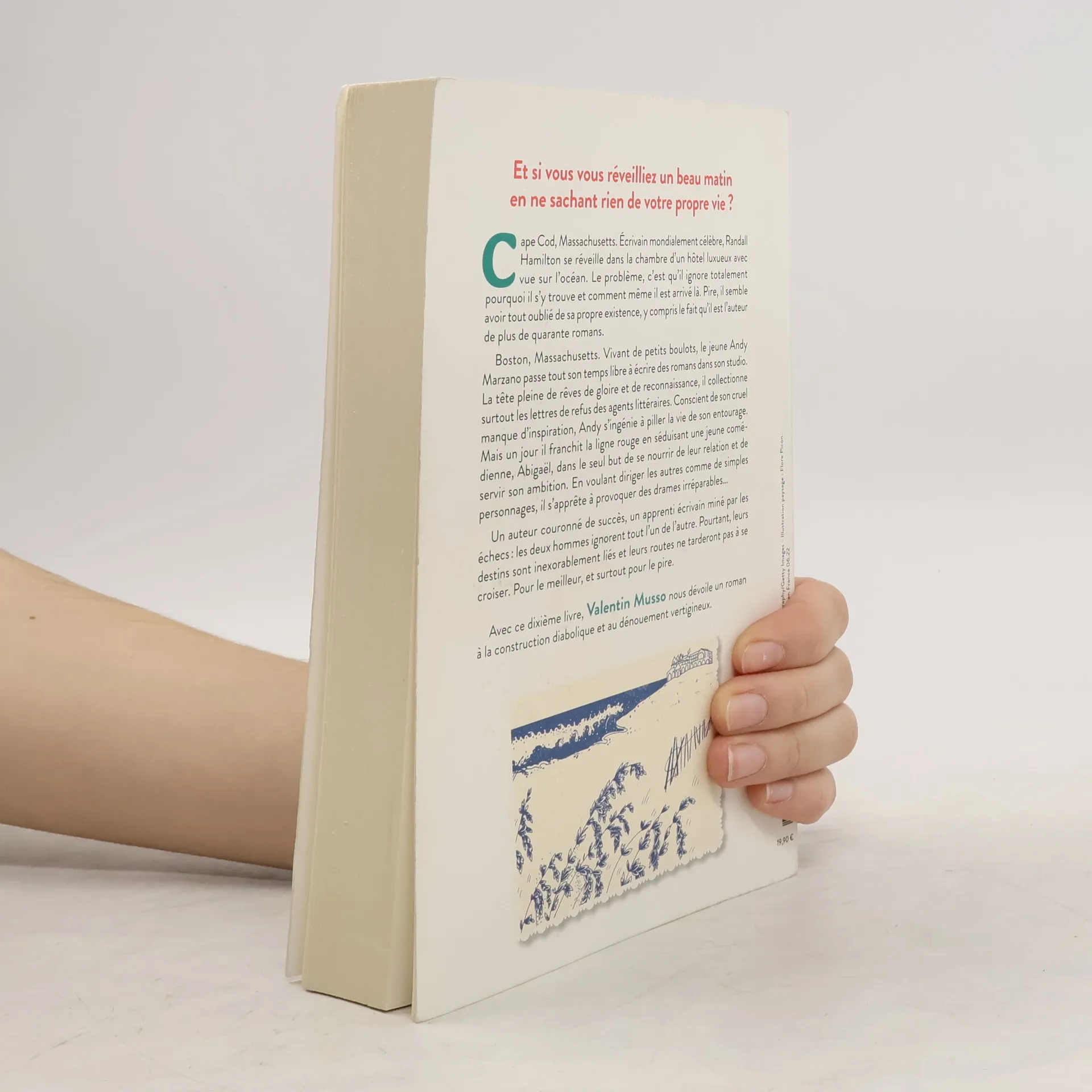 Et si vous vous réveilliez un beau matin en ne sachant rien de votre propre vie ? Cape Cod, Massachusetts. Écrivain mondialement célèbre, Randall Hamilton se réveille dans la chambre d’un hôtel luxueux avec vue sur l’océan. Le problème, c’est qu’il ignore totalement pourquoi il s’y trouve et comment même il est arrivé là. Pire, il semble avoir tout oublié de sa propre existence, y compris le fait qu’il est l’auteur de plus de quarante romans. Boston, Massachusetts . Vivant de petits boulots, le jeune Andy Marzano passe tout son temps libre à écrire des romans dans son studio. La tête pleine de rêves de gloire et de reconnaissance, il collectionne surtout les lettres de refus des agents littéraires. Conscient de son cruel manque d’inspiration, Andy s’ingénie à piller la vie de son entourage. Mais un jour il franchit la ligne rouge en séduisant une jeune comédienne, Abigaël, dans le seul but de se nourrir de leur relation et de servir son ambition. En voulant diriger les autres comme de simples personnages, il s’apprête à provoquer des drames irréparables… Un auteur couronné de succès, un apprenti écrivain miné par les échecs : les deux hommes ignorent tout l’un de l’autre. Pourtant, leurs destins sont inexorablement liés et leurs routes ne tarderont pas à se croiser. Pour le meilleur, et surtout pour le pire. Avec ce dixième livre, Valentin Musso nous dévoile un roman à la construction diabolique et au dénouement vertigineux.