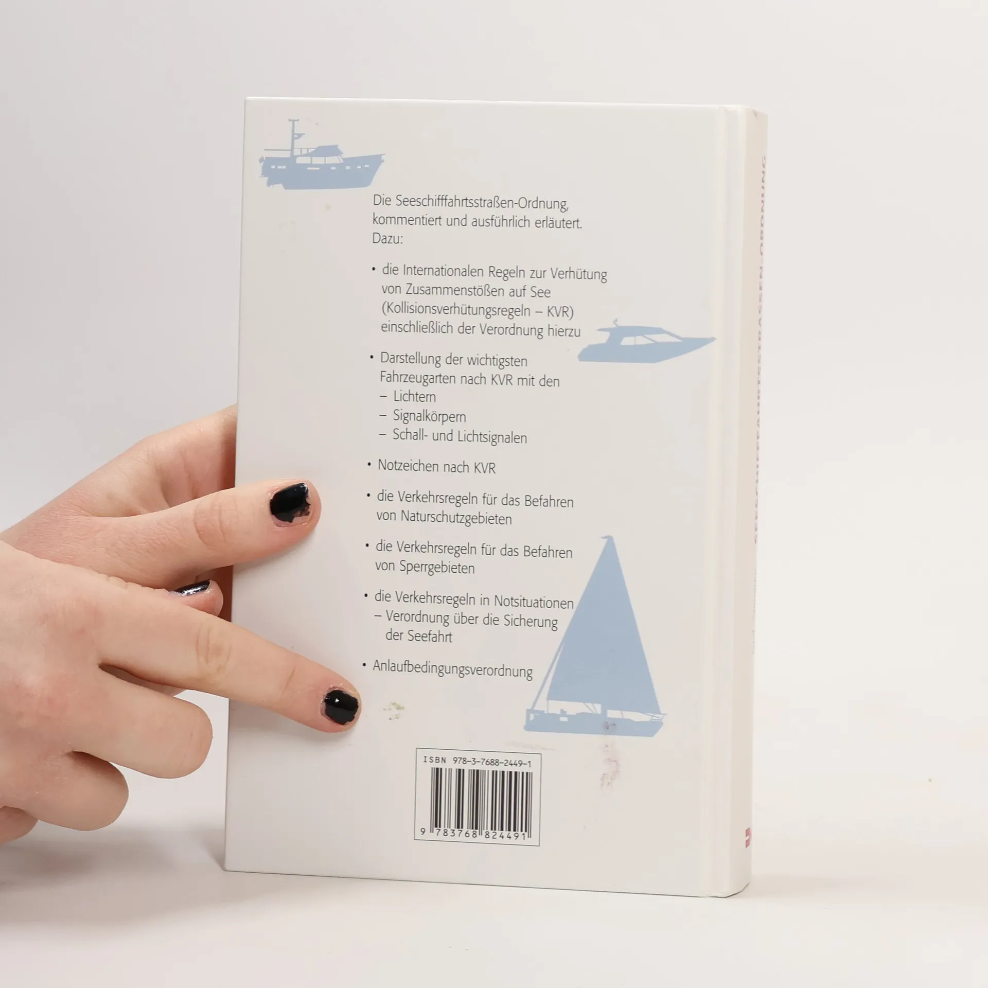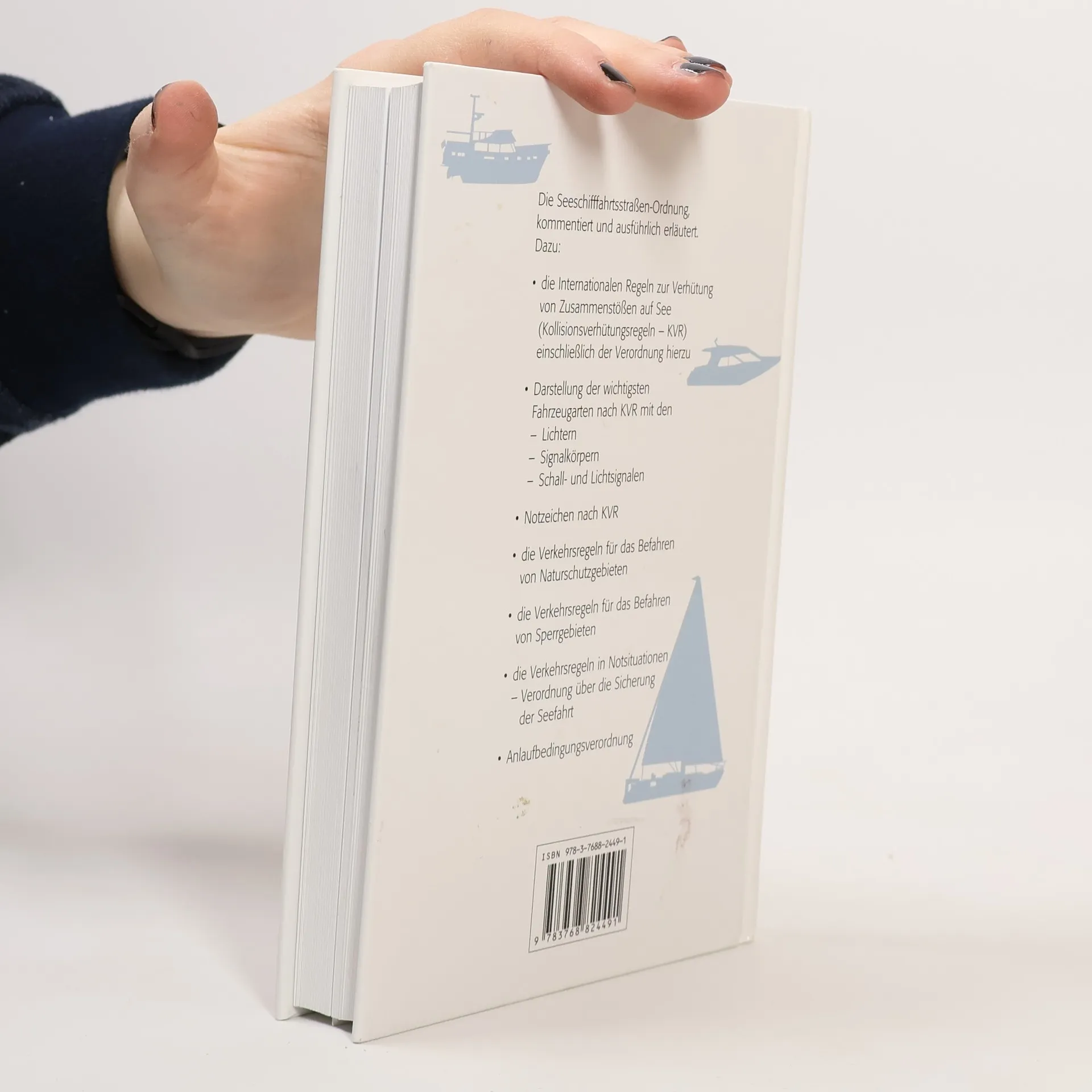Die Seeschifffahrtsstraßen-Ordnung, kommentiert und ausführlich erläutert. Dazu: - die internationalen Regeln zur Verhütung von Zusammenstößen auf See (Kollisionsverhütungsregeln – KVR) einschließlich der Verordnung hierzu. - Darstellung der wichtigsten Fahrzeugarten nach KVR mit den: -> Lichtern -> Signalkörpern -> Schall und Lichtsignalen - Notzeichen nach KVR - die Verkehrsregeln für das Befahren von Naturschutzgebieten - die Verkehrsregeln für das Befahren von Sperrgebieten - die Verkehrsregeln in Notsituationen -> Verordnung über die Sicherung der Seefahrt - Anlaufbedingungsverordnung