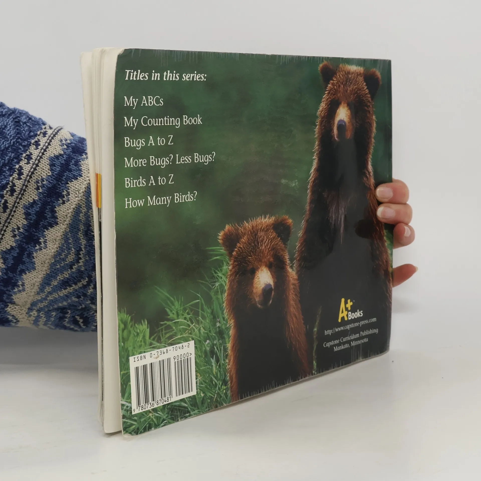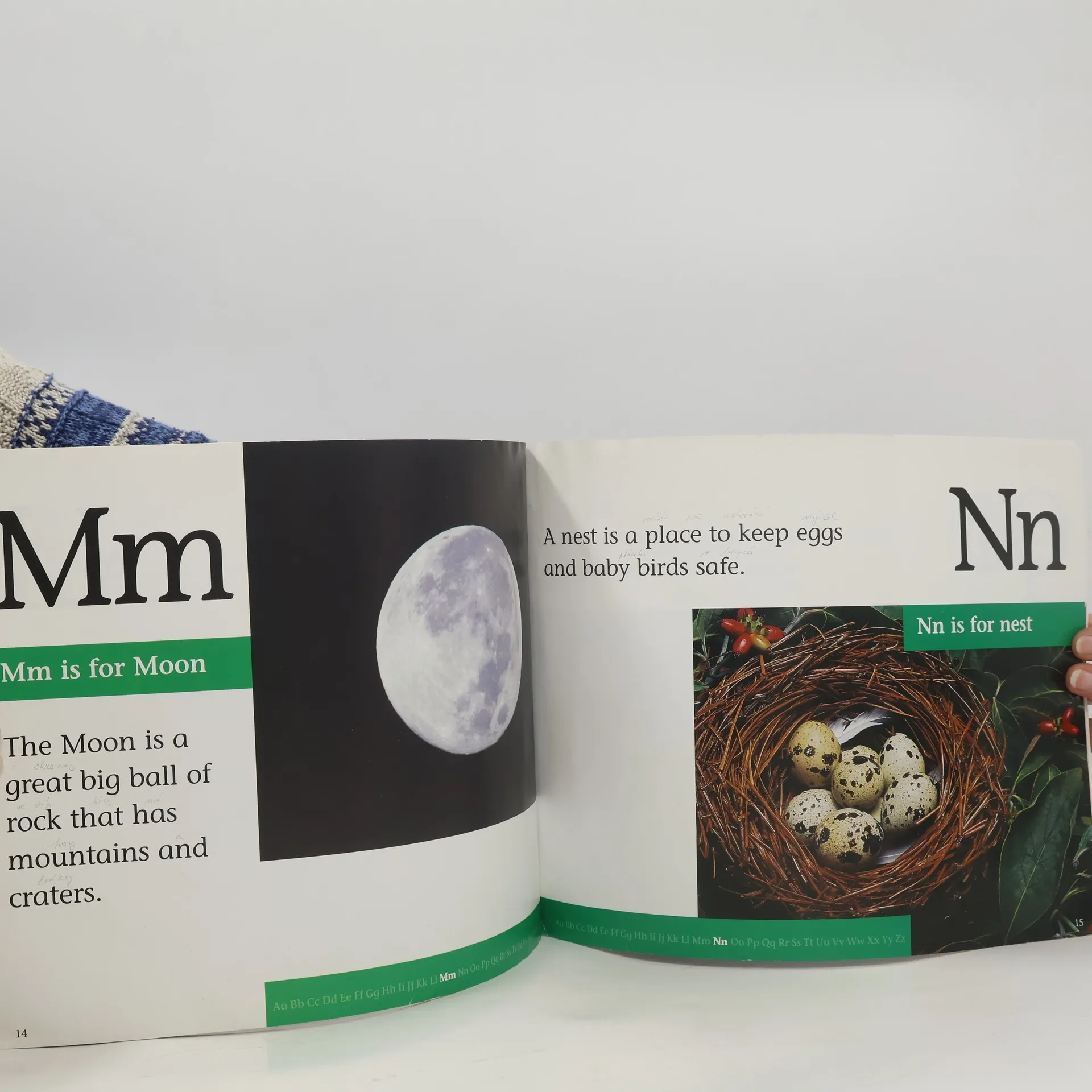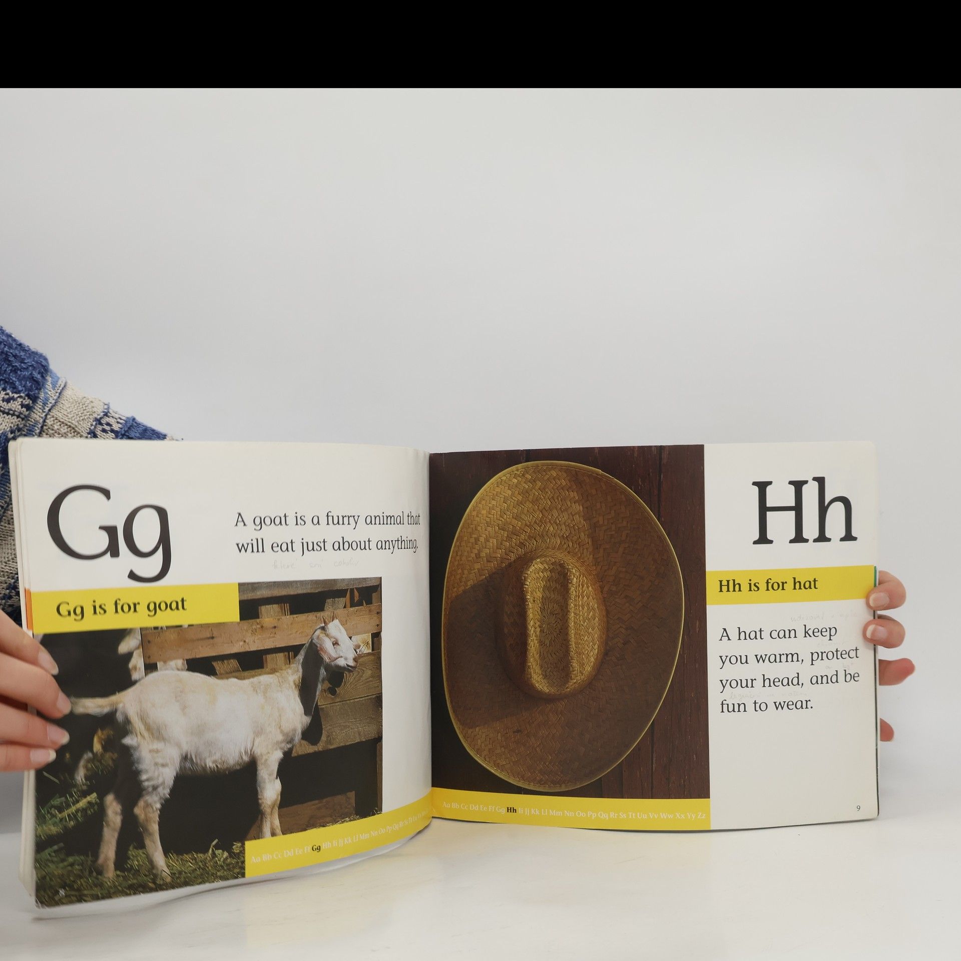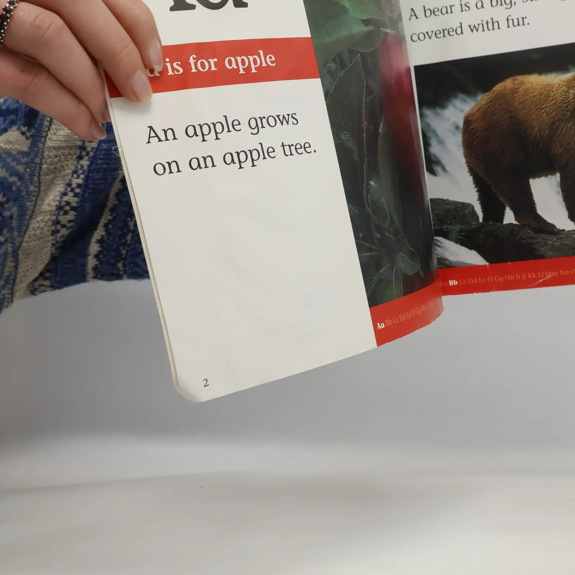 Photographs and brief text present the alphabet using vocabulary such as apple, bear, and cat.