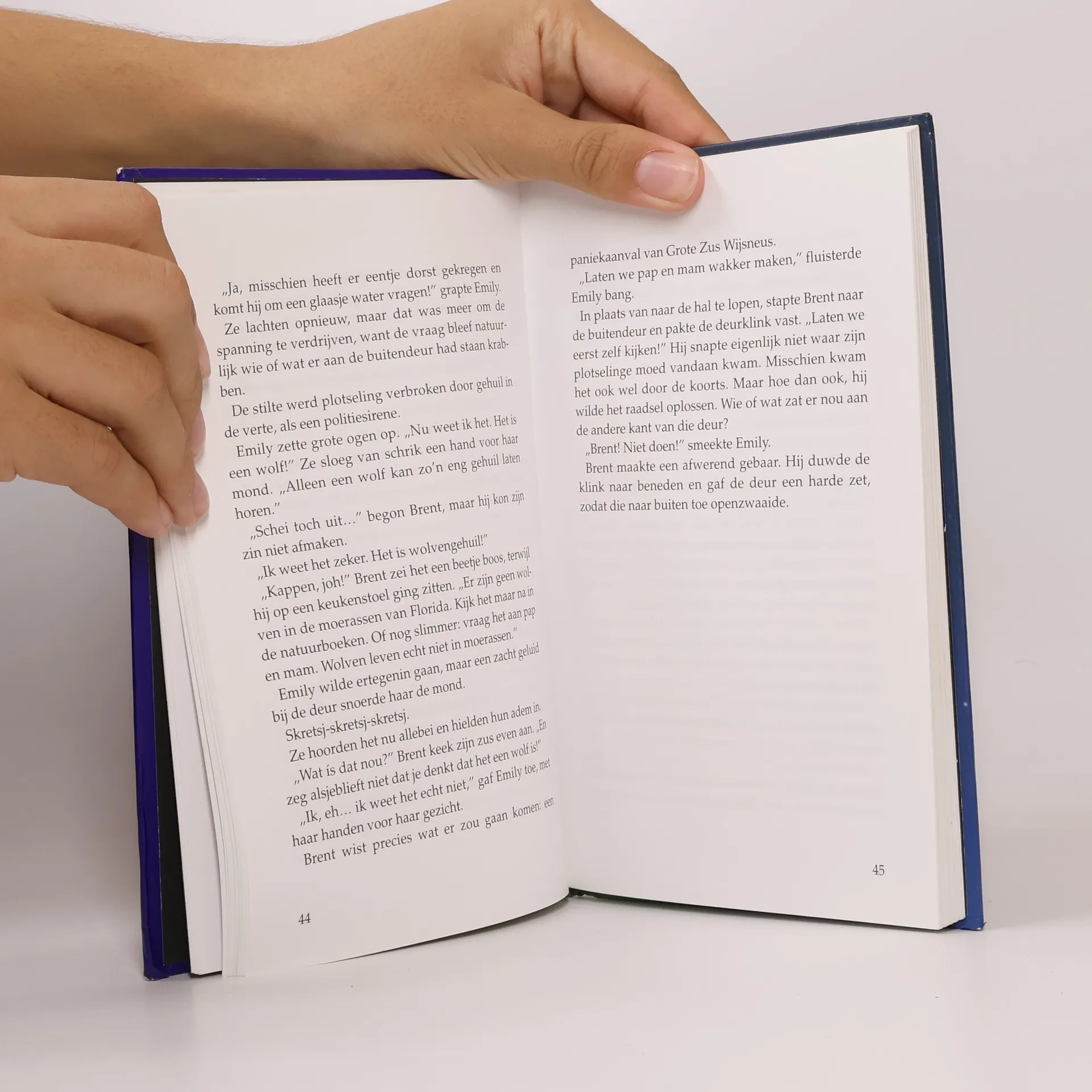 Brent hoorde een vreemd geluid. Alsof er takjes braken, van die droge takken die breken als iemand erop gaat staan. 'Ben jij dat, Kevin?' Plotseling trok er een streep bleek maanlicht over hem heen. Brent keek omhoog en hij kon de maan nu zien door een gat in de bewolking. Het gelige gevaarte stond hoog aan de hemel en bescheen een steeds groter stuk van het moeras. En toen begon ook het verschrikkelijke gehuil weer. Het was een monsterlijke kreet, zo hard, zo dichtbij! Brent deed zijn handen voor zijn oren.