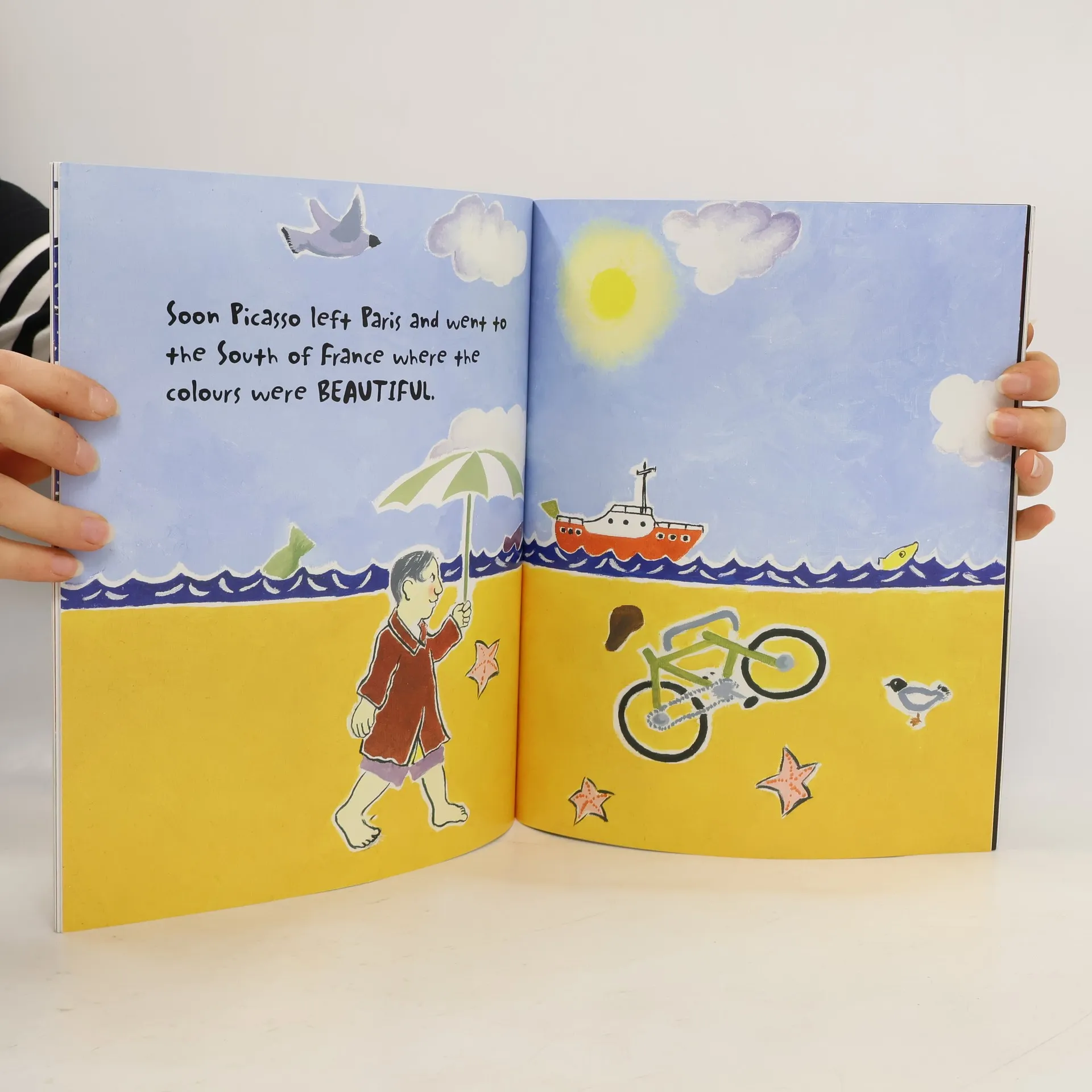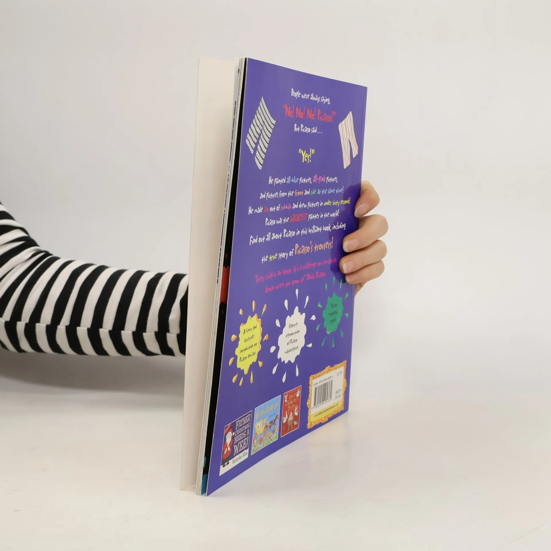 Whenever Picasso does something different, people say, "No! No! No! Picasso!" But Picasso doesn't listen. Instead, he says . . . "Yes!". He paints all-blue pictures, all-pink pictures, plus pictures from the front and side all at the same time! He makes art out of bike bits and he can draw pictures in less than 60 seconds! Soon he becomes the greatest painter in the world. But he still wants to be different . . .