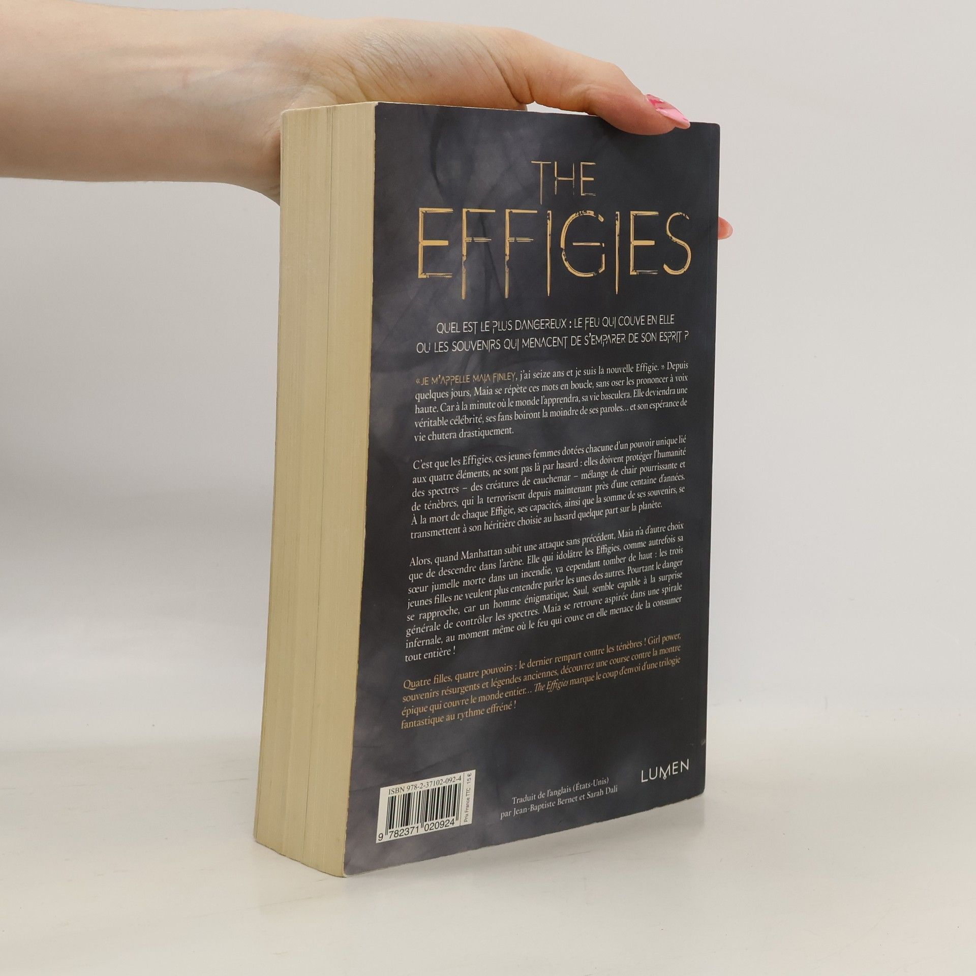 « Je m’appelle Maia Finley, j’ai seize ans et je suis la nouvelle Effigie. » Depuis quelques jours, Maia se répète ces mots en boucle, sans oser les prononcer à voix haute. Car à la minute où le monde l’apprendra, sa vie basculera. Elle deviendra une véritable célébrité, ses fans boiront la moindre de ses paroles… et son espérance de vie chutera drastiquement. C’est que les Effigies, ces jeunes femmes dotées chacune d’un pouvoir unique lié aux quatre éléments, ne sont pas là par hasard : elles doivent protéger l’humanité des Spectres – des créatures de cauchemar – mélange de chair pourrissante et de ténèbres, qui la terrorisent depuis maintenant près d’une centaine d’années. À la mort de chaque Effigie, ses capacités, ainsi que la somme de ses souvenirs, se transmettent à son héritière choisie au hasard quelque part sur la planète. Alors, quand Manhattan subit une attaque sans précédent, Maia n’a d’autre choix que de descendre dans l’arène. Elle qui idolâtre les Effigies, comme autrefois sa sœur jumelle morte dans un incendie, va cependant tomber de haut : les trois jeunes filles ne veulent plus entendre parler les unes des autres. Pourtant le danger se rapproche, car un homme énigmatique, Saul, semble capable à la surprise générale de contrôler les Spectres. Maia se retrouve aspirée dans une spirale infernale, au moment même où le feu qui couve en elle menace de la consumer tout entière !