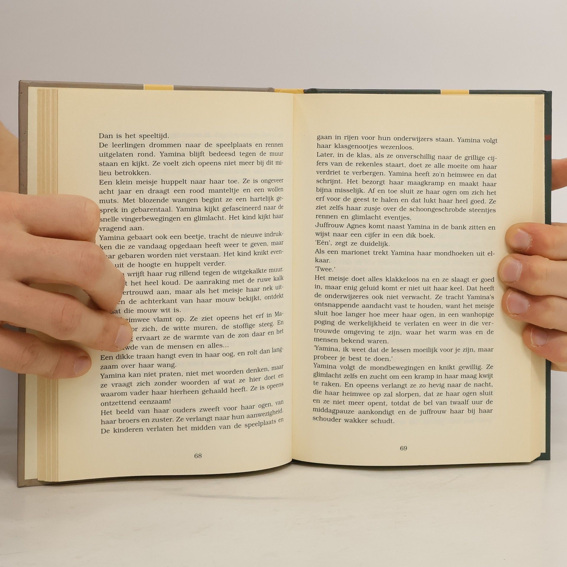 Dit boek gaat over een doofstom Marokkaans meisje. Het is een fictief verhaal, maar het hoofdpersonage staat wel als symbool voor onwetendheid en onmondigheid, want deze twee gegevens hebben me aangespoord om dit boek te schrijven. In Marokko heb ik ontelbare meisjes gezien die nooit de kans krijgen om ooit naar school te gaan en dat was de aanleiding voor het schrijven van dit boek.De doofstomme Yamina is twaalf als ze met haar familie naar België komt. Ze moet naar school en leert daar lezen, schrijven en ook liplezen en gebarentaal. Er gaat een wereld voor haar open. Dat zorgt voor conflicten, vooral met haar vader, die niet gewend is dat zijn dochter een eigen mening heeft. Yamina ziet hier veel vrijheid, ze leert op de tram een jongen kennen waar ze verliefd op wordt. Ze begint stilaan te begrijpen dat ze later op eigen benen kan staan en niet perse zal moeten trouwen om onder dak te zijn.Yamina is heel intelligent en in een paar jaar doorloopt ze de hele lagere school. Als ze zestien is, gaat ze met haar ouders, broers en zusje op vakantie naar Marokko en daar vraagt een rijke boerenzoon haar ten huwelijk. Yamina weigert zich te verloven en wordt door haar vader verplicht in Marokko te blijven, terwijl de hele familie terug naar België gaat.