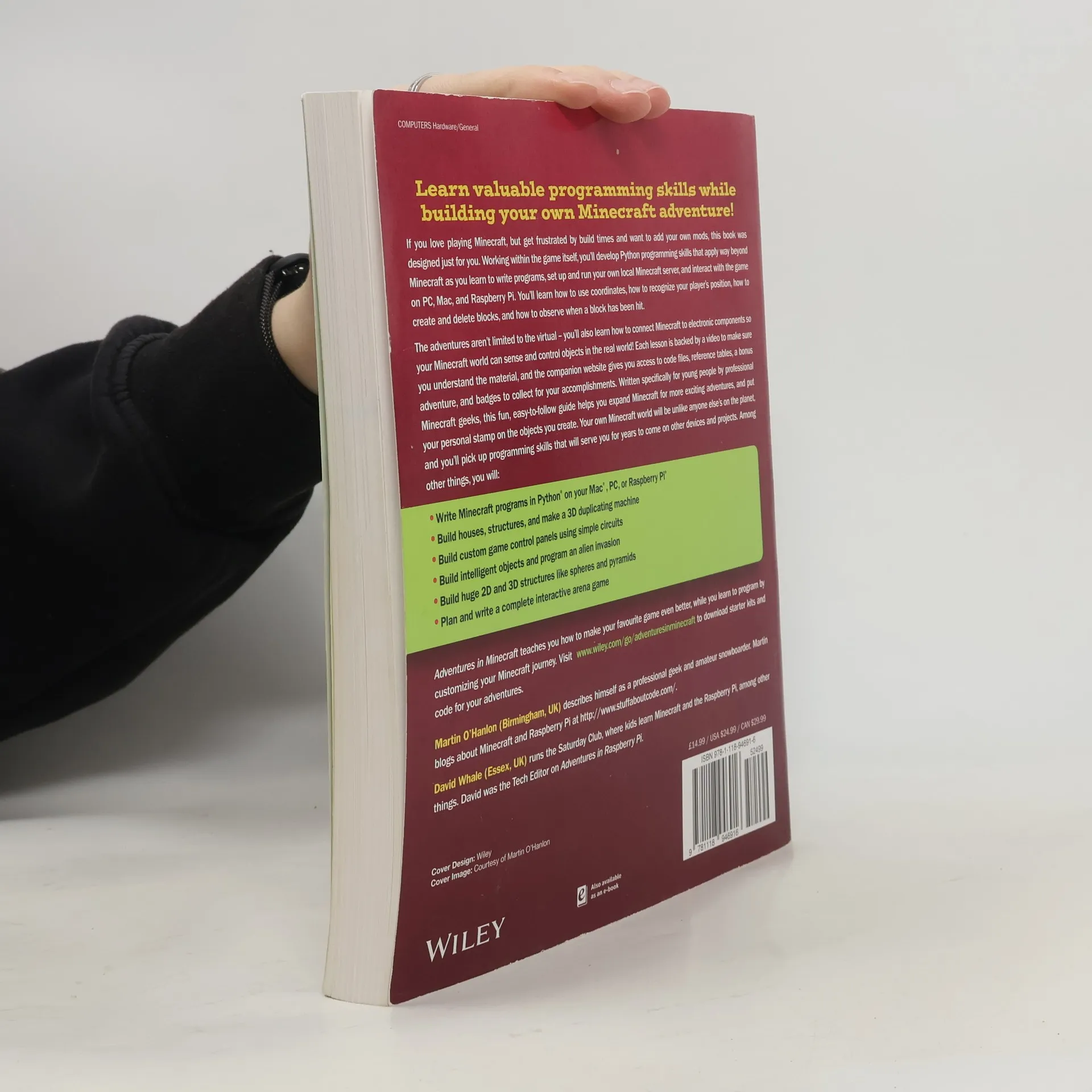 <b>Here's your ticket to a world of adventures with Minecraft and programming.</b> Learn how to extend Minecraft and create a new gaming experience, by exploring the magical world of Minecraft programming. Adventures in Minecraft, like other books in the highly successful Adventures series, is written especially for 11- to 15-year-olds. With this book you will learn new programming skills while having fun with Minecraft! Minecraft programming experts David Whale and Martin O'Hanlon walk you step-by-step through everything you need to know to: Get started writing Minecraft programs in Python on your PC, Mac, or Raspberry Pi Build houses and other structures in the blink of an eye, and make a 3D duplicating machine Write interactive games like a field that charges you rent, and a treasure hunt using magic vanishing bridges Build custom game control panels using simple electronic circuits Easily build huge 2D and 3D structures such as spheres and pyramids Build intelligent objects like a massive Minecraft clock, and program an alien invasion Plan and write a complete interactive arena game Using the programming skills you learn from this book, writing Minecraft programs offers endless possibilities to create anything you can imagine. To make your journey that much easier, the Adventures in Minecraft companion website supplies you with a video for each adventure in the book, downloadable code files, helpful programming reference tables, a bonus adventure, and badges to collect for your Minecraft accomplishments. By day, David Whale and Martin O'Hanlon are software engineers who design computer products. By night, they play Minecraft and develop exciting new programs that interact with the Minecraft world. They both work regularly with young people in schools, computing clubs and at community events, giving talks about Minecraft programming and running programming workshops.