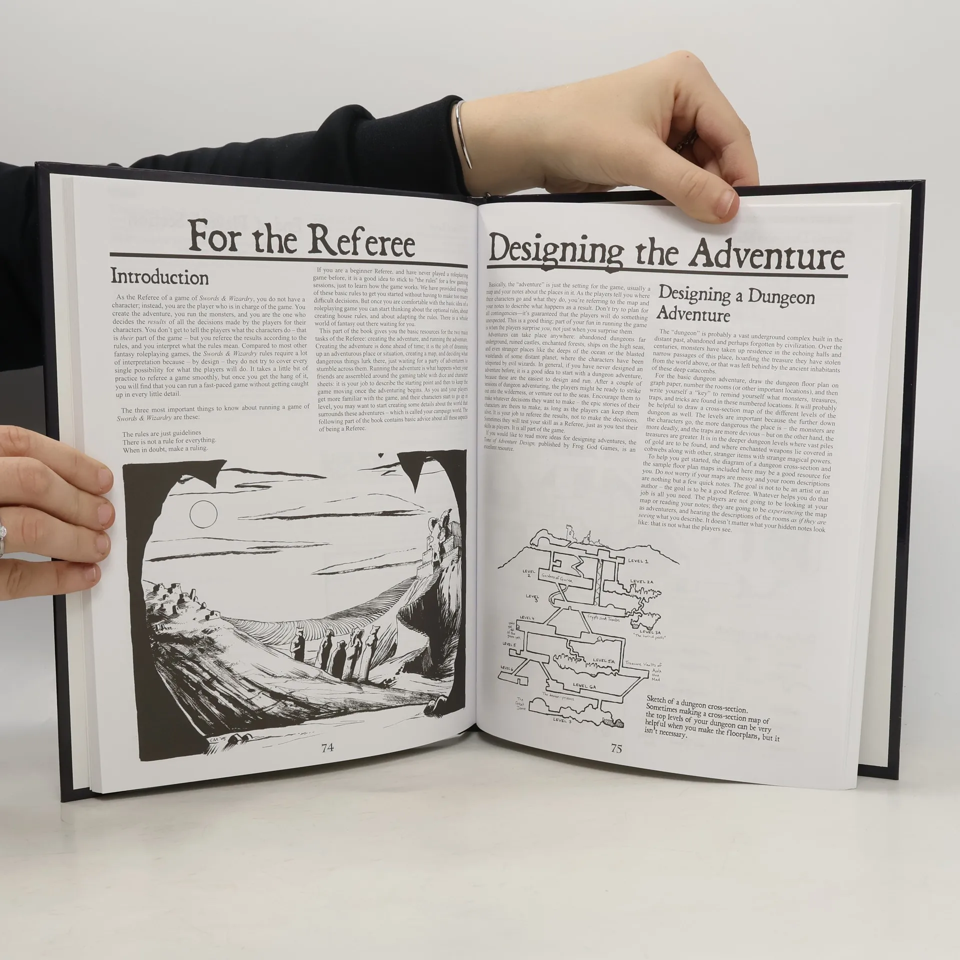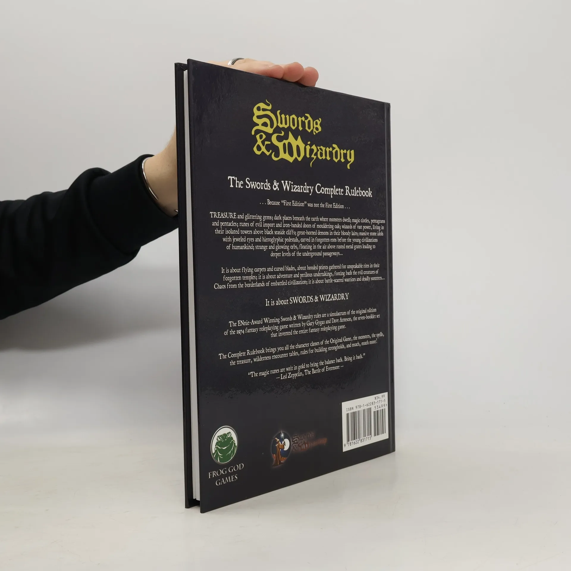 This book expands the Swords and Wizardry Core Rules to cover all of the early phase supplements from the 1970's. It creates a 1-volume resource allowing the players and game masters alike to create and run adventures and campaigns that will last for an entire lifetime. The game is supported by a vast array of adventures, and other resources that are produced by Frog God Games. This is the game you played 20 years ago. It's true to the original style and philosophy that made the game great. No "Spot Checks" here. Simple, flexible rules that allow players and game masters alike to roll play and roleplay. This stand-alone tome provides all the rules you need to play the game. Its easily transferable as a rules set for other retro-clone games as well as those old dusty modules you still have in the attic. In 1974, Gary Gygax (1938-2008) and Dave Arneson (1947-2009) wrote the world's first fantasy role-playing game, a simple and very flexible set of rules that launched an entirely new genre of gaming. In the year 2000, Wizards of the Coast, Inc. (holder of the "Dungeons & Dragons" trademark) released the "Open Game License," which allows third parties, like us, to use various intellectual properties historically associated with the Dungeons & Dragons game - although not the actual trademarked name itself, and with specific terms and restrictions. The Swords & Wizardry rules are extremely short, compared to the multi-paged rule-libraries required to play most modern role-playing games. Yet this game contains within itself all the seeds and soul of mythic fantasy, the building blocks of vast complexity, the kindling of wonder. "Edition Zero" is so powerful because it's encapsulated in a small formula, like a genie kept imprisoned in the small compass of an unremarkable lamp. Take this framework, and then imagine the hell out of it!"