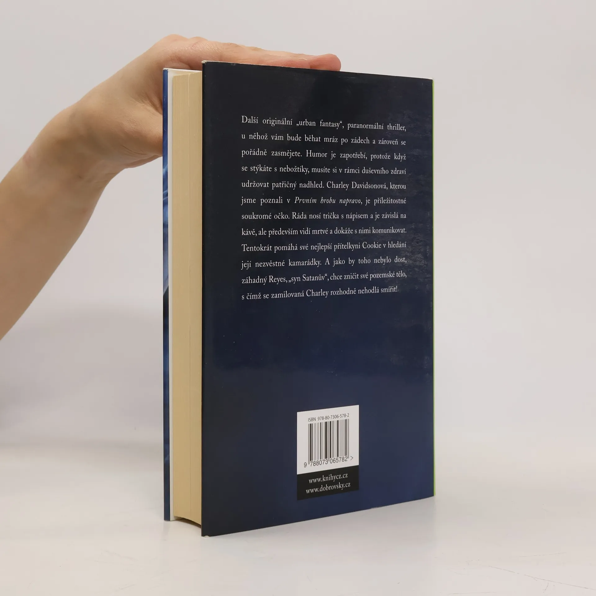 Další originální „urban fantasy“, paranormální thriller, u něhož vám bude běhat mráz po zádech a zároveň se pořádně zasmějete. Humor je zapotřebí, protože když se stýkáte s nebožtíky, může vám to zkomplikovat život. Charley Davidsonová, kterou jsme poznali v Prvním hrobu napravo, je příležitostné soukromé očko a pracuje se zesnulými na plný úvazek. Tentokrát se snaží pomoct své nejlepší přítelkyni Cookie v hledání její nezvěstné kamarádky. A jako by toho nebylo dost, záhadný Reyes, „syn Satanův“, opustil své pozemské tělo a teď za Charley chodí jako duch. Je to nezbytné, protože jedině tak se podaří Charley ochránit před temnými démony, kteří jsou mnohem otravnější než mrtví lidé!