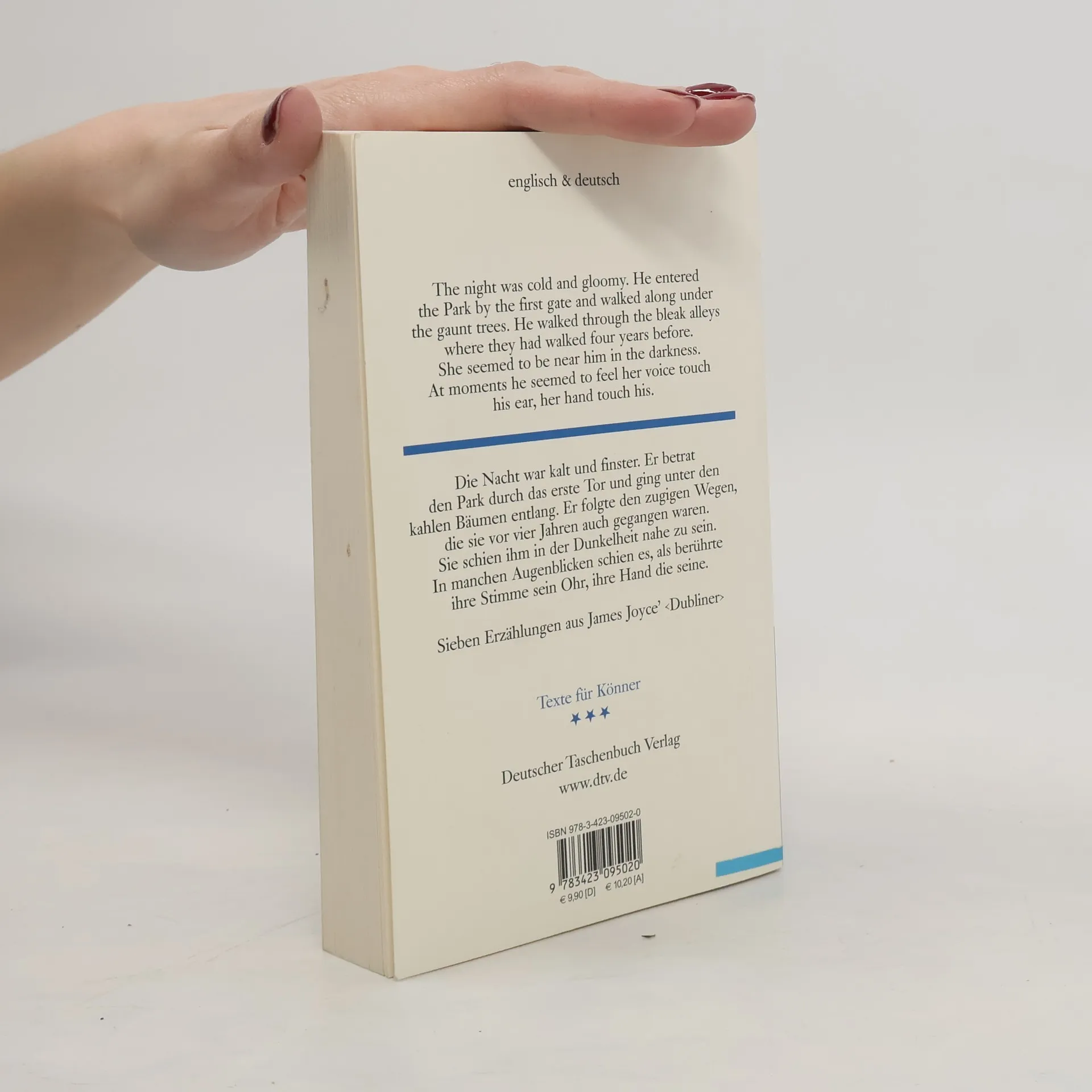 Menschen am Rande der Gesellschaft Die ›Dublin Stories‹ gelten als Türöffner zum Werk von James Joyce, einem der sprachgewaltigsten Dichter der Moderne. Die fesselnden und zuweilen irritierenden Erzählungen von Menschen am Rande der Gesellschaft, von denen hier eine Auswahl vorliegt, fügen sich zu einem Kaleidoskop Dublins zu Beginn des 20. Jahrhunderts. Und wo es nicht ganz leichtfällt, die kraftvolle und unverwechselbare Sprache des Originals zu verstehen, hilft die deutsche Übersetzung weiter. dtv zweisprachig – Die Vielfalt der Sprachen auf einen Blick Die Reihe umfasst drei Sprach-Niveaus – Einsteiger, Fortgeschrittene und Könner – und mittlerweile über 130 Titel in vielen Sprachen. Landeskunde, Kulturgeschichte und Redewendungen, zeitgenössische und klassische Texte in unterschiedlichen Formen und Genres – von der Kurzgeschichte bis zum Krimi – für jeden Lesegeschmack ist etwas dabei. Einzigartig ist die konsequente Zeilengleichheit zwischen Originaltext und Übersetzung, damit man vom ersten bis zum letzten Wort in zwei Sprachwelten zuhause ist.