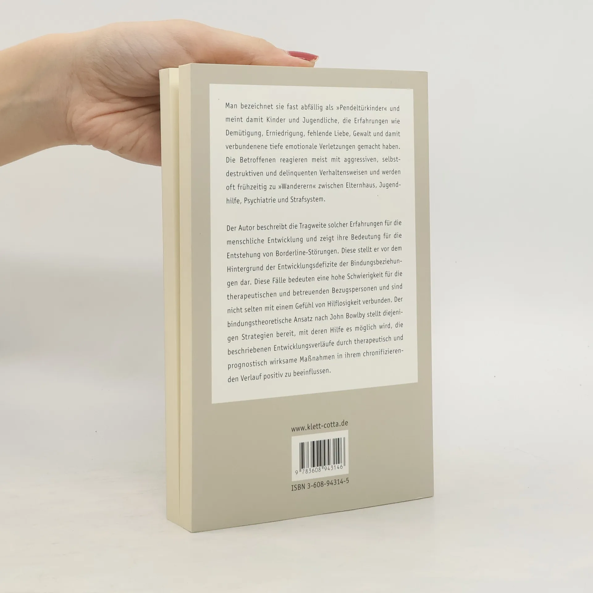 Man bezeichnet sie fast abfällig als Pendeltürkinder und meint damit Kinder und Jugendliche, die Demütigungen, Erniedrigung, fehlende Liebe, Gewalt und damit verbundenene tiefe emotionale Verletzungen erfahren haben. Die Betroffenen reagieren meist mit aggressiven, selbstdestruktiven und delinquenten Verhaltensweisen und werden oft schon frühzeitig zu Wanderern zwischen Elternhaus, Jugendhilfe, Psychiatrie und Strafsystem. Der Autor beschreibt die Tragweite solcher Erfahrungen für die menschliche Entwicklung und zeigt ihre Bedeutung für die Entstehung von Borderline-Störungen. Diese stellt er vor dem Hintergrund der Entwicklungsdefizite der Bindungsbeziehungen dar und berücksichtigt dabei das gesamte Spektrum von der frühen primären Bindung bis hin zur Störung der Beziehungs- und Identitätsentwicklung im Kindes- und Jugendalter. Die Besonderheiten dieser Fälle stellen die therapeutischen und betreuenden Bezugspersonen oftmals vor extreme Schwierigkeiten, die in einem Gefühl von Hilflosigkeit enden; Bindungsabbrüche durch die betroffenen Kinder und Jugendlichen sind nicht selten die Folge. Der bindungstheoretische Ansatz nach John Bowlby stellt diejenigen Strategien bereit, mit deren Hilfe es möglich wird, die beschriebenen Entwicklungsverläufe durch therapeutisch und prognostisch wirksame Maßnahmen in ihrem chronifizierenden Verlauf positiv zu beeinflussen. Darüber hinaus vermittelt das Buch aus bindungstheoretischer Sicht eigene Erfahrungen des Autors, die ein feinfühliges, haltgebendes bzw. aushaltendes und damit sicheres therapeutisches Bindungsverhalten ermöglichen sollen.