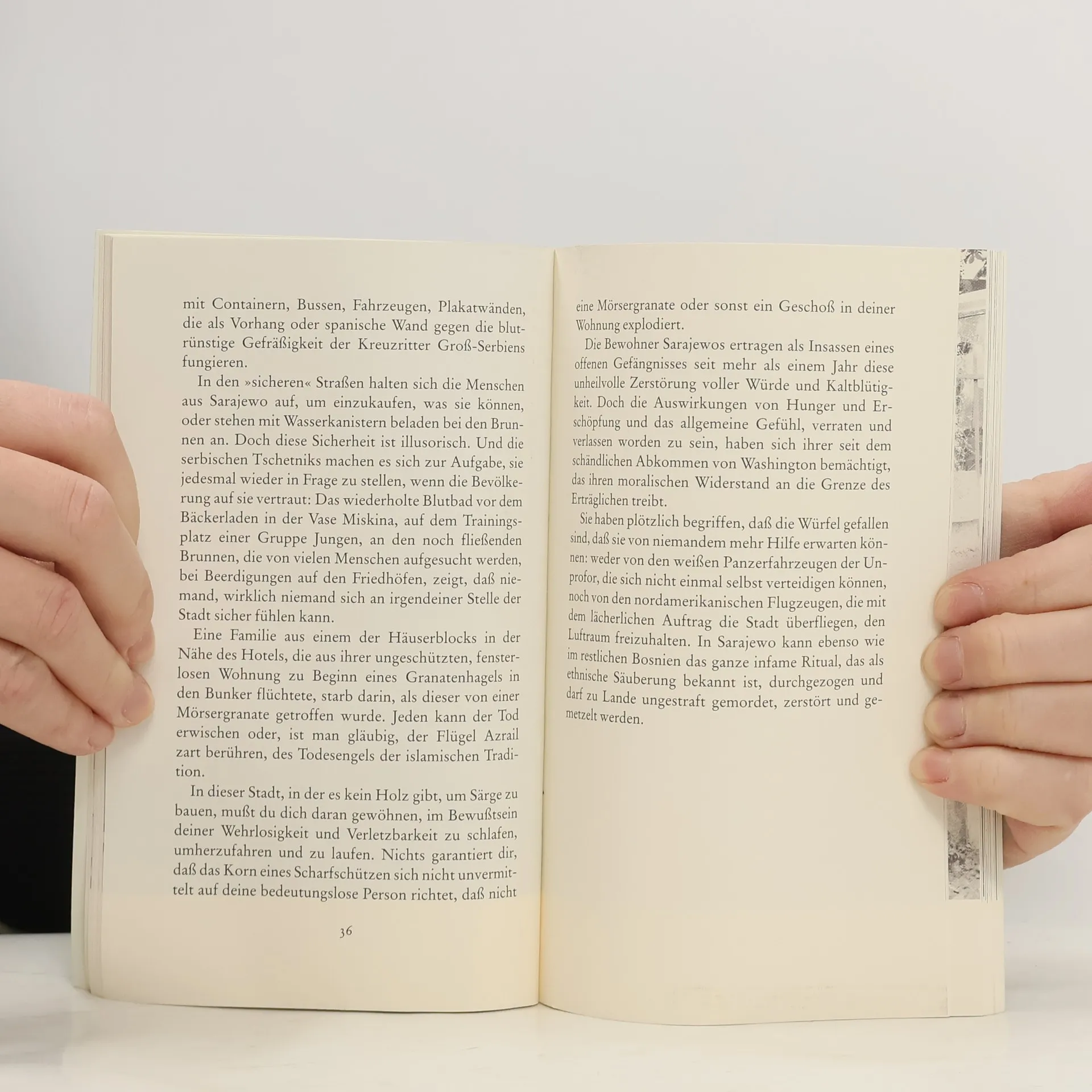 Juan Goytisolo verbrachte einige Zeit in dem von serbischen Truppen eingeschlossenen Sarajewo und berichtet in neun Folgen - die in zahlreichen Zeitungen veröffentlicht wurden - vom täglichen Terror und der Verzweiflung der Bewohner, die sich vom restlichen Europa und den Vereinten Nationen im Stich gelassen fühlen. Goytisolo leiht den Opfern seine Stimme und versucht eine Annäherung an das Unbeschreibbare. Seine Notizen aus Sarajewo sind ein Aufruf an die Welt, sich ihrer Verantwortung bewußt zu werden, sie sind „ein Akt persönlicher Zeugenschaft angesichts eines kollektiven Verbrechens in der Mitte Europas“, so die Frankfurter Rundschau, die diese Artikel zuerst publizierte.