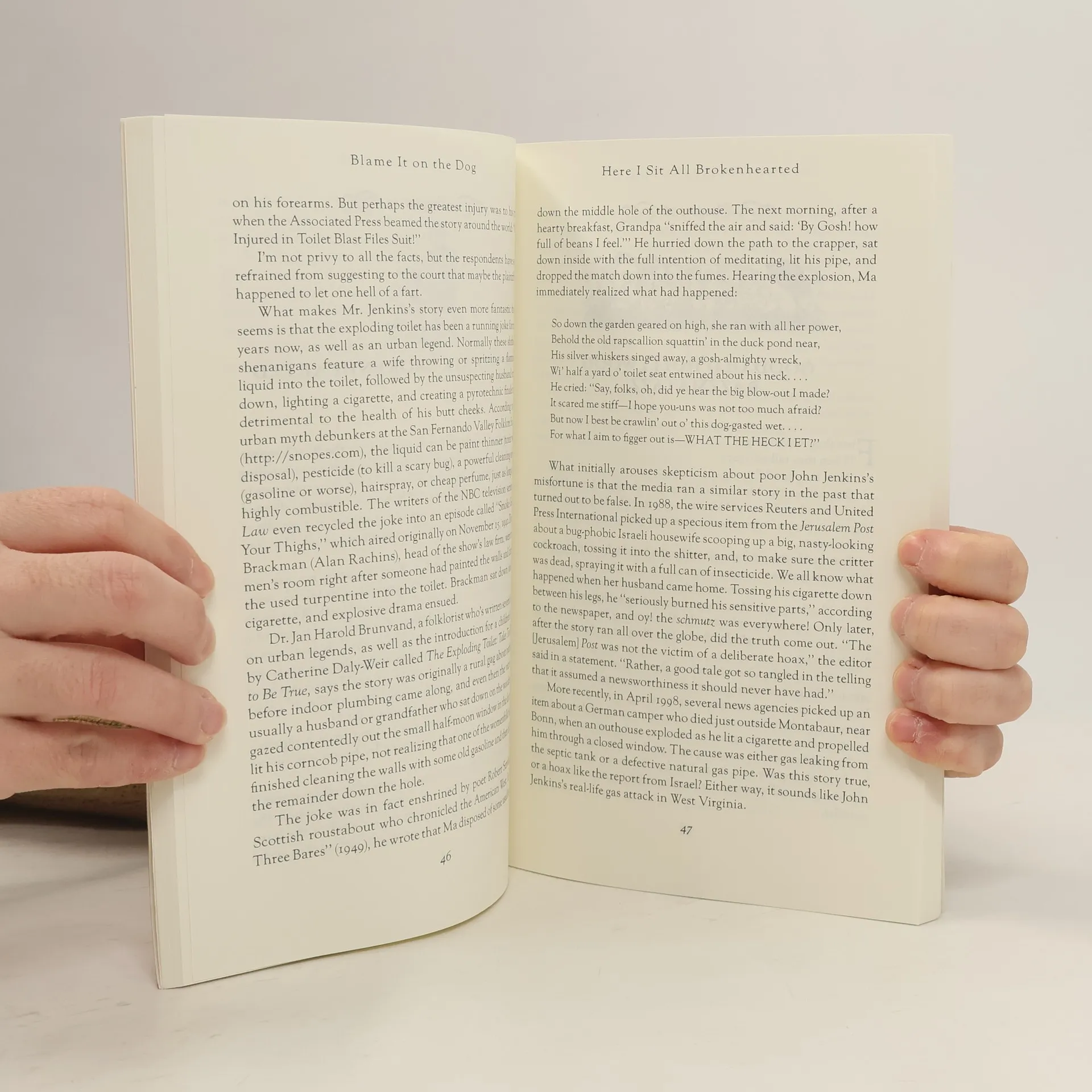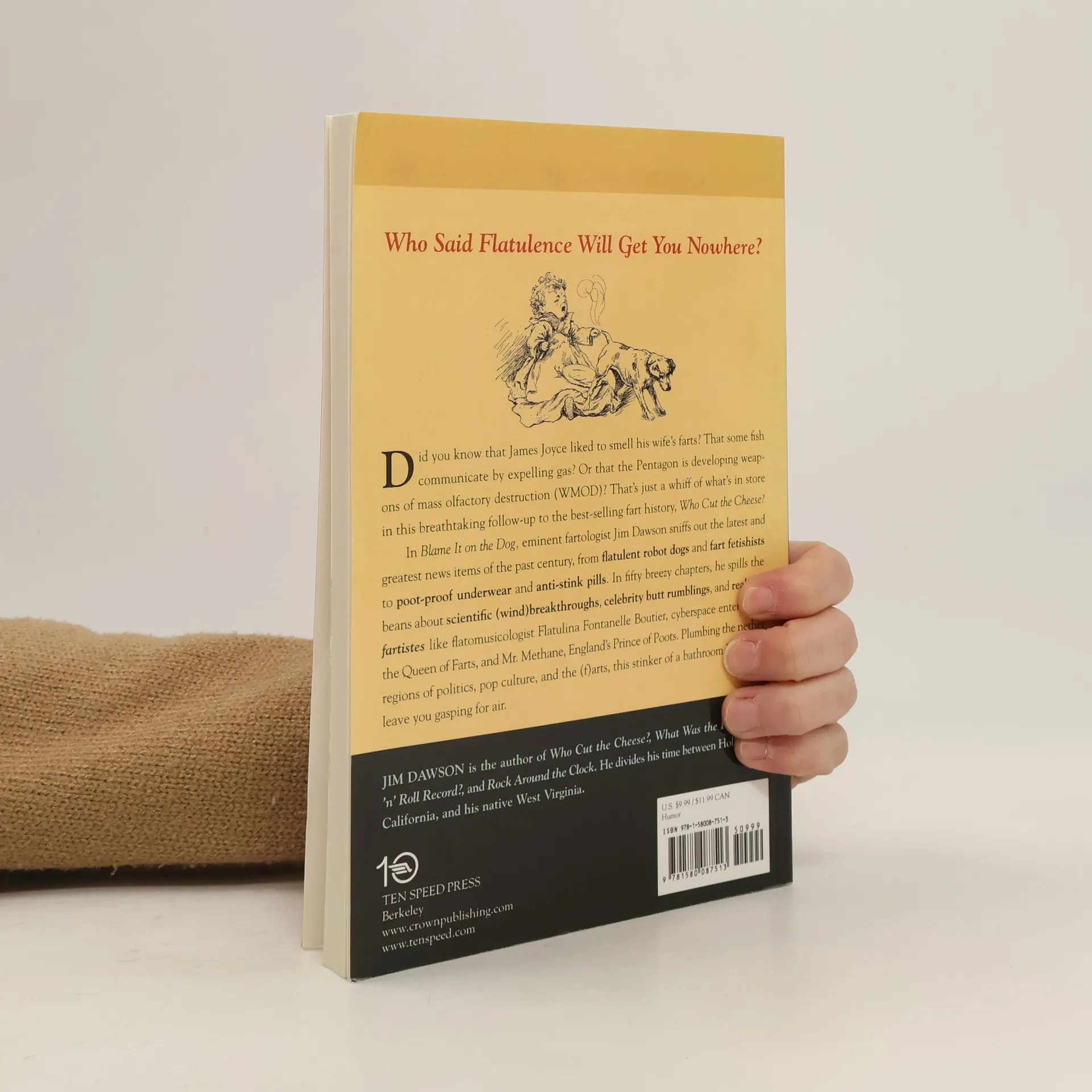 Did you know that James Joyce liked to smell his wife's farts? That some fish communicate by expelling gas? Or that the Pentagon is developing weapons of mass olfactory destruction (WMOD)? That's just a whiff of what's in store in this breathtaking follow-up to the best-selling fart history, WHO CUT THE CHEESE?In BLAME IT ON THE DOG, eminent fartologist Jim Dawson sniffs out the latest and greatest new items of the past century, from flatulent robot dogs and fart fetishists to poot-proof underwear and anti-stink pills. In fifty breezy chapters, he spills the beans about scientific (wind)breakthroughs, celebrity butt rumblings, and real-life fartistes like Flatulina Fontanelle Boutier, cyberspace entertainer the Queen of Farts, and Mr. Methane, England's Prince of Poots. Plumbing the nether regions of politics, pop culture, and the (f)arts, this stinker of a bathroom book will leave you gasping for air.