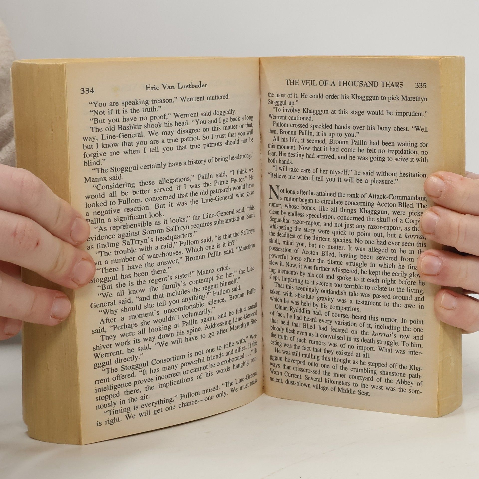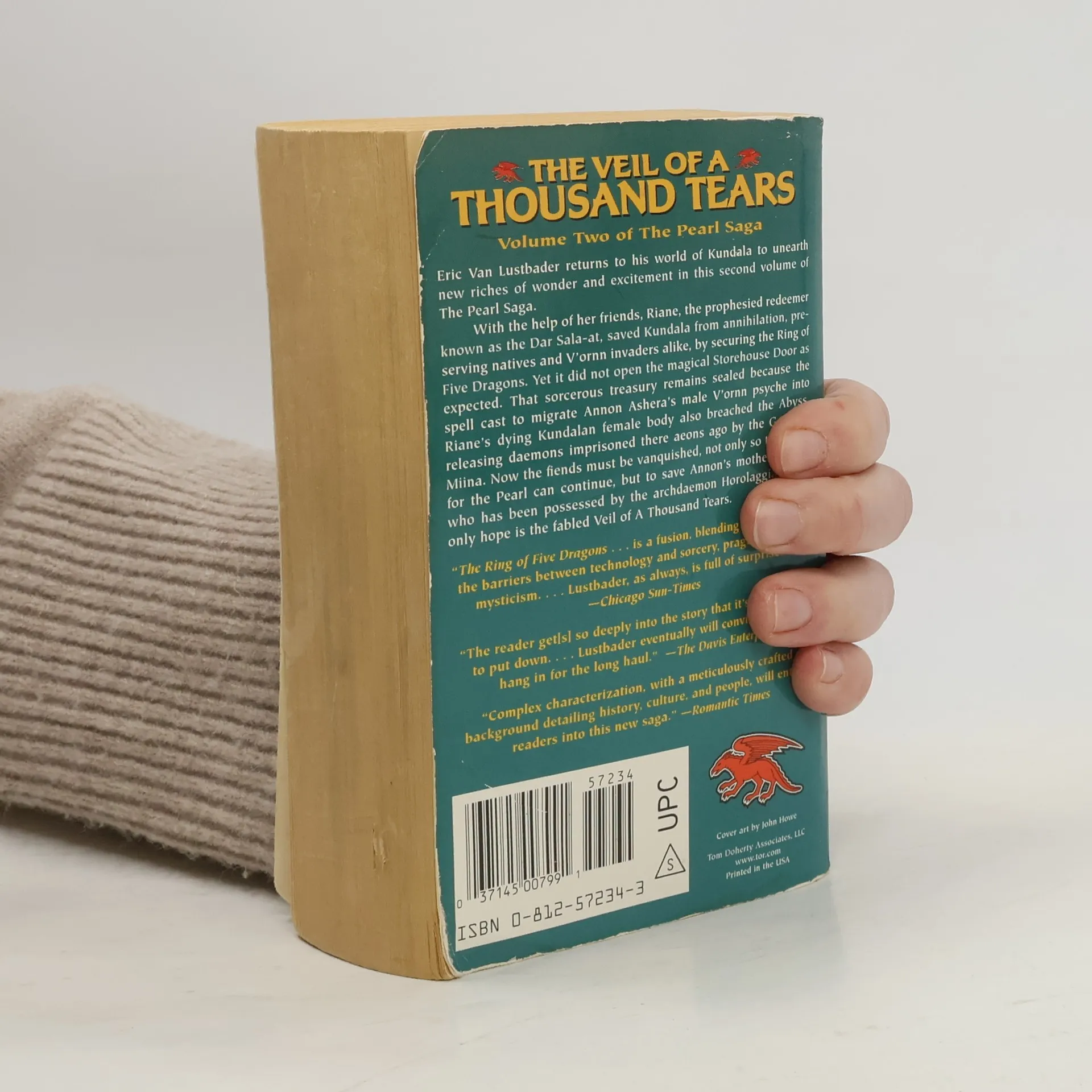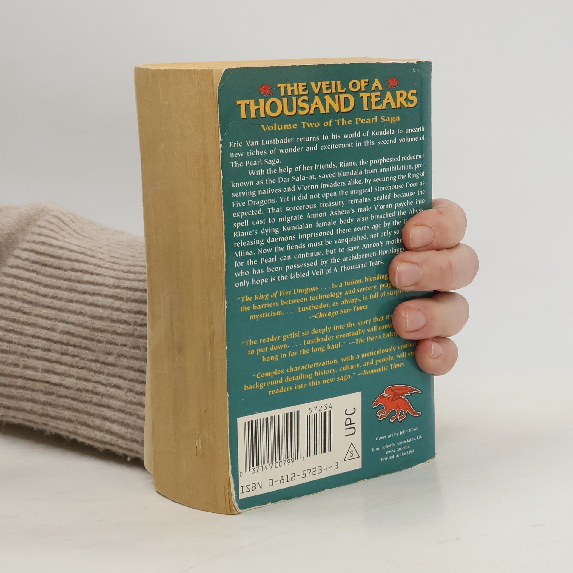 Having staked his claim as a master of epic fantasy with The Ring of Five Dragons , Eric Van Lustbader now returns to his world of Kundala to unearth new riches of wonder and excitement in this second volume of The Pearl Saga. With the help of her friends, Riane, the prophesied redeemer known as the Dar Sala-at, saved Kundala from annihilation, preserving natives and V'ornn invaders alike. Together, the companions avenged terrible crimes and secured the Ring of Five Dragons, but their struggles have only just begun. The Ring averted doomsday, yet it did not open the magical Storehouse Door as expected. That sorcerous treasury remains sealed because of the spell cast by Giyan and her sister to migrate Annon Ashera's male V'ornn psyche into Riane's dying Kundalan female body. By combining them into a single being, it saved them both and fulfilled the prophecy that the Dar Sala-at would be "born at both ends of the cosmos." But the spell also breached the Abyss, releasing daemons imprisoned there aeons ago by the Goddess Miina who could wreak havoc on Kundala. Now the fiends must be vanquished, not only so the quest for the Pearl can continue, but to save Giyan, who has been possessed by the archdaemon Horolaggia. Their only hope is the fabled Veil of A Thousand Tears.