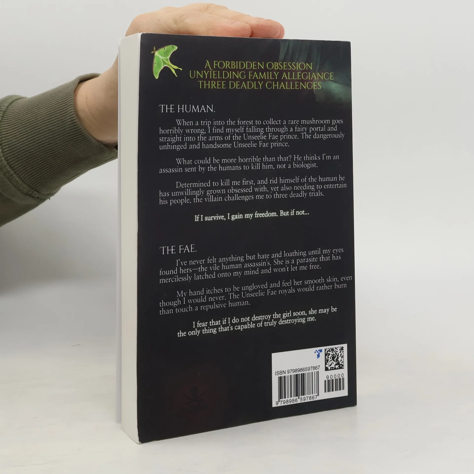 A forbidden obsessionUnyielding family allegianceThree deadly challengesTHE HUMAN. When a trip into the forest to collect a rare mushroom goes horribly wrong, I find myself falling through a fairy portal and straight into the arms of the Unseelie Fae prince. The dangerously unhinged and handsome Unseelie Fae prince. What could be more horrible than that? He thinks I'm an assassin sent by the humans to kill him, not a biologist. Determined to kill me first, and rid himself of the human he has unwillingly grown obsessed with, yet also needing to entertain his people, the villain challenges me to three deadly trials. If I survive, I gain my freedom. But if not...The Fae. I've never felt anything but hate and loathing until my eyes found hers--the vile human assassin's. She is a parasite that has mercilessly latched onto my mind and won't let me free. My hand itches to be ungloved and feel her smooth skin, even though I would never. The Unseelie Fae royals would rather burn than touch a repulsive human. I fear that if I do not destroy the girl soon, she may be the only thing that's capable of truly destroying me.