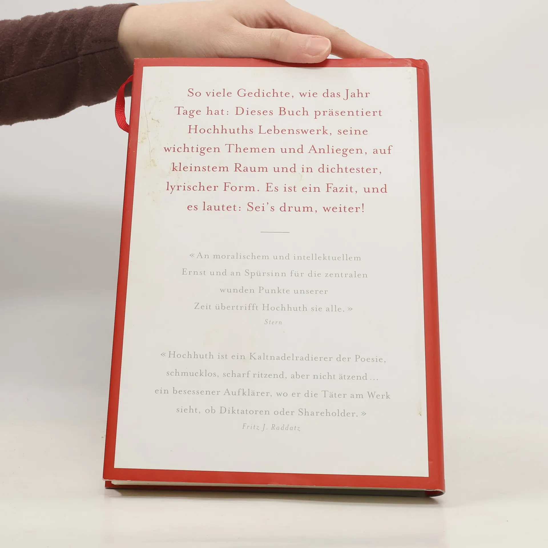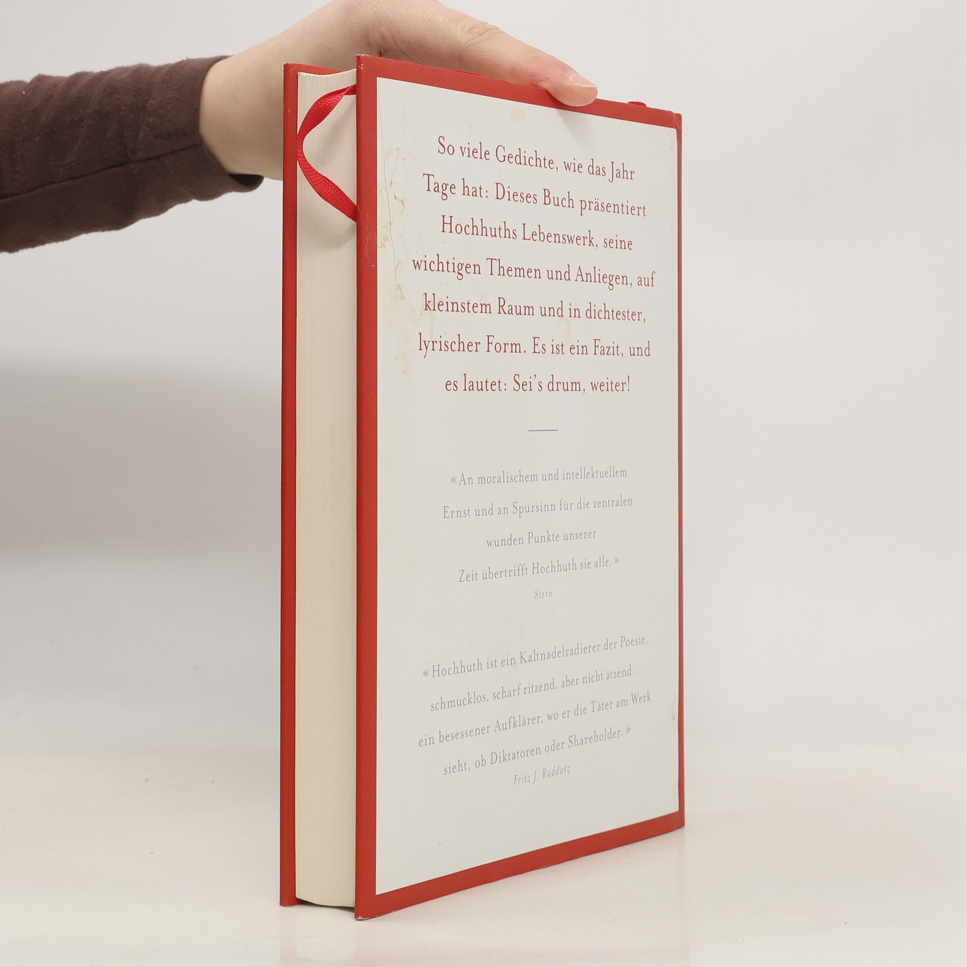 Der Dramatiker Rolf Hochhuth wurde mit seinen berühmten, politisch kämpferischen Theaterstücken eine deutsche Institution. Aber auch als Lyriker und Verfasser von Kurzprosa hat er sich einen Namen gemacht. In den vorliegenden 365 Sieben- bis Zwölfzeilern, die der Autor selbst eher als „auf den Punkt gebrachte Lebenserkenntnisse denn als Gedichte“ verstanden wissen will, schafft er eine interessante Zwischenform zwischen Lyrik und Aphoristik. Mal artistisch gereimt, mal pointierend rhythmisiert, in wagemutiger Wort- und Gedankenkombinatorik, thematisieren diese Texte ein ganzes gelebtes Jahrhundert. Liebe und Kunst sind für Hochhuth ohnehin untrennbar verbunden. Hinzu kommt sein Interesse an Philosophie, Religion und, immer wieder, an Geschichte und Politik. Die vorherrschende Haltung ist die eines anhaltenden Entsetzens im Angesicht von historischen Katastrophen und aktuellen politischen Verfehlungen, gemischt mit Mitgefühl mit deren Opfern und Zorn über die Mächtigen. Hochhuth ist ein Kämpfer, aber das Alter, die Hinfälligkeit des Körpers beweisen ihm die Vergänglichkeit alles irdischen Strebens. Und doch, wenngleich sich bisweilen ein resignativer Ton in seine Texte einschleicht, schließt er oft genug mit dem trotzigen Fazit: Sei's drum! Weiter! Das Grundbuch ist Lebensbilanz und Vademekum, ein Empörungs- und Trostbuch für den politisch denkenden und empfindenden Zeitgenossen.