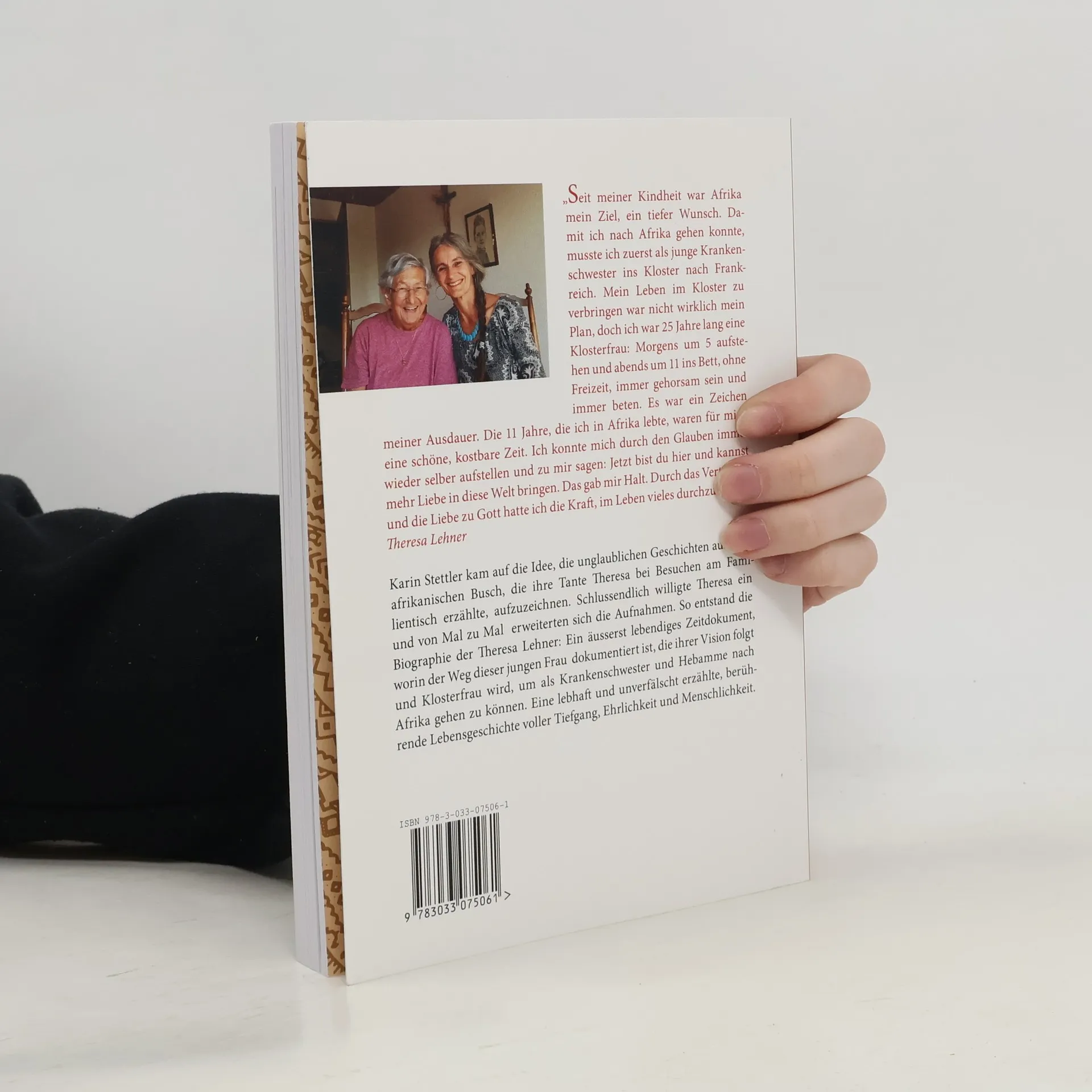 „Seit meiner Kindheit war Afrika mein Ziel, ein tiefer Wunsch. Damit ich nach Afrika gehen konnte, musste ich zuerst als junge Krankenschwester ins Kloster nach Frankreich. Mein Leben im Kloster zu verbringen war nicht wirklich mein Plan, doch ich war 25 Jahre lang eine Morgens um 5 aufstehen und abends um 11 ins Bett, ohne Freizeit, immer gehorsam sein und immer beten. Es war ein Zeichen meiner Ausdauer. Die 11 Jahre, die ich in Afrika lebte, waren für mich eine schöne, kostbare Zeit. Ich konnte mich durch den Glauben immer wieder selber aufstellen und zu mir Jetzt bist du hier und kannst mehr Liebe in diese Welt bringen. Das gab mir Halt. Durch das Vertrauen und die Liebe zu Gott hatte ich die Kraft, im Leben vieles durchzustehen.“ Theresa Lehner Karin Stettler kam auf die Idee, die unglaublichen Geschichten aus dem afrikanischen Busch, die ihre Tante Theresa bei Besuchen am Familientisch erzählte, aufzuzeichnen. Schlussendlich willigte Theresa ein und von Mal zu Mal erweiterten sich die Aufnahmen. So entstand die Biographie der Theresa Ein äusserst lebendiges Zeitdokument, worin der Weg dieser jungen Frau dokumentiert ist, die ihrer Vision folgt und Klosterfrau wird, um als Krankenschwester und Hebamme nach Afrika gehen zu können. Eine lebhaft und unverfälscht erzählte, berüh- rende Lebensgeschichte voller Tiefgang, Ehrlichkeit und Menschlichkeit.