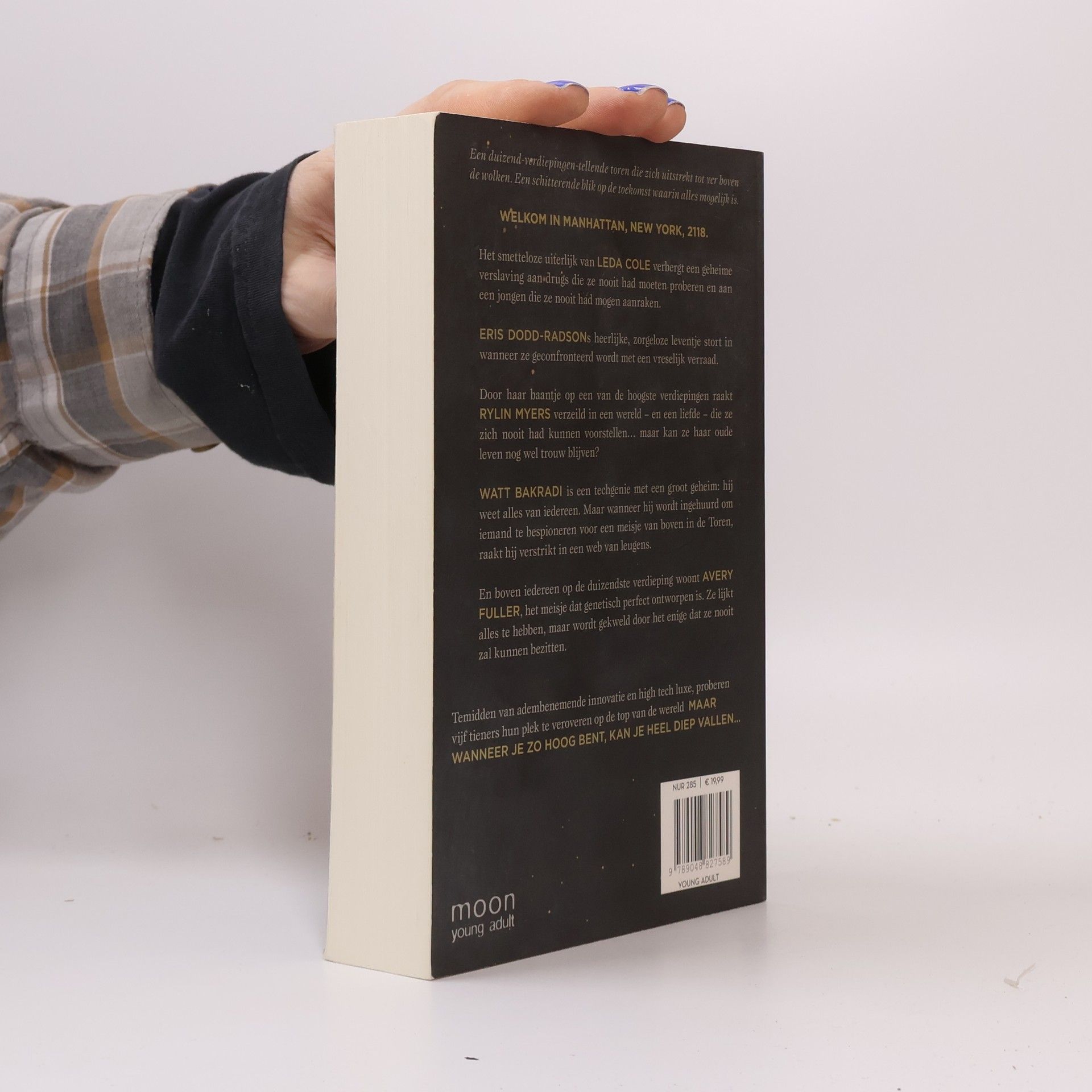 Een duizend-verdiepingen-tellende toren die zich uitstrekt tot ver boven de wolken. Een schitterende blik op de toekomst waarin alles mogelijk is. Welkom in Manhattan, New York, 2118. Het smetteloze uiterlijk van LEDA COLE verbergt een geheime verslaving aan drugs die ze nooit had moeten proberen en aan een jongen die ze nooit had mogen aanraken. ERIS DODD-RADSONs heerlijke, zorgeloze leventje stort in wanneer ze geconfronteerd wordt met een vreselijk verraad. Door haar baantje op een van de hoogste verdiepingen raakt RYLIN MYERS verzeild in een wereld – en een liefde – die ze zich nooit had kunnen voorstellen… maar kan ze haar oude leven nog wel trouw blijven? WATT BAKRADI is een techgenie met een groot geheim: hij weet alles van iedereen. Maar wanneer hij wordt ingehuurd om iemand te bespioneren voor een meisje van boven in de Toren, raakt hij verstrikt in een web van leugens. En boven iedereen op de duizendste verdieping woont AVERY FULLER, het meisje dat genetisch perfect ontworpen is. Ze lijkt alles te hebben, maar wordt gekweld door het enige dat ze nooit zal kunnen bezitten. Temidden van adembenemende innovatie en high tech luxe, proberen vijf tieners hun plek te veroveren op de top van de wereld. Maar wanneer je zo hoog bent, kan je heel diep vallen…