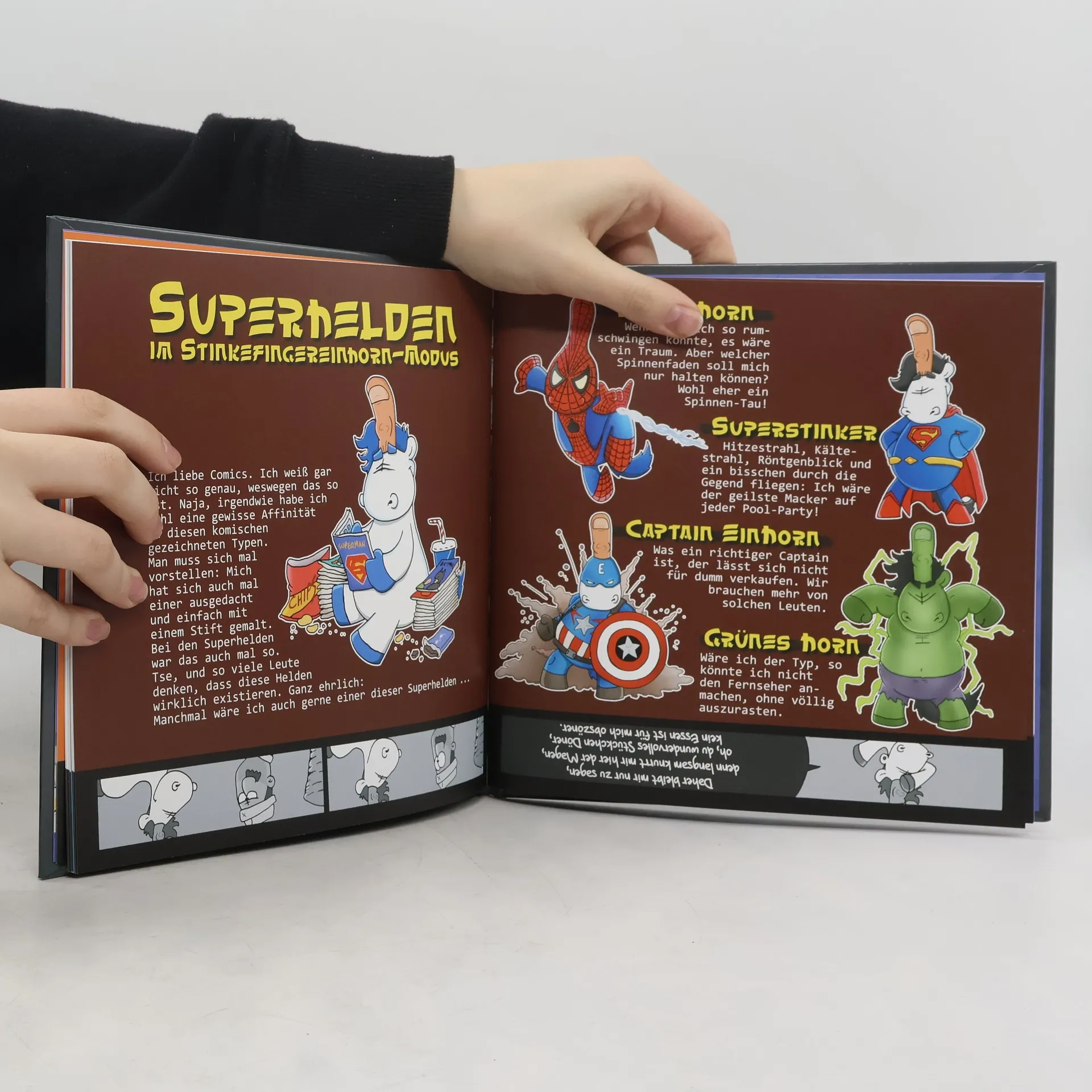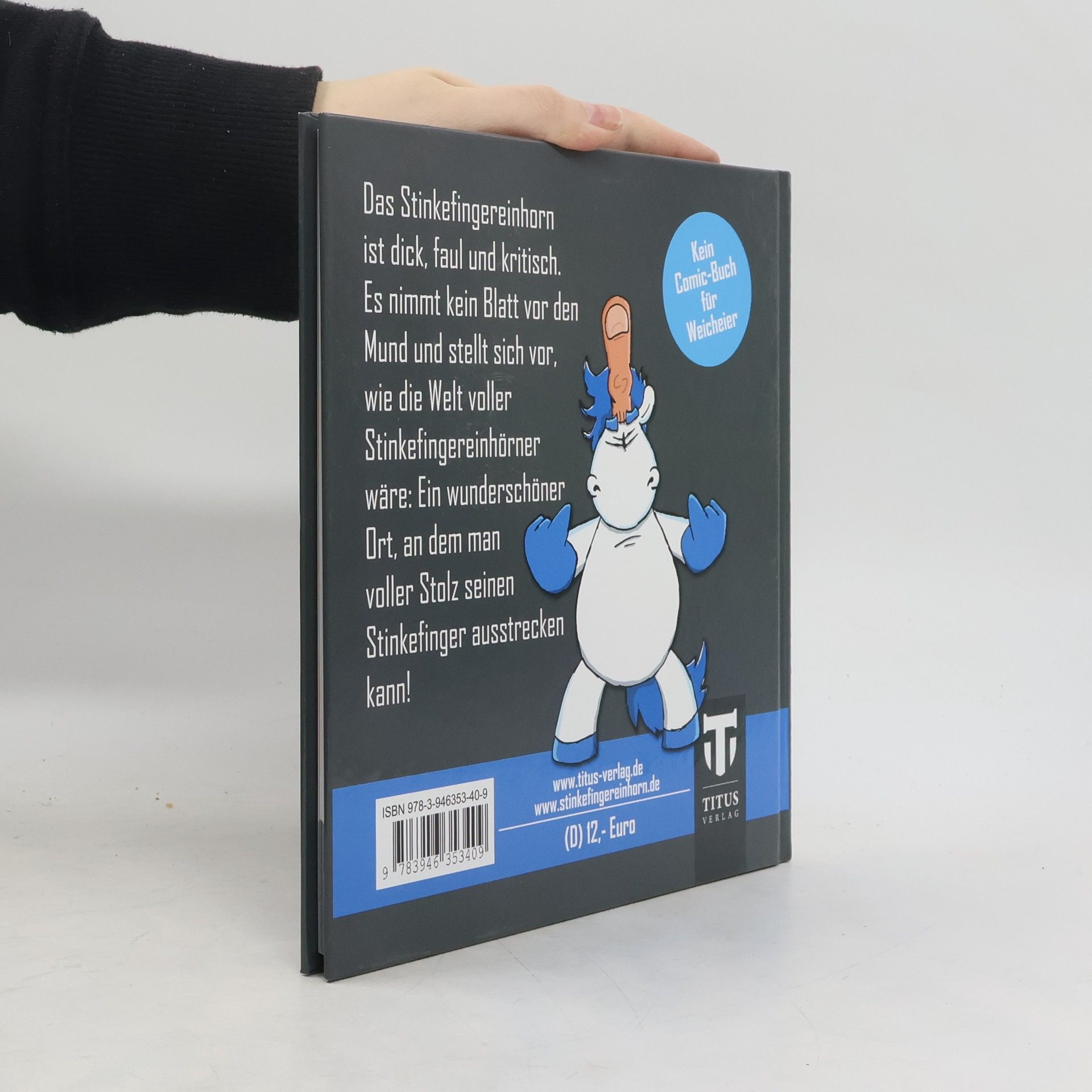 Das Stinkefingereinhorn ist dick, faul und kritisch. Es nimmt kein Blatt vor den Mund und stellt sich vor, wie die Welt voller Stinkefingereinhörner wäre: Ein wunderschöner Ort, an dem man voller Stolz seinen Stinkefinger ausstrecken kann! Dies ist kein Buch für Weicheeier!