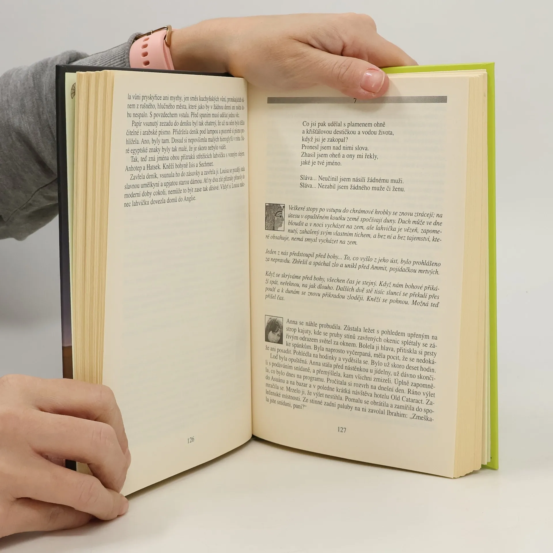 Napínavý děj má tentokrát dokonce tři časové roviny: staroegyptskou, viktoriánskou a soudobou. Současná hrdinka Anna, hledající po rozvodu novou životní náplň i novou lásku, cestuje do Egypta s praprababiččniným deníkem, díky němuž ožívá romantický příběh z 19. století. Elixír tajuplných zápletek a dojemné milostné tematiky je pro čtenáře.