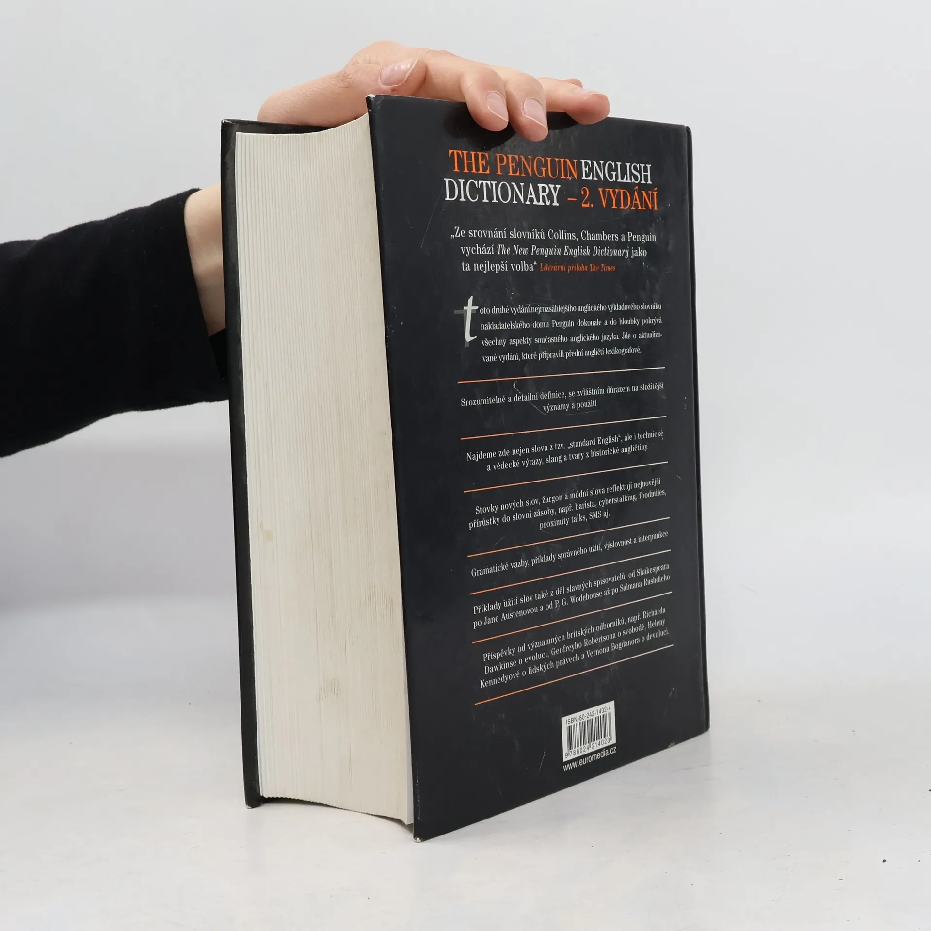Ze srovnání slovníků Collins, Chambers a Penguin vychází The New Penguin English Dictionary jako ta nejlepší volba" Literární příloha The Times Toto druhé vydání nejrozsáhlejšího anglického výkladového slovníku nakladatelského domu Penguin dokonale a do hloubky pokrává všechny aspekty současného anglického jazyka. Jde o aktualizované vydání, které připravili přední angličtí lexikografové. Srozumitelné a detailní definice, se zvláštním důrazem na složitější významy a použití Najdeme zde nejen slova z tzv. "standard English", ale i technické a vědecké výrazy, slang a tvary z historické angličtiny. Stovky nových slov, žargon a módníslova reflektující nejnovější přírůstky do slovní zásoby, např. barista, cyberstalking, foodmiles, proximity talks, SMS aj. Gramatické vazby, příklady správného užití, výslovnost a interpunkce Příklady užití slov také z děl slavných spisovatelů, od Shakespeara po Jane Austenovou a od P. G. Wodehouse až po Salmana Rushdieho Příspěvky od významných britských odborníků, např. Richarda Dawkinse o evoluci, Geofreyho Robertsona o svobodě, Heleny Kennedyové o lidských právech a Vernona Bogdanora o devoluci.