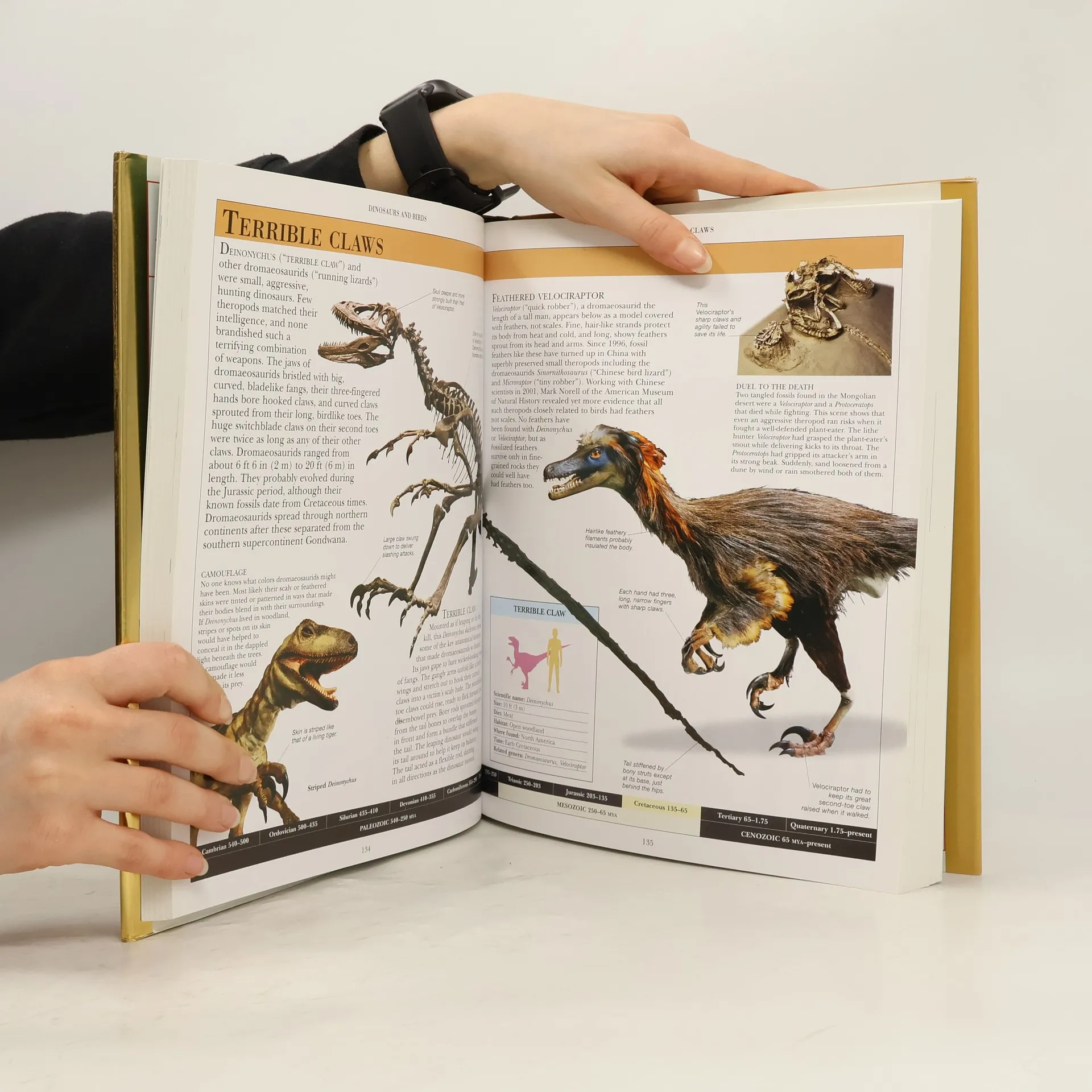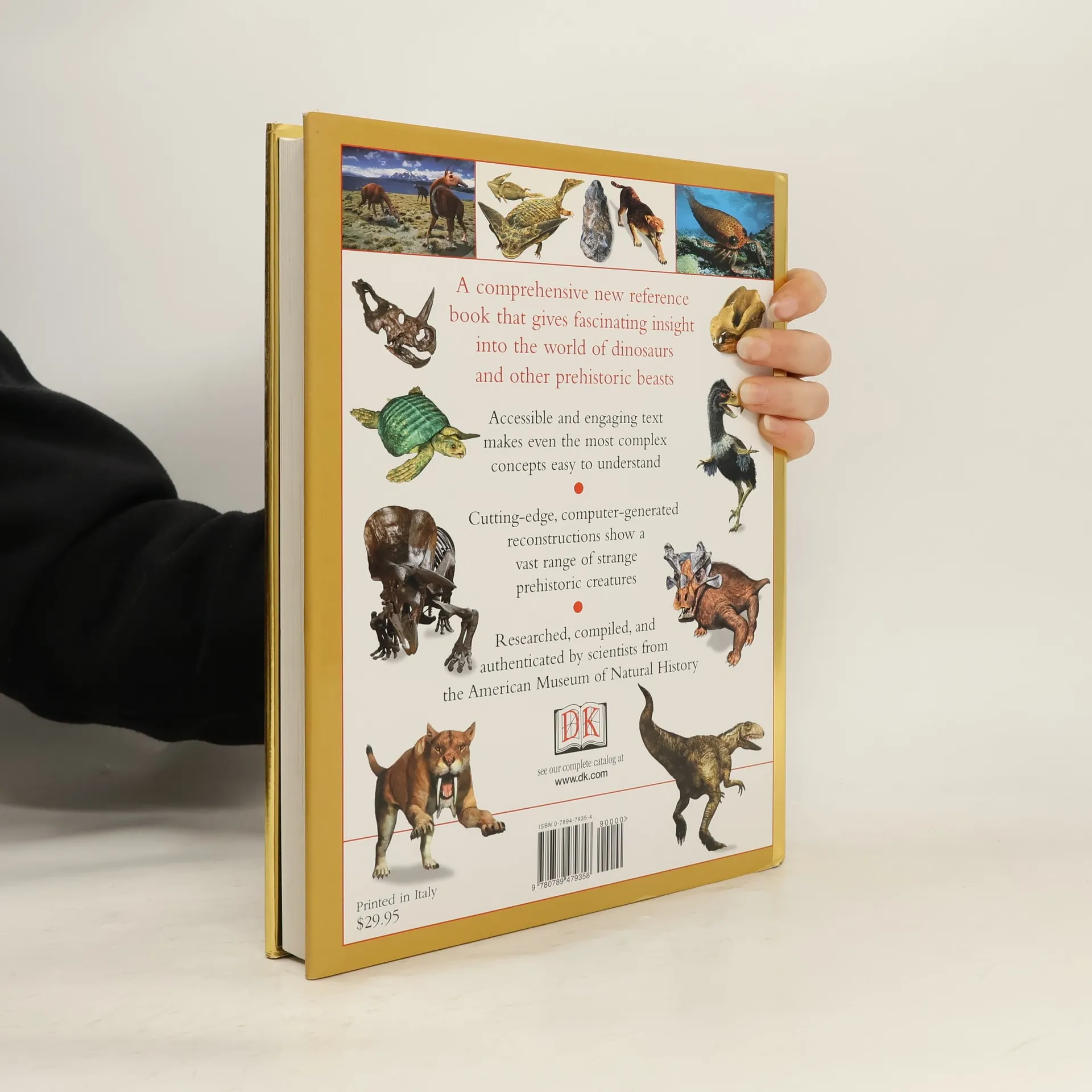 A comprehensive new reference book that gives fascinating insight into the world of dinosaurs and other prehistoric beasts. Researched and compiled by a team of experts in dinosaurs and other prehistoric life, DK's Dinosaur Encyclopedia answers thousands of intriguing questions about the dangerous world of dinosaurs. It presents an amazing variety of creatures, including early flying reptiles, the first fist, and the ape-like animals that set the scene for the evolution of the first humans. See the ferocious T-rex battle a gentle therizinosaur, or witness a giant, ground-dwelling bird chasing an early horse -- frighteningly realistic models and exceptional photography transport you straight into this ancient and terrifying world. Magnificent full-page reconstructions of prehistoric environments show these fascinating creatures in their natural habitats, from the Silurian seas to the grasslands of Pliocene America. This superb encyclopedia is divided into sections according to cladistics, making it easy to understand how different groups of animals evolved from common ancestors. A useful introduction provides an overview to understand fossils and evolution, followed by extensive sections covering different groups of prehistoric animals. Easy-to-use timeline bars on each page allow quick identification of the time period featured. At-a-glance scale indicators and fact boxes combine to provide the essentials on the prehistoric world. In addition, there is a comprehensive reference section providing a survey of the geological timescale, a biography section covering leading paleontologists, and an accessible glossary and index, making this a truly remarkable and compelling guide to all things prehistoric.