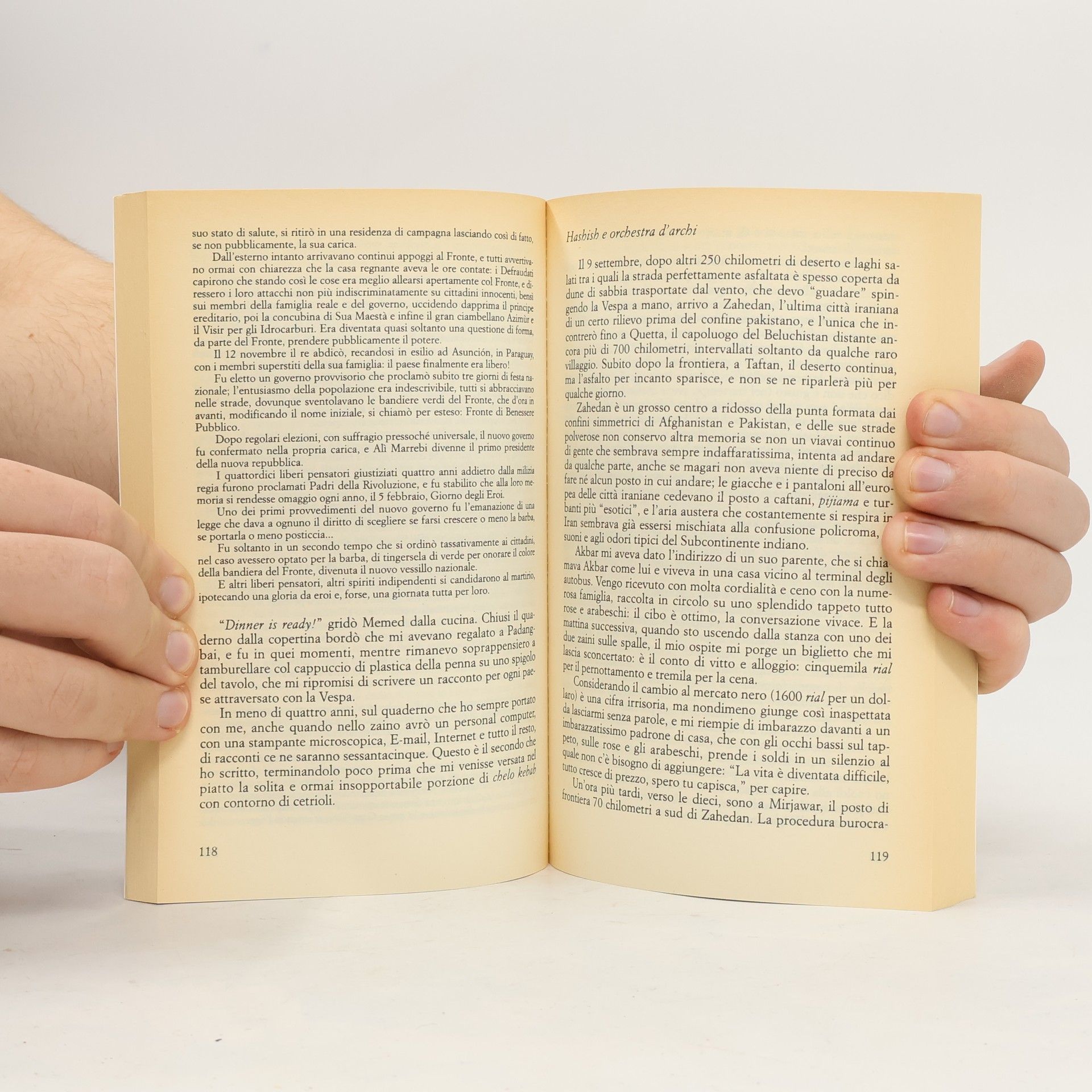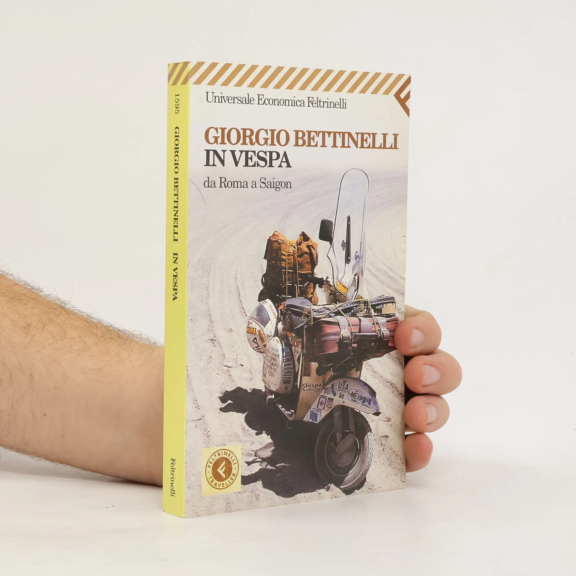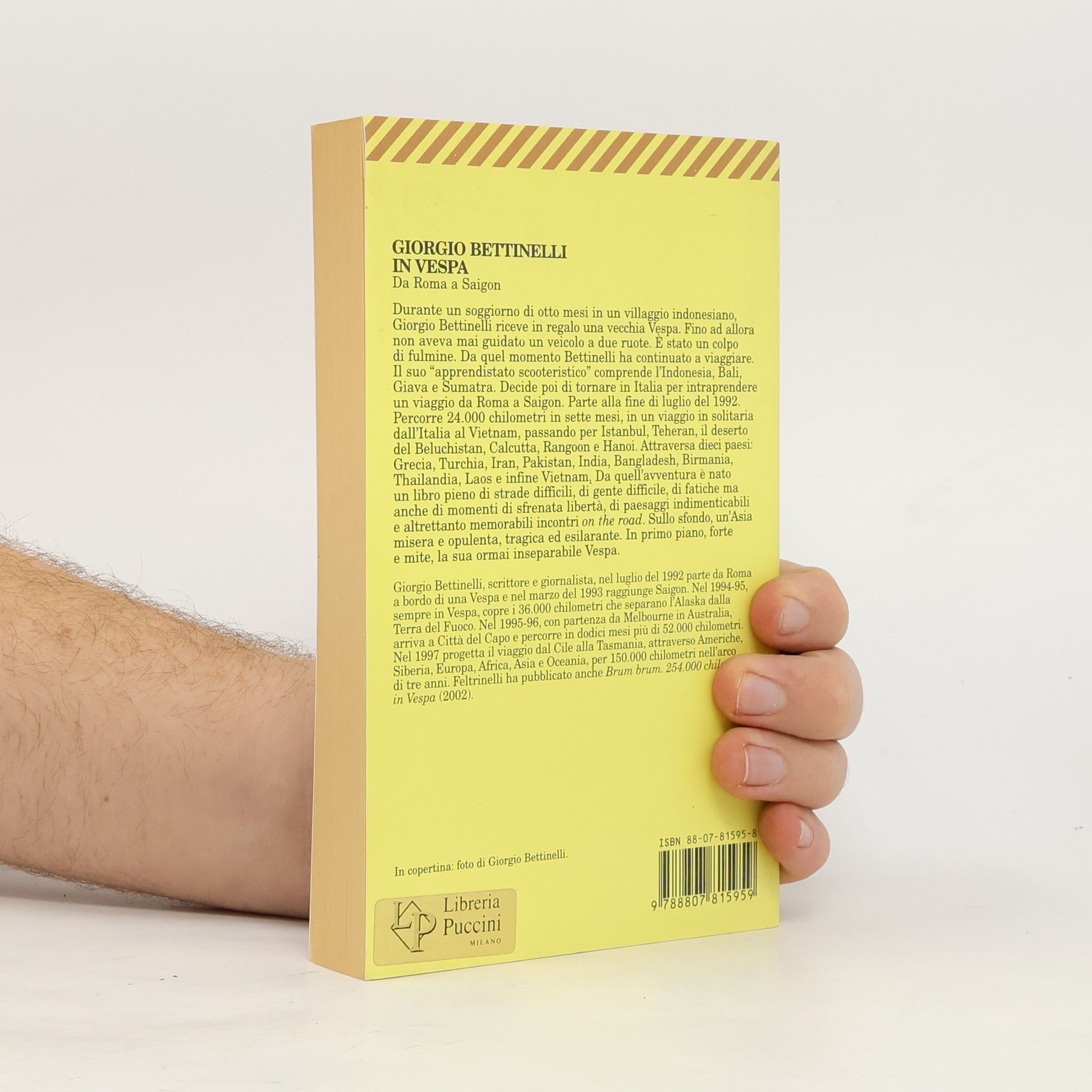 Durante un soggiorno di otto mesi in un villaggio indonesiano, Giorgio Bettinelli riceve in regali una vecchia Vespa. Fino ad allora non aveva mai guidato un veicolo a due ruote. E stato un colpo di fulmine. Da quel momento ha continuato a viaggiare. Il suo 'apprendimento scooteristico' comprende l'Indonesia, Bali, Giava e Sumatra. Decide poi ti tornare in Italia per intraprender un viaggio da Roma a Saigon. Parte alla fine di luglio del 1992. Percorre 24.000 chilometri in sette mesi, in un viaggio in solitaria dall'Italia al Vietnam, passando per Istanbul, Teheran, il deserto di Beluchistan, Calcutta, Rangoon, e Hanoi. Attraversa dieci paesi: Grecia, Turchia, Iran, Pakistan, India, Bangladesh, Birmania, Thailandia, Laos e infine Vietnam. Da quell'avventura e nato un libro pieno di strade difficili di gente difficile, di fatiche ma anche di momenti di sfrenata liberta, di paesaggi indimenticabili e altrettanto memorabili incontri on the road. Sullo sfondo, un'Asia misera e opulenta, tragica ed esilerante. In primo piano, forte e mite, la sua ormai inseperabile Vespa.