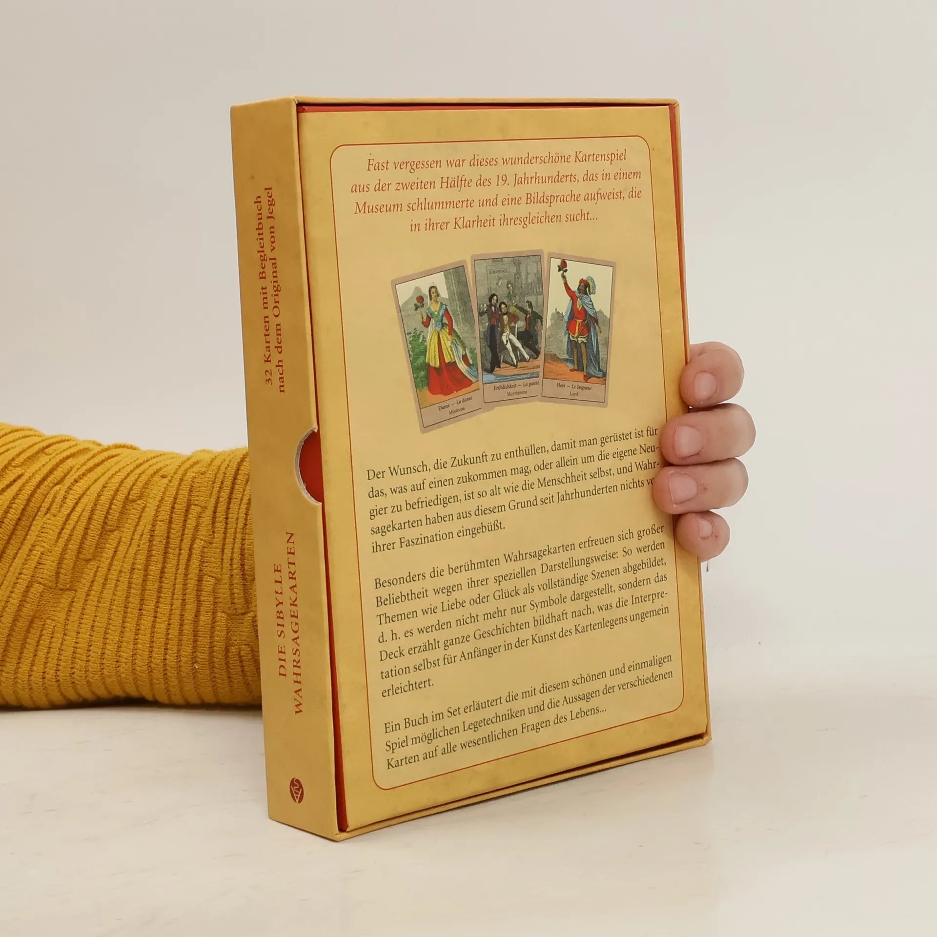 Fast vergessen war dieses wunderschöne Kartenspiel aus der zweiten Hälfte des 19. Jahrhunderts, das in einem Museum schlummerte und eine Bildsprache aufweist, die in ihrer Formsprache ihresgleichen sucht… Der Wunsch, die Zukunft zu enthüllen, ist so alt wie die Menschheit selbst, und Wahrsagekarten haben aus diesem Grund seit Jahrhunderten nichts von ihrer Faszination verloren. Das Besondere an diesen 32 Karten, die wir als Original-Reprint wieder aufleben lassen haben, ist ihre spezielle Darstellungsweise: So werden Themen wie Liebe oder Glück als vollständige Szenen abgebildet, d. h. es werden nicht mehr nur Symbole dargestellt, sondern das Deck erzählt ganze Geschichten bildhaft nach, was die Interpretation ungemein erleichtert. Ein Buch im Set erläutert die mit diesem schönen und einmaligen Spiel möglichen Legetechniken und die Aussagen der verschiedenen Karten auf alle wesentlichen Fragen des Lebens.
