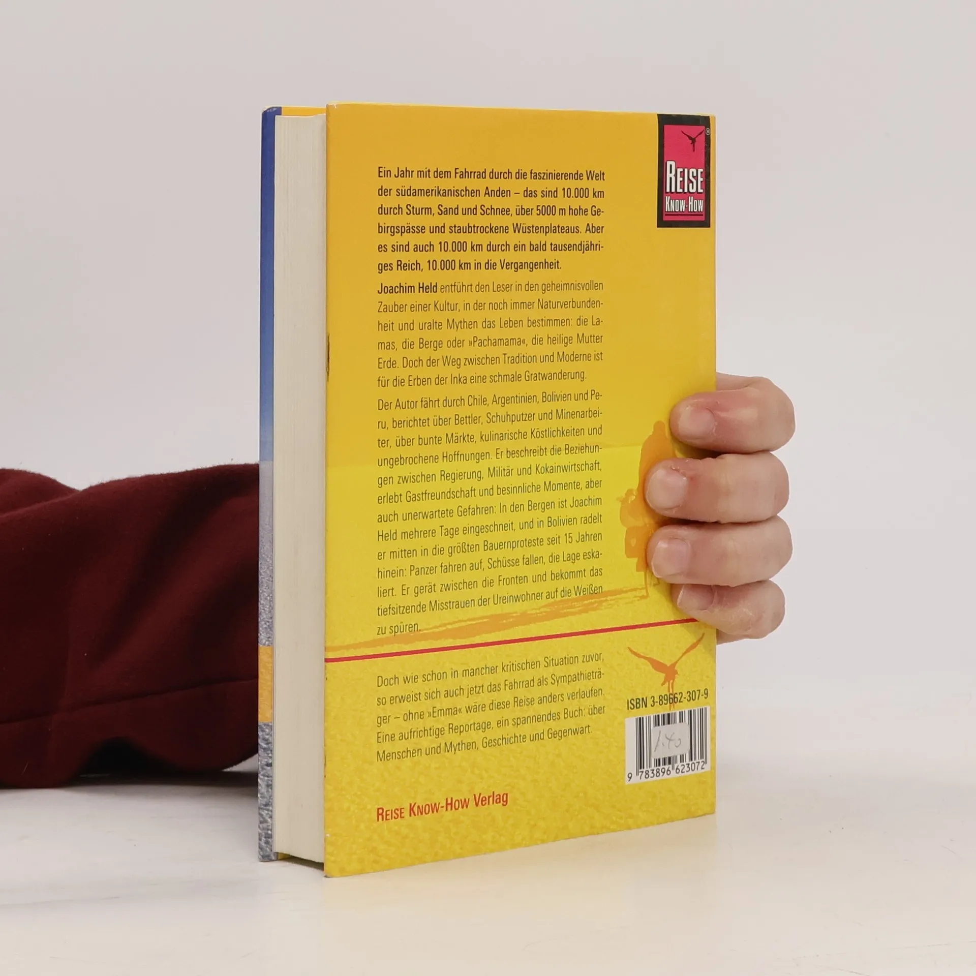 Ein Jahr mit dem Fahrrad durch die faszinierende Welt der südamerikanischen Anden zwischen Chile und Peru – das sind 10.000 km durch Sturm, Sand und Schnee, über 5000 m hohe Gebirgspässe und staubtrockene Wüstenplateaus. Aber es sind auch 10.000 km durch ein tausendjähriges Reich, 10.000 packende Kilometer in die Vergangenheit. Joachim Held entführt den Leser in den geheimnisvollen Zauber einer Kultur, in der noch immer Naturverbundenheit und uralte Mythen das Leben bestimmen: die Llamas, die Berge oder „Pachamama“, die heilige Mutter Erde. Doch der Weg zwischen Tradition und Moderne ist eine schmale Gratwanderung. Er erlebt unerwartete Gastfreundschaft, aber er bekommt auch das tiefsitzende Misstrauen auf die Weißen zu spüren. All diese zahllosen Begegnungen verdichteten sich zu einem einfühlsamen, vielschichtigen Porträt mit zahllosen historischen und kulturellen Aspekten. Eine aufrichtige Reportage, ein fesselndes Buch.