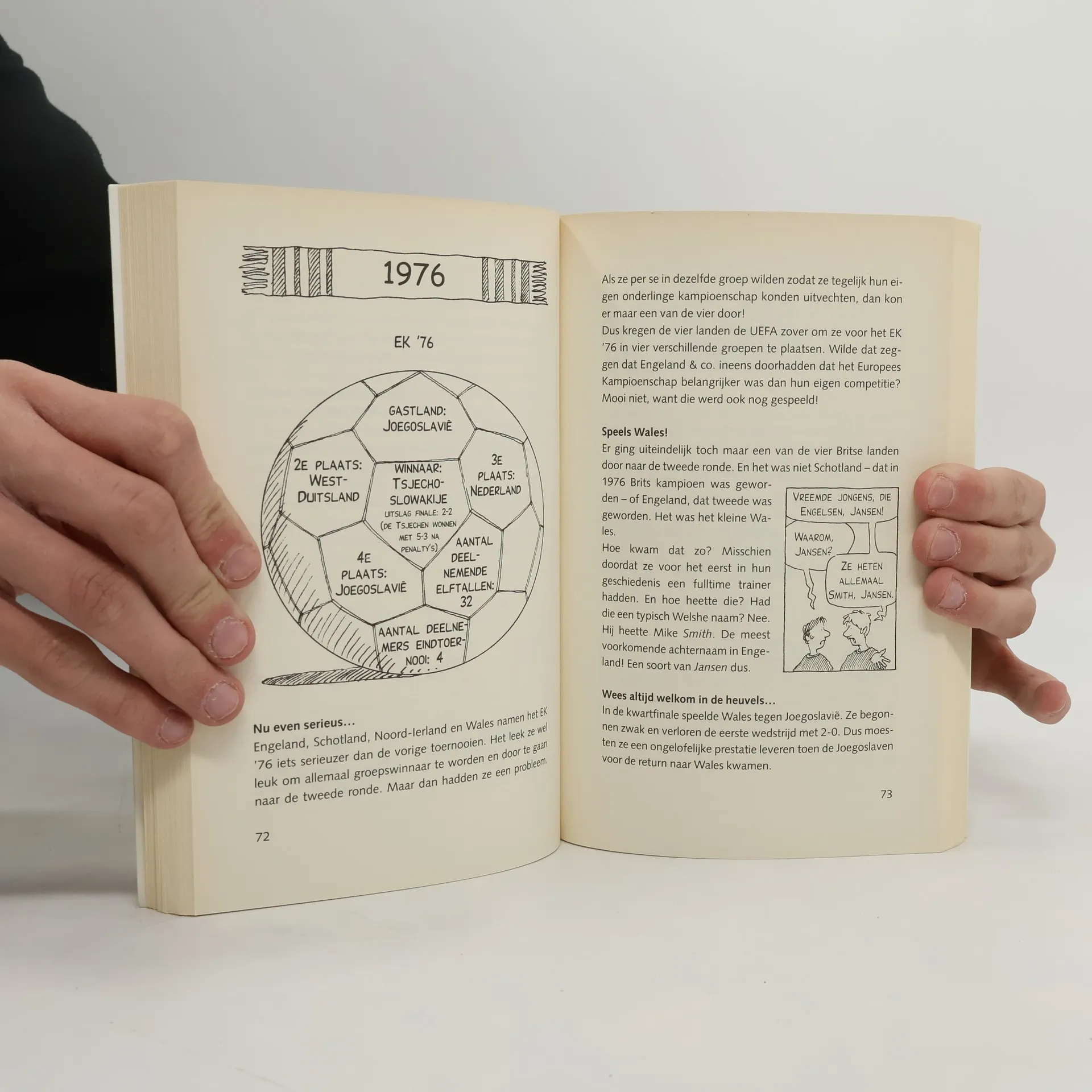 Op humoristische wijze wordt informatie gegeven over de geschiedenis van het Europese Kampioenschap voetbal. Met vrolijke zwartwitte tekeningen. Vanaf ca. 11 jaar.