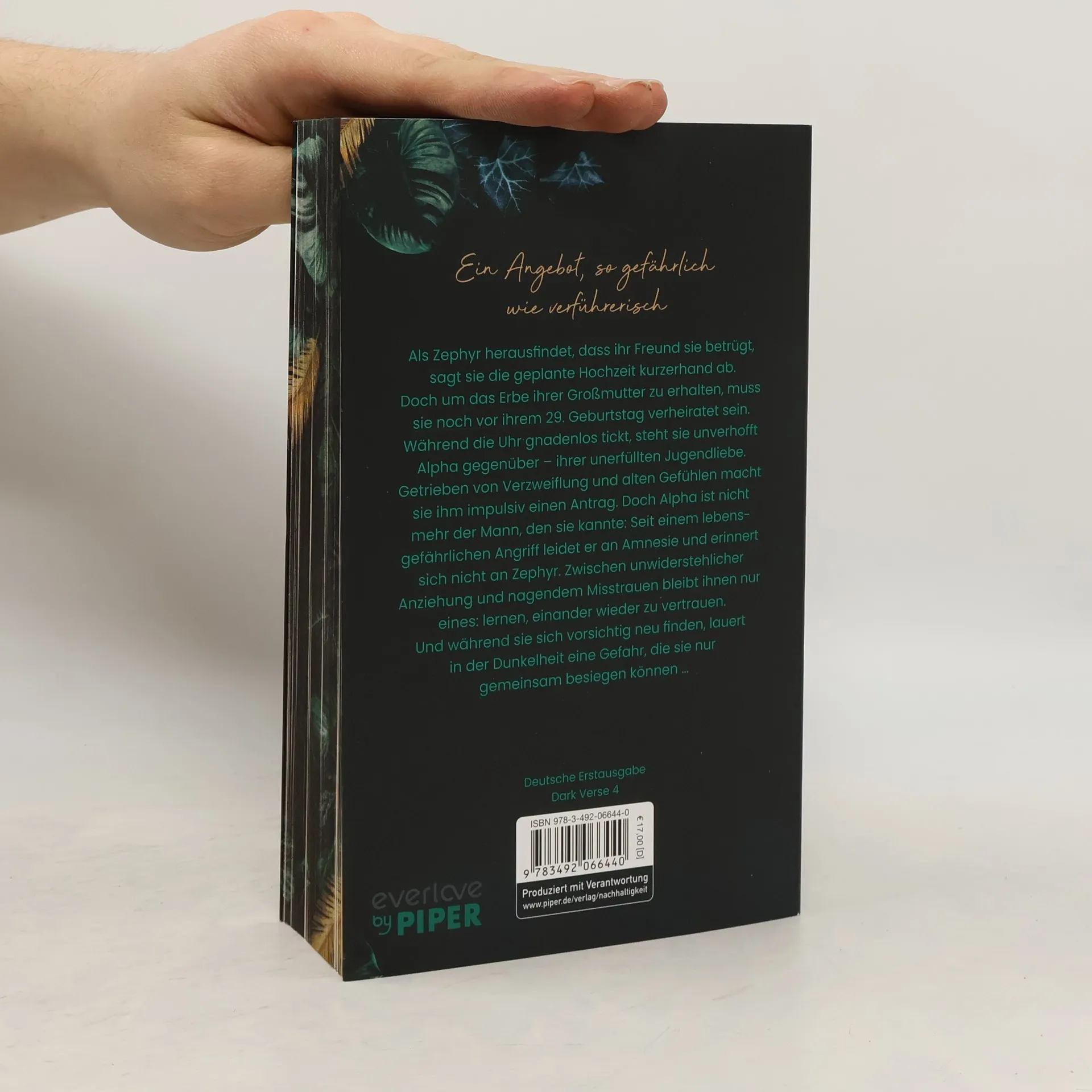 <strong>Sie macht ihm ein Angebot, das er nicht ablehnen kann</strong> Als <strong>Zephyr </strong>herausfindet, dass ihr Freund sie betrügt, sagt sie kurzerhand die geplante Hochzeit ab. Allerdings muss sie vor ihrem 29. Geburtstag verheiratet sein, um das Erbe ihrer Großmutter zu erhalten, und Zephyr braucht das Geld! Unverhofft begegnet sie <strong>Alpha</strong>, ihrer Jugendliebe, und macht ihm kurzerhand einen Antrag. Doch Alpha leidet seit einem lebensgefährlichen Angriff vor einigen Jahren an Amnesie und kann sich nicht mehr an Zephyr erinnern ... Während Alpha und Zephyr versuchen, zueinander zu finden, lauert im Dunklen eine Gefahr, der sie sich nur zusammen stellen können. Die Dark Verse-Reihe bei everlove: Band 1: The Predator - Du bist sein Geheimnis Band 2: The Reaper - Du bist sein Untergang Band 3: The Emperor - Du bist sein Schicksal Band 4: The Finisher - Du bist sein Verhängnis <strong>Achtung! </strong> Die Romane der Dark Verse-Reihe bauen aufeinander auf. Bitte achte darauf, die Bücher in ihrer vorgegebenen Reihenfolge zu lesen.