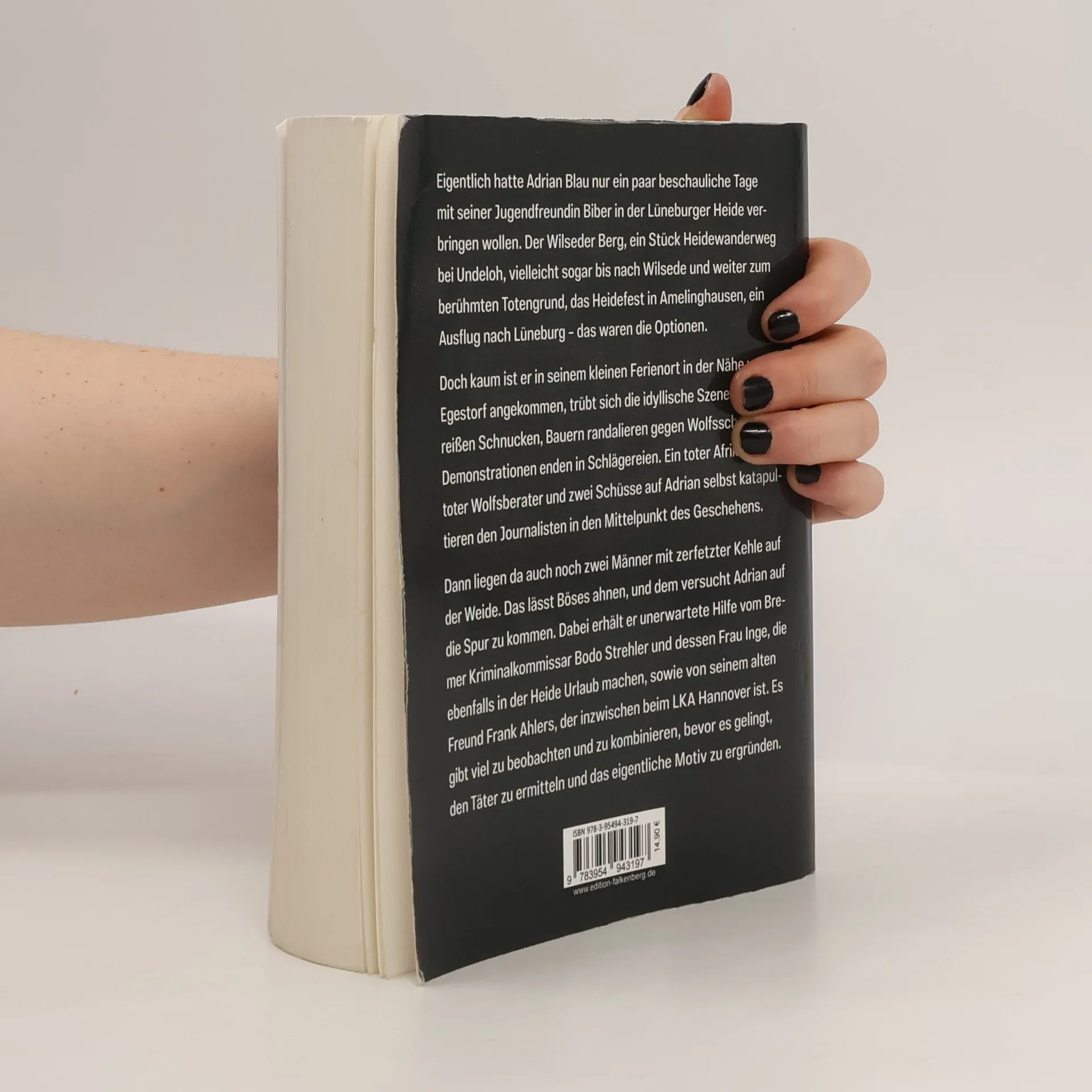 Eigentlich hatte Adrian Blau nur ein paar beschauliche Tage mit seiner Jugendfreundin Biber in der Lüneburger Heide verbringen wollen. Der Wilseder Berg, ein Stück Heidewanderweg bei Undeloh, vielleicht sogar bis nach Wilsede und weiter zum berühmten Totengrund, das Heidefest in Amelinghausen, ein Ausflug nach Lüneburg – das waren die Optionen. Doch kaum ist er in seinem kleinen Ferienort in der Nähe von Egestorf angekommen, trübt sich die idyllische Szenerie: Wölfe reißen Schnucken, Bauern randalieren gegen Wolfsschützer, Demonstrationen enden in Schlägereien. Ein toter Afrikaner, ein toter Wolfsberater und zwei Schüsse auf Adrian selbst katapultieren den Journalisten in den Mittelpunkt des Geschehens. Dann liegen da auch noch zwei Männer mit zerfetzter Kehle auf der Weide. Das lässt Böses ahnen, und dem versucht Adrian auf die Spur zu kommen. Dabei erhält er unerwartete Hilfe vom Bremer Kriminalkommissar Bodo Strehler und dessen Frau Inge, die ebenfalls in der Heide Urlaub machen, sowie von seinem alten Freund Frank Ahlers, der inzwischen beim LKA Hannover ist. Es gibt viel zu beobachten und zu kombinieren, bevor es gelingt, den Täter zu ermitteln und das eigentliche Motiv zu ergründen.