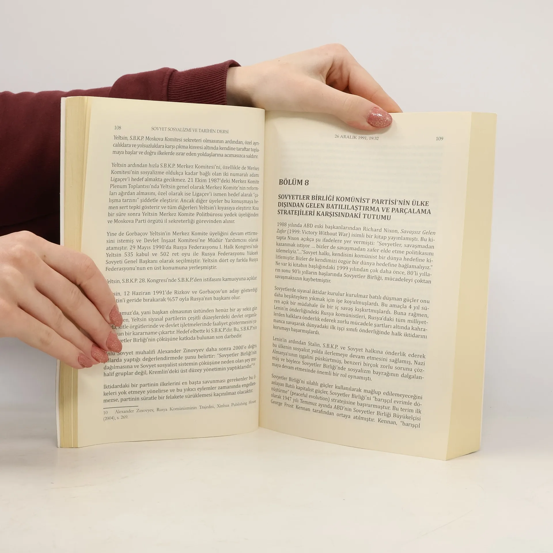 Cin'in sosyalizmin tarihi uzerine en onemli arastirmacilarindan olan Li Shenming'in bu iki ciltlik eseri dunyanin ilk sosyalist devleti Sovyetler ve 93 yillik parlak bir komunist partisinin neden dagildigini incelemektedir. Kitabin 1.cildi Cinli arastirmacilarin arastirmalarini sunmaktadir. Ikinci cilt ise basta Rusya olmak uzere Cin ve dunyadaki diger arastirmacilarin goruslerini icermektedir. Suphesiz bu incelemenin amaci dunya sosyalist akiminin bu buyuk olaydan cikarabilecegi derslerle ilgilidir. Boylece kitap dunya sosyalizminin tarihini incelemek ve tartismak isteyenler ve Rus Marksistlerin de goruslerini incelemek icin cok zengin veriler sunmaktadir. Kitap ayni zamanda bugunku Rusya toplumundaki durumu ve Sovyet tarihinin nasil degerlendirildigi uzerinde durmaktadir. Bugun Rus aydinlarinin bu tarih uzerine dusunceleri buyuk degisim gostermektedir. Kitap ozellikle, Gorbacov, Yeltsin ve Putin donemi arasindaki farkliliklari incelemekte, Putin yonetiminin, ABD ve NATO'dan gelen teh