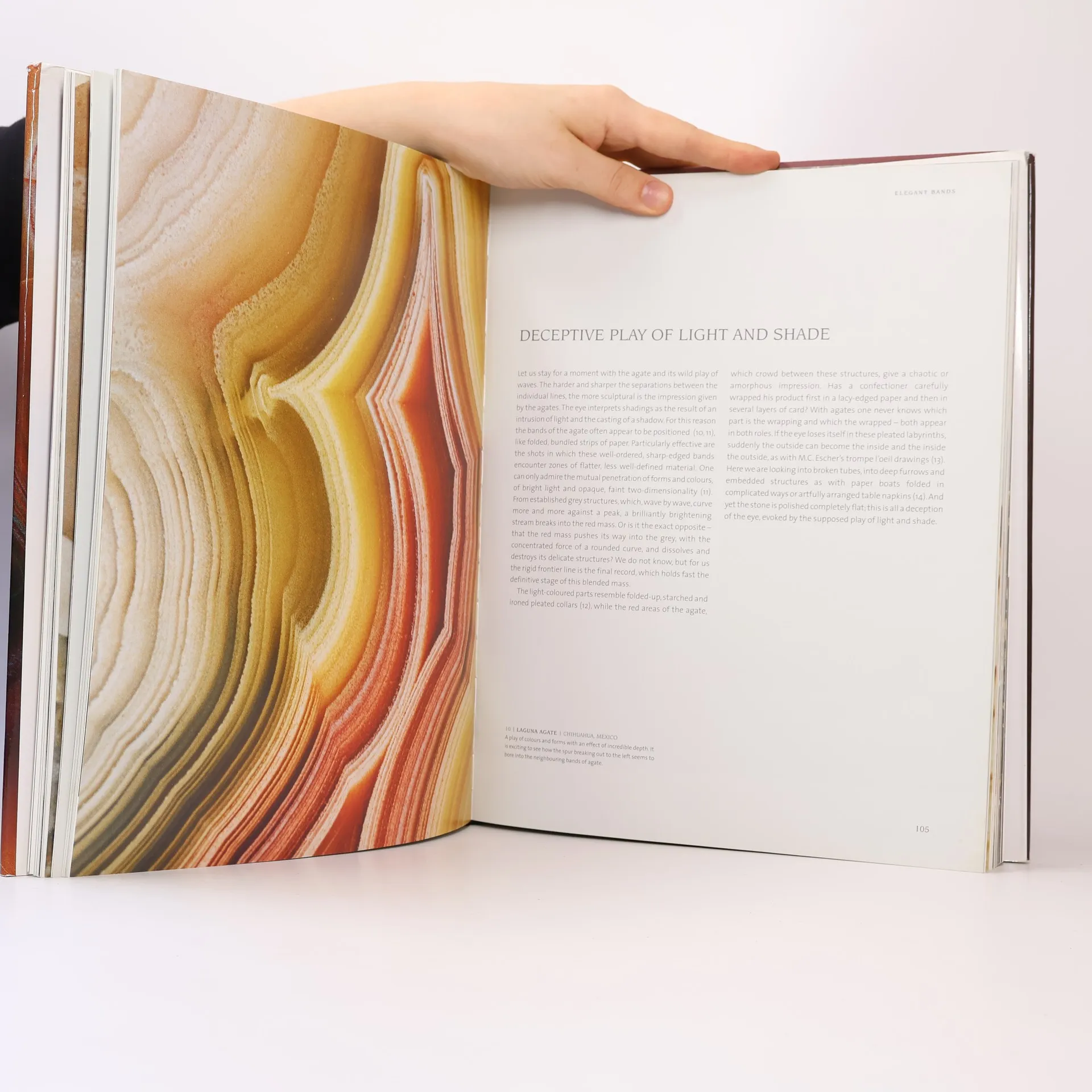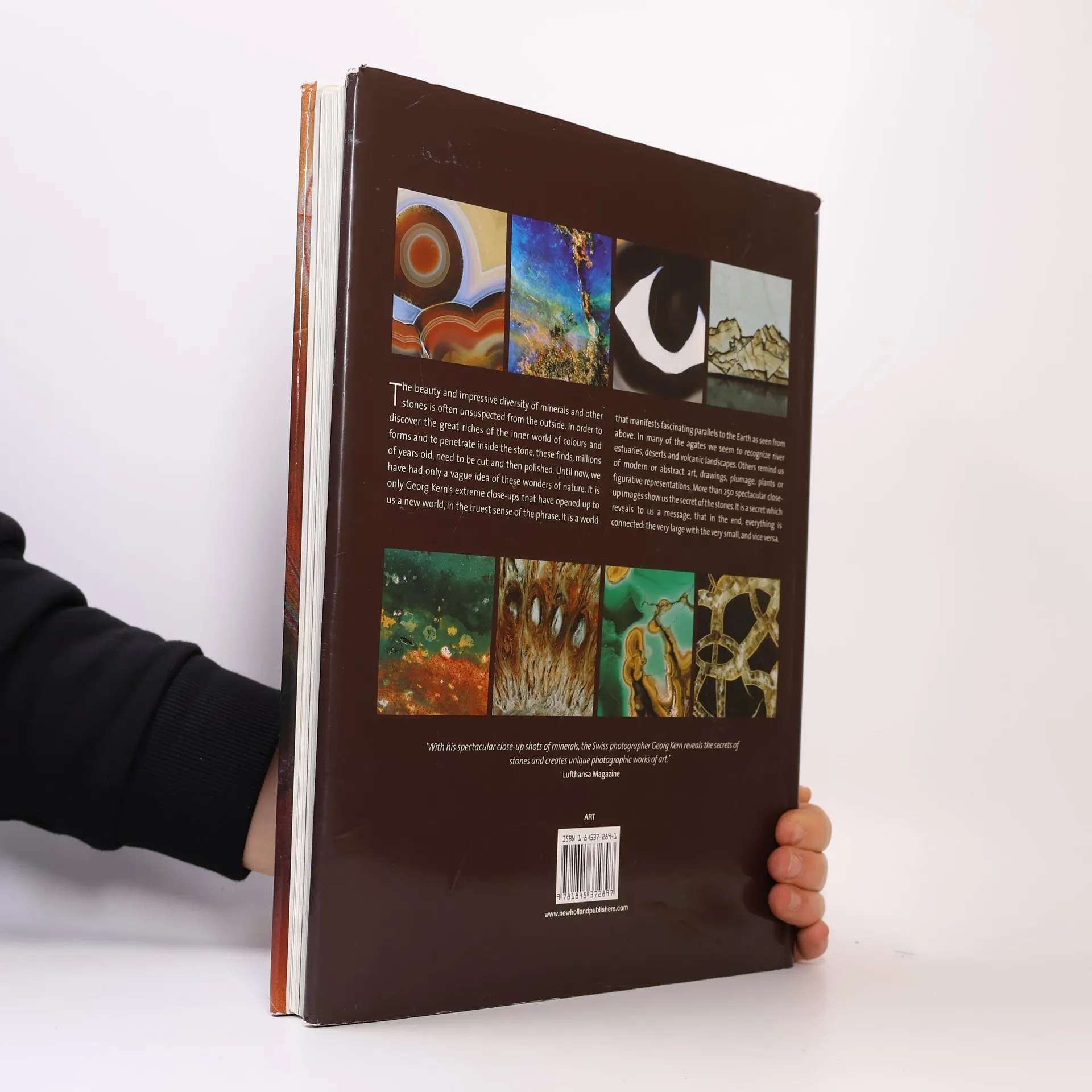 The beauty and impressive diversity of minerals and many other stones is often unsuspected from the outside. In order to discover the great riches of the world of colours and forms and to penetrate inside the stone, these finds, millions of years old, must be cut and then polished. Georg Kern's large collection of minerals includes some particularly fine crystallized pieces. Two years ago, by chance, he discovered under the stereomicroscope the diversity and beauty of colour of cut and polished minerals. Since then he has been photographing them in full sunlight, using a Nikon F-100 and a 105 close-up lens. Georg Kern's extreme close-ups have opened up to us a new world. It is a world that manifests fascinating parallels to the Earth as seen from above. In many agates we seem to recognize river estuaries, deserts and volcanic landscapes. Others remind us of modern or abstract art, of drawings of plumage, of plants or figurative representations. Quite simply, the very large is contained in the very small, and vice versa. An immense world of colours and forms emerges from these images, which can now be seen for the first time in all their diversity.