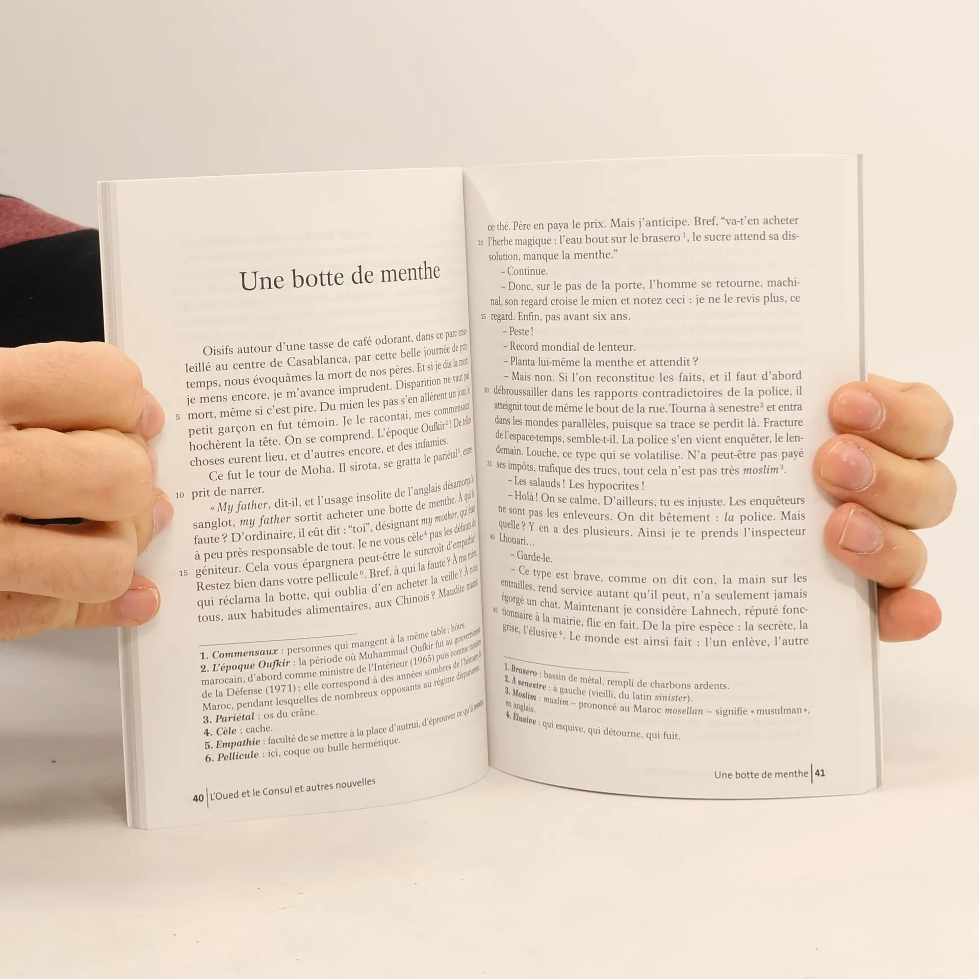 L'Oued et le Consul ¤ Nos pendus ne sont pas les leurs ¤ Une botte de menthe ¤ Le tyran et le poète ¤ Tu n'as rien compris à Hassan II ¤ Khadija aux cheveux noirs ¤ Stridences et ululations ¤ Un peu de terre marocaine ¤ Jay ou l'invention de Dieu ¤ Des yeux pour ne plus voirLe consul de Finlande décide de montrer le Grand Sud à sa femme. Ils s'en vont sur les routes, "elle, la belle dame à l'écharpe, Isadora réincarnée, lui, l'aventurier au long cours, l'intraitable des Traités", "riant en finlandais, et disant de belles choses, mais un peu méprisantes, un peu condescendantes" sur les Marocains. Ils arrivent bientôt au bord d'un oued. Sourds aux mises en garde des Berbères, ils s'engagent dans la tranchée asséchée... Une vague surgit alors, qui met fin pour toujours "au bel allant du consul et de sa femme" ! Écrivain marocain pétri de culture occidentale, Fouad Laroui joue avec les mots et, à la manière d'un conteur sur la place publique, évoque le Maroc de son enfance. Des récits qu'illuminent un humour impitoyable et un sens aigu de la satire.