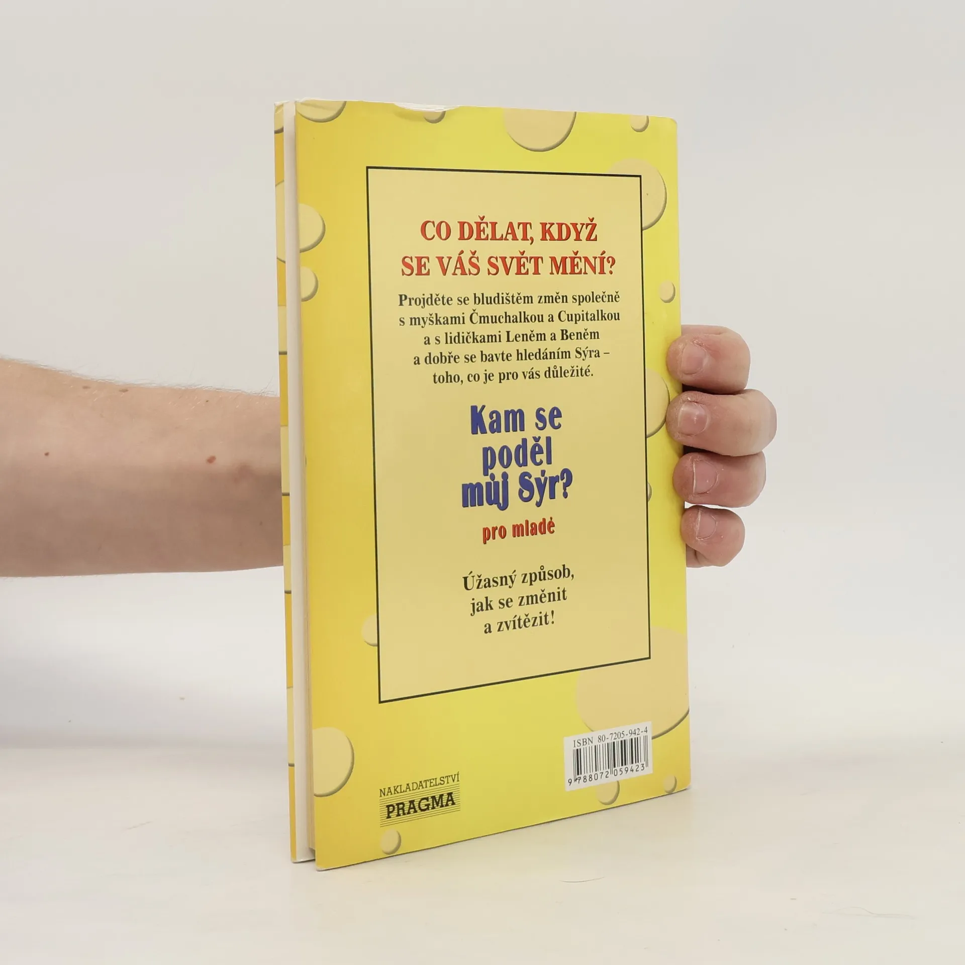 Úžasný způsob, jak se změnit a zvítězit! Kam se poděl můj Sýr? je podobenství, které odhaluje hluboké pravdy o změně. Je to zábavný a poučný příběh o čtyřech zajímavých postavičkách, které žijí v "Bludišti", kde hledají "Sýr", který je živí a zároveň jim přináší štěstí. Čtyři postavičky Čmuchalka, Cupitalka, Leňo a Beňo se chovají stejně jako lidé. Sýr je metaforou toho, co v životě chceme, ať už je to zaměstnání, partnerský vztah, peníze, dům, svoboda, dobré zdraví, společenské uznání nebo duševní vyrovnanost. Bludiště je místo, kde hledáme to, co chceme - organizace, pro kterou pracujeme, rodina nebo společnost, ve které žijeme. Postavičky v příběhu čelí náhlé změně. Jedna z nich, která se nakonec vyrovná se změnou úspěšně, napíše na zeď bludiště, co se naučila. Až uvidíte nápis na zdi, naučíte se přistupovat ke změnám novým způsobem, jenž zmírní stres ve vašem životě a přinese Vám znovunalezené štěstí. Příběh je určený pro všechny věkové skupiny. Můžete jej přečíst za hodinu, ale jeho hluboká moudrost Vám zůstane na celý život.