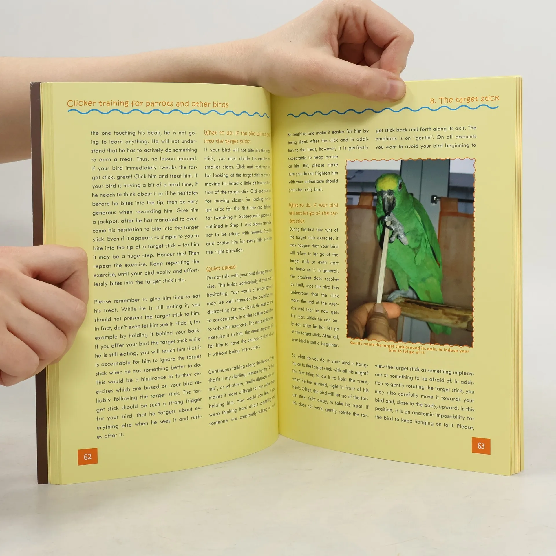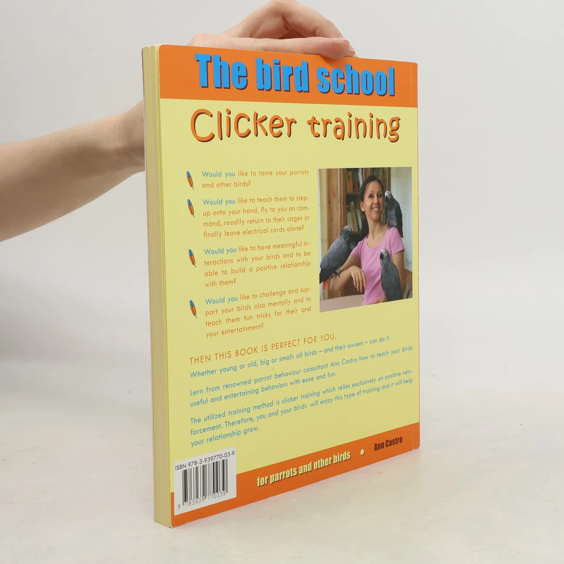 Clicker Training for Parrots and Other Birds is a book for beginners. It shows you how to clicker train with your birds. You will learn how to teach your parrots basic obedience, but also just for fun exercises. Clicker training is entertaining for birds and owners and enhances the bird-human relationship.Topics covered Up, Down, Come, Let Go, Leave It, Go Away, Relaxation Exercises, Obstacle Course, Turning in a Circle, Loop de Loop, Nodding, Wiggling the Tail, How to Tame a Bird