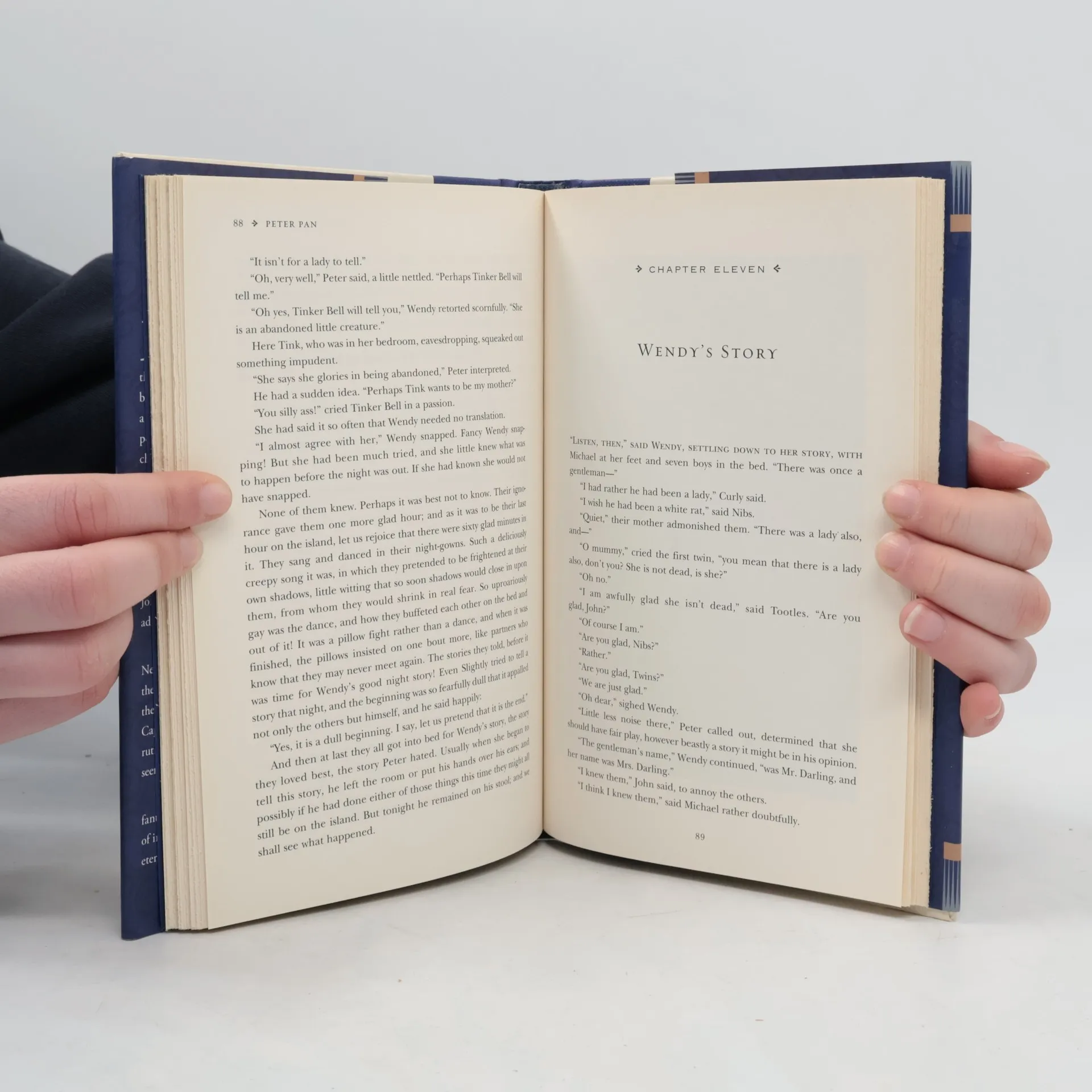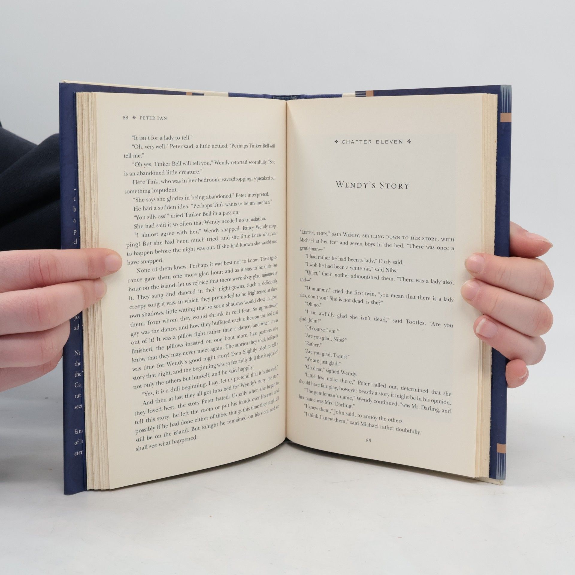 Peter Pan by J. M. Barrie Peter Pan, the mischievous boy who refuses to grow up, lands in the Darling's proper middle-class home to look for his shadow. He befriends Wendy, John and Michael and teaches them to fly (with a little help from fairy dust). He and Tinker Bell whisk them off to Never-land where they encounter the Red Indians, the Little Lost Boys, pirates and the dastardly Captain Hook.