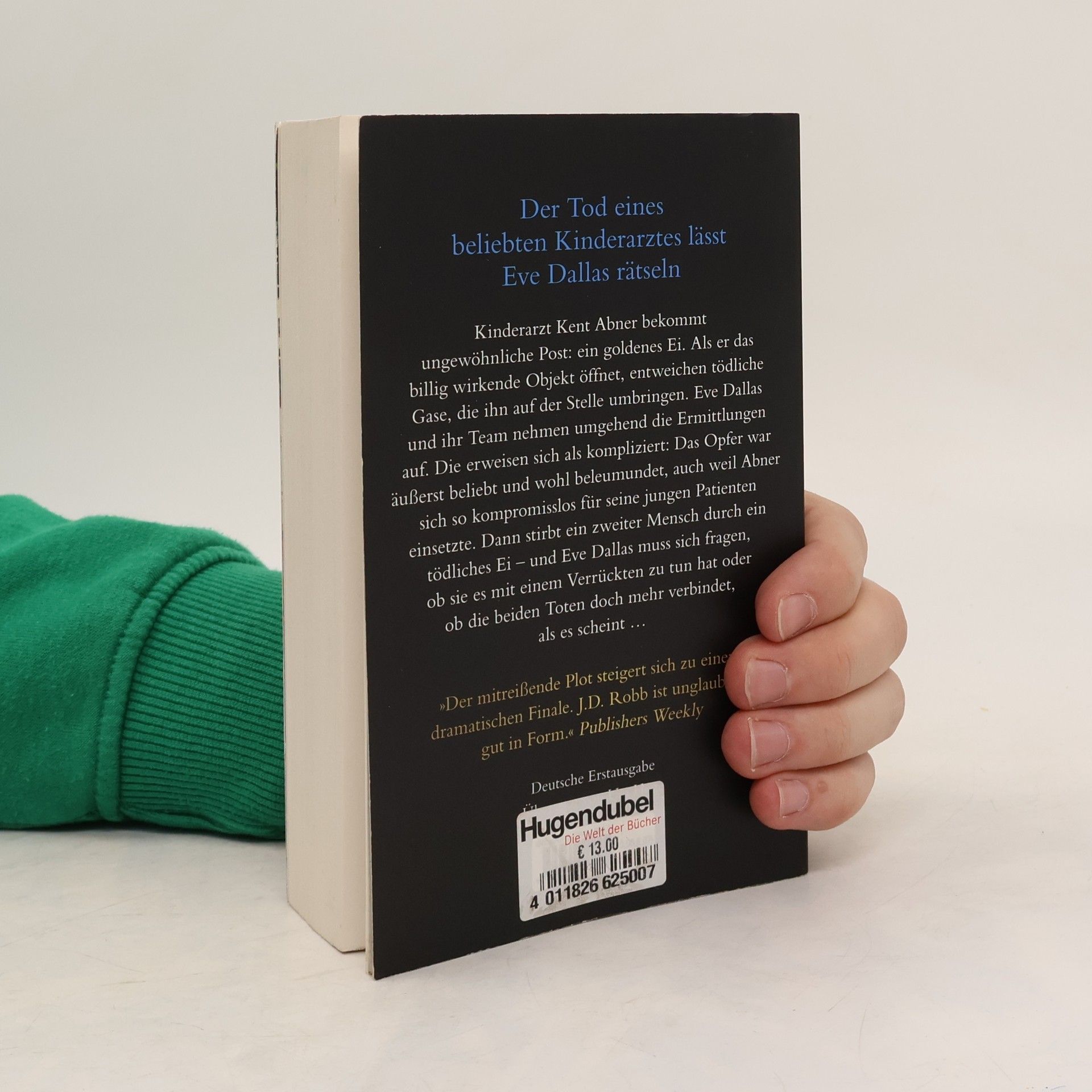 Der Tod eines beliebten Kinderarztes lässt Eve Dallas rätseln – der neue Pageturner von Bestsellerautorin J.D. Robb! Kinderarzt Kent Abner bekommt ungewöhnliche Post: ein goldenes Ei. Als er das billig wirkende Objekt öffnet, entweichen tödliche Gase, die ihn auf der Stelle umbringen. Eve Dallas und ihr Team nehmen umgehend die Ermittlungen auf. Die erweisen sich als kompliziert: Das Opfer war äußerst beliebt und wohl beleumundet, auch weil er sich so kompromisslos für seine jungen Patienten einsetzte. Dann stirbt ein zweiter Mensch durch ein tödliches Ei – und Eve Dallas muss sich fragen, ob sie es mit einem Verrückten zu tun hat oder ob die beiden Toten doch mehr verbindet, als es scheint … Eve Dallas überzeugt in jedem Fall! Lesen Sie auch die spannenden Sammelbände »Mörderlied«, »Mörderstunde« und »Mörderspiele« aus der Feder von SPIEGEL-Bestsellerautorin J.D. Robb.