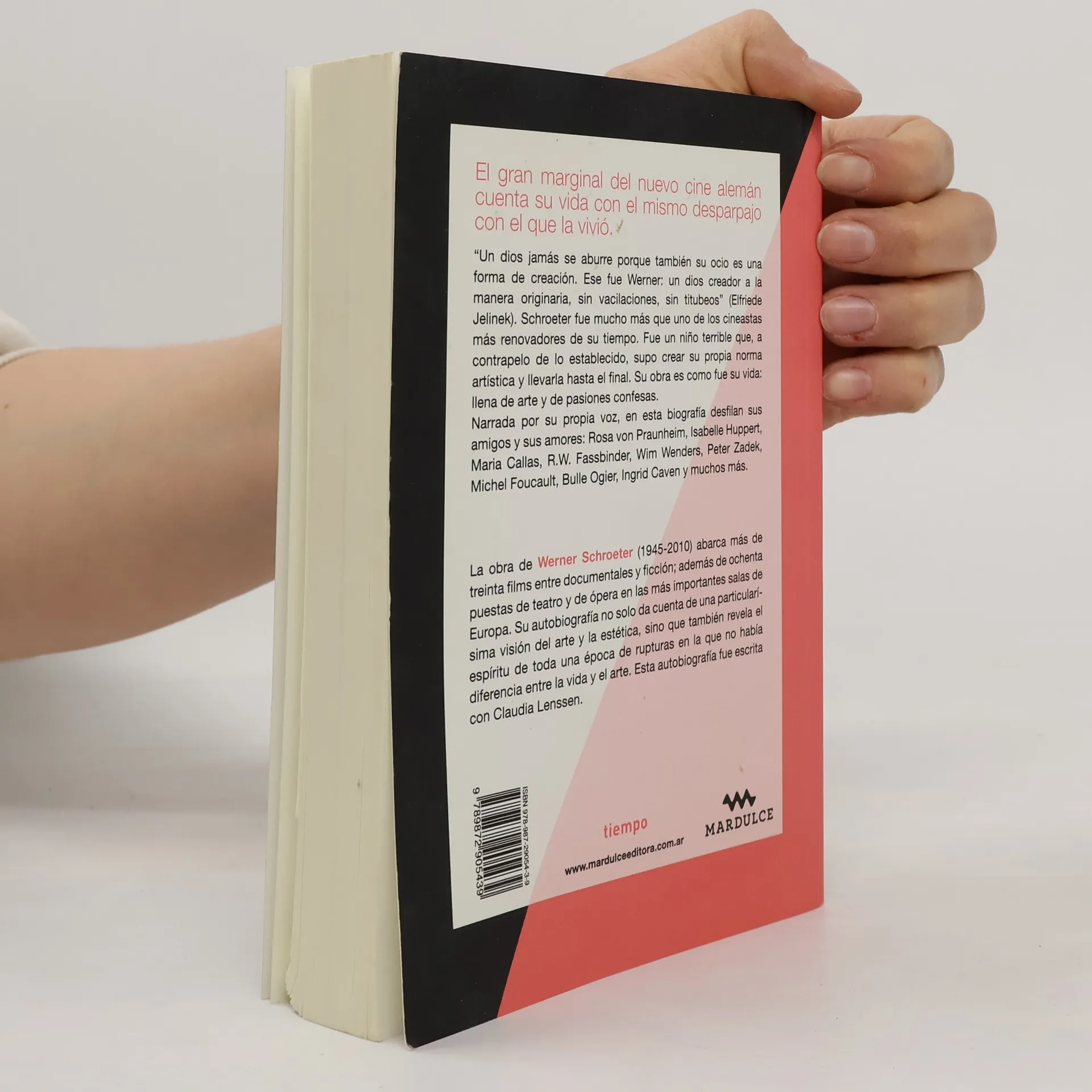 Schroeter fue mucho más que uno de los cineastas más renovadores de su tiempo. Fue un niño terrible que, a contrapelo de lo establecido, supo crear su propia norma artística y llevarla hasta el final. Su obra es como fue su vida: llena de arte y de pasiones confesas. Narrada por su propia voz, en esta biografía desfilan sus amigos y sus amores: Rosa von Praunheim, Isabelle Huppert, Maria Callas, R.W. Fassbinder, Wim Wenders, Peter Zadek, Michel Foucault, Bulle Ogier, Ingrid Caven y muchos más.“Un dios jamás se aburre porque también su ocio es una forma de creación. Ese fue Werner: un dios creador a la manera originaria, sin vacilaciones, sin titubeos” Elfriede Jelinek.